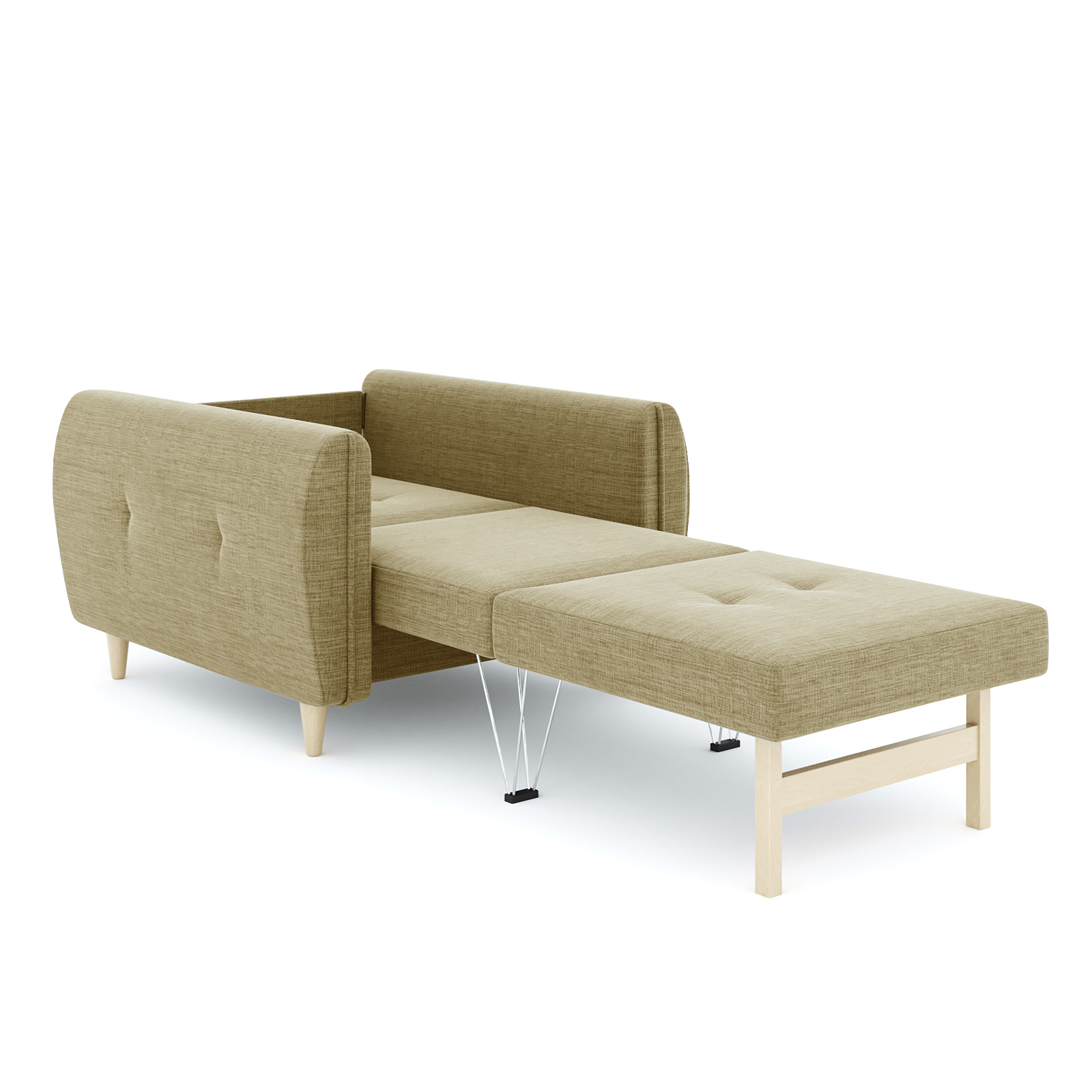 Кресло-кровать для отдыха. Каркас ДСП, ДВП, ЛДСП, фанера, брус хвойных пород. Спальное место 1900х600мм. Наполнение высокоэластичный ППУ. Наполнение подушки-крошка ППУ. Высота сиденья от пола 440мм. Глубина сиденья без подушки 600мм. Опора массив березы. Высота опоры 100мм.