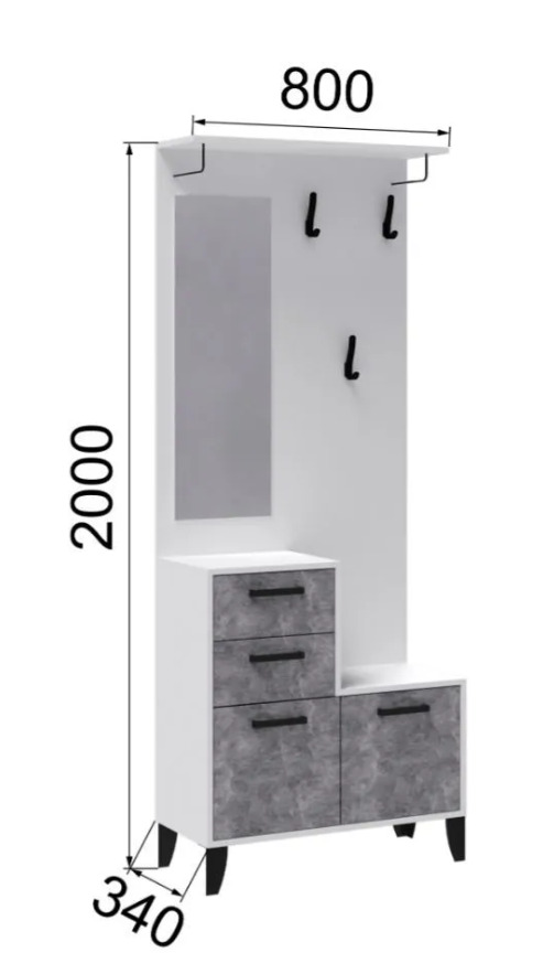 Секция может служить самостоятельной частью прихожей, но также и может быть дополнена 2х дверным шкафом.
