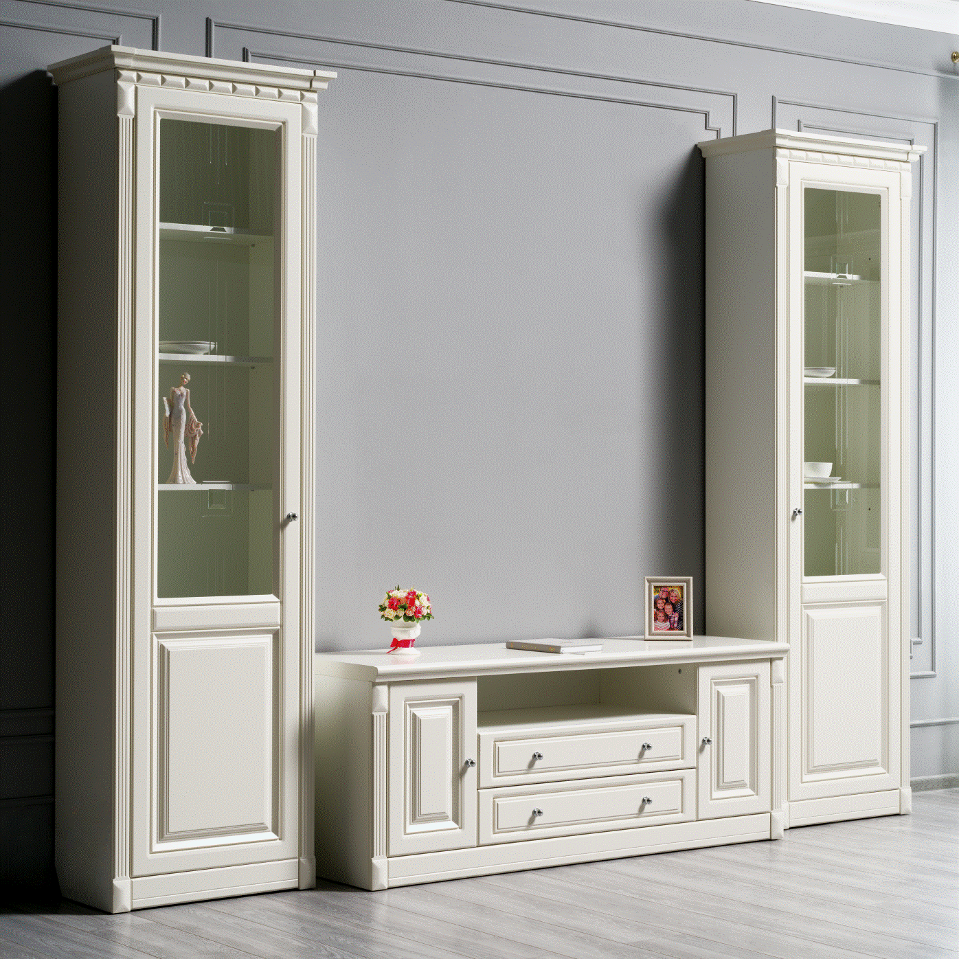 Мебель выполнена из МДФ с 3D-фрезеровкой, его отличают высокая прочность и долговечность, экологичность и безопасность. Две вариации шкафов – с глухим и стеклянным фасадом позволят как разместить книги, сувениры, так и скрыть то, что необходимо от посторонних глаз.
