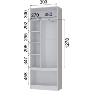 За верхними створками расположены полки и штанга, в нижней части шкафа расположена широкая ниша – полка.