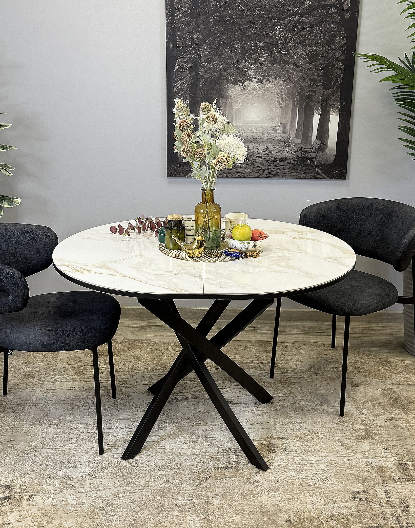 Стол сконструирован так, чтобы идеально подходить семье из трех-четырех человек. Керамическая столешница устойчива к воздействию различных домашних неприятностей. Благодаря керамической вставке есть возможность увеличивать размер стола при необходимости.