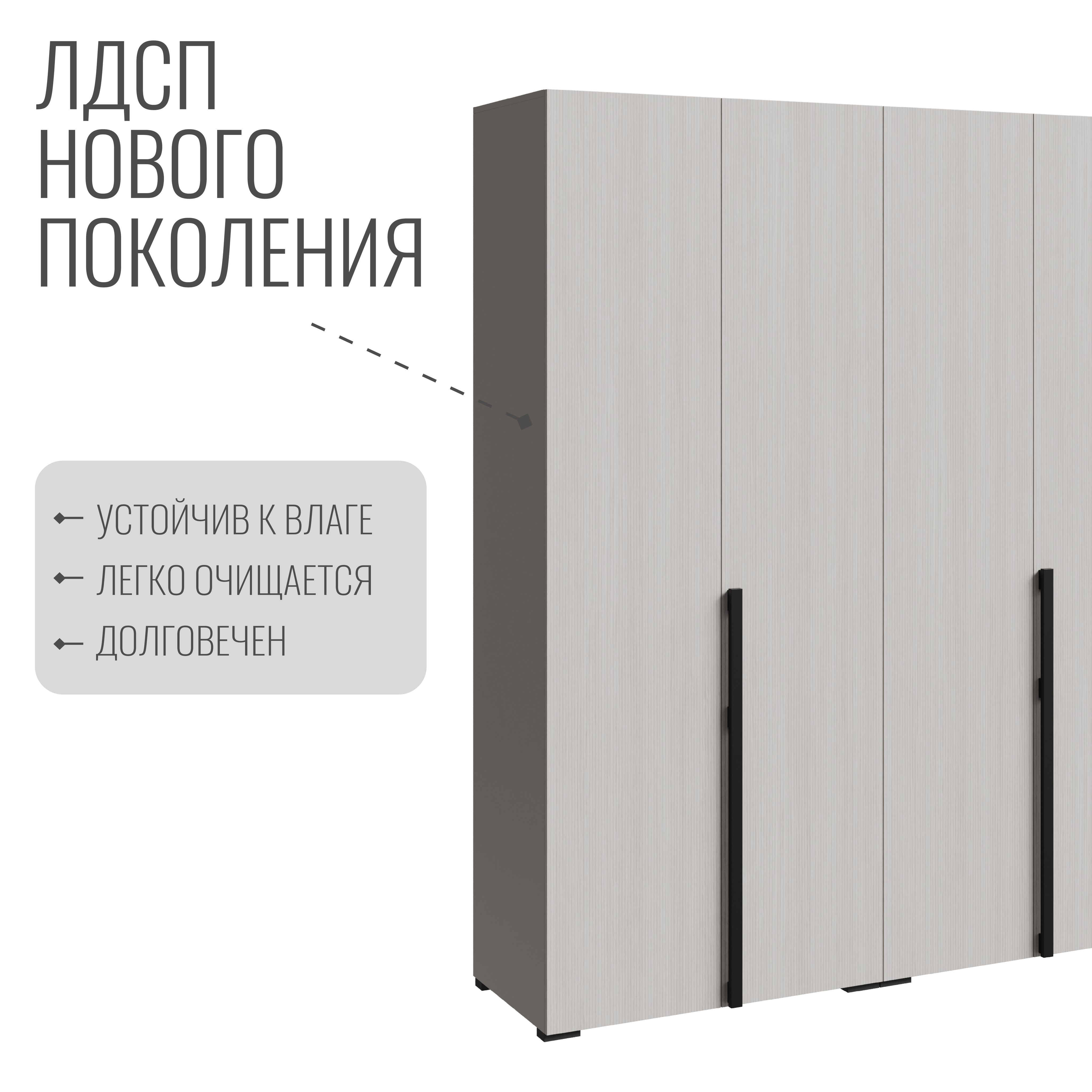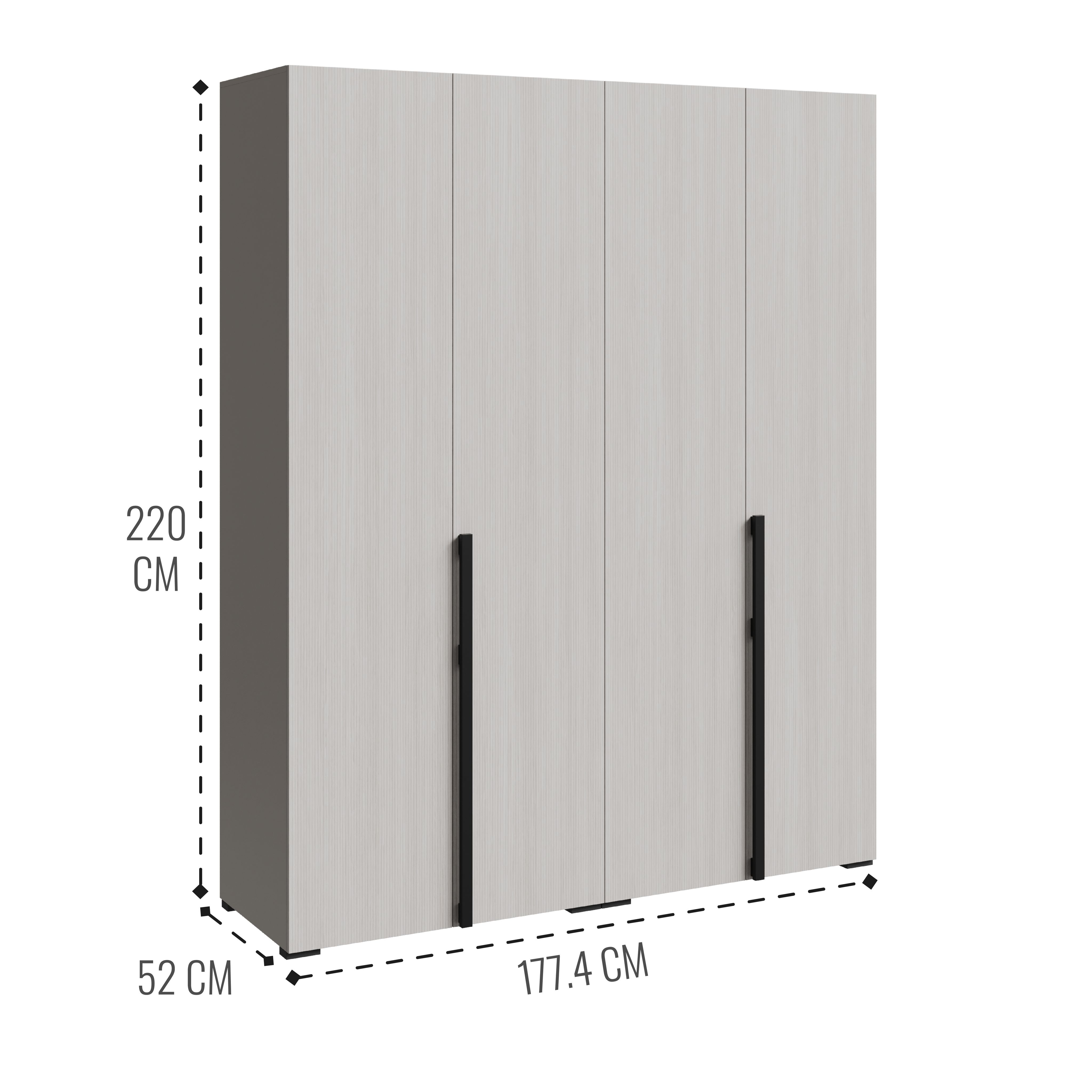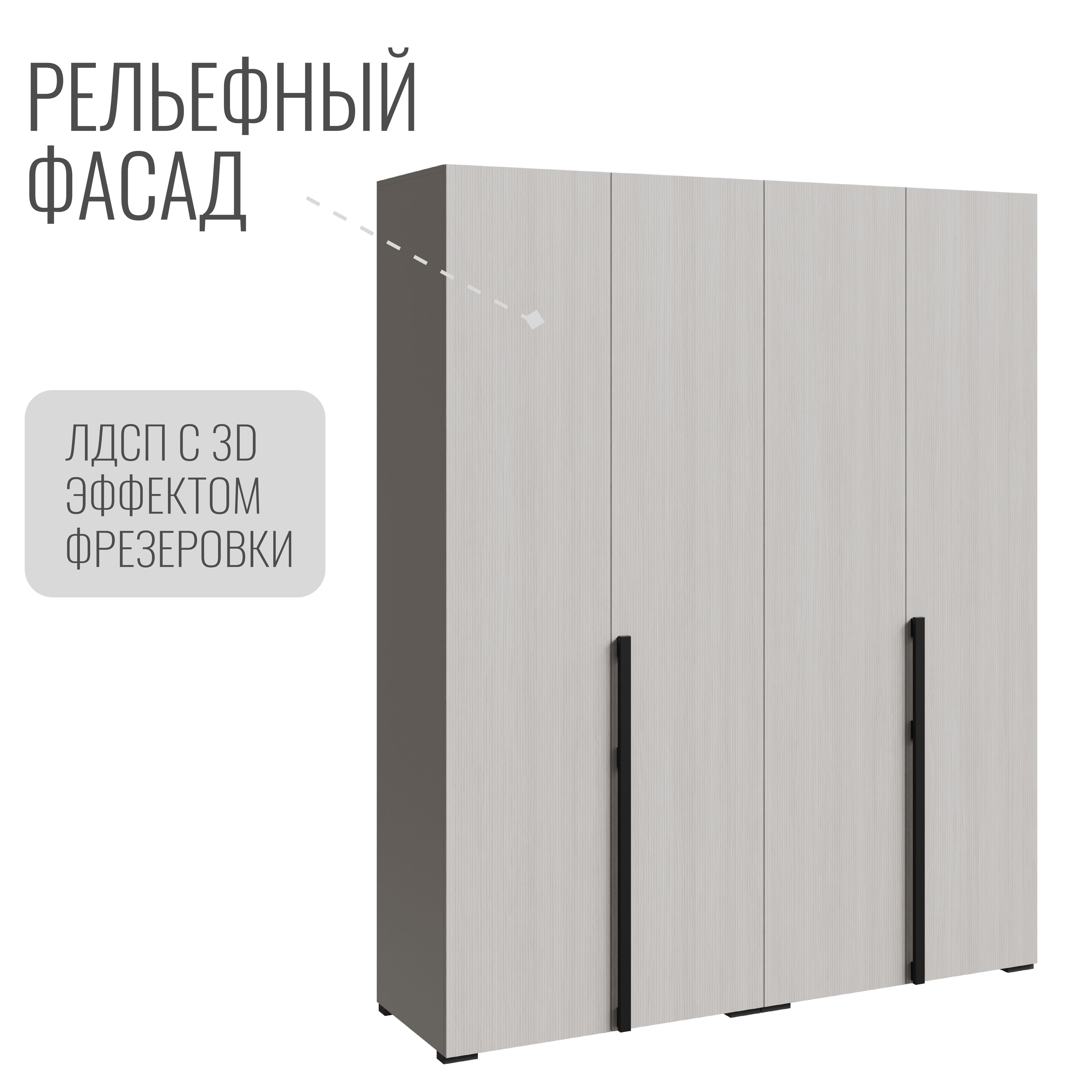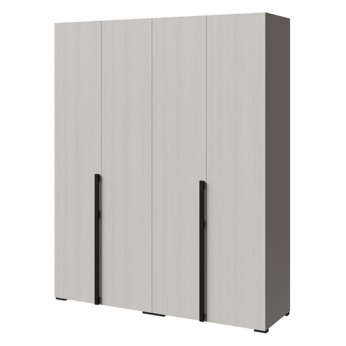 Шкаф в спальню — это идеальное решение для тех, кто ценит стиль, простоту и надежность. С четырьмя дверями и продуманным внутренним наполнением, он предлагает достаточно пространства для хранения одежды и аксессуаров. Вешалка и полки позволяют удобно организовать вещи, обеспечивая легкий доступ к ним.