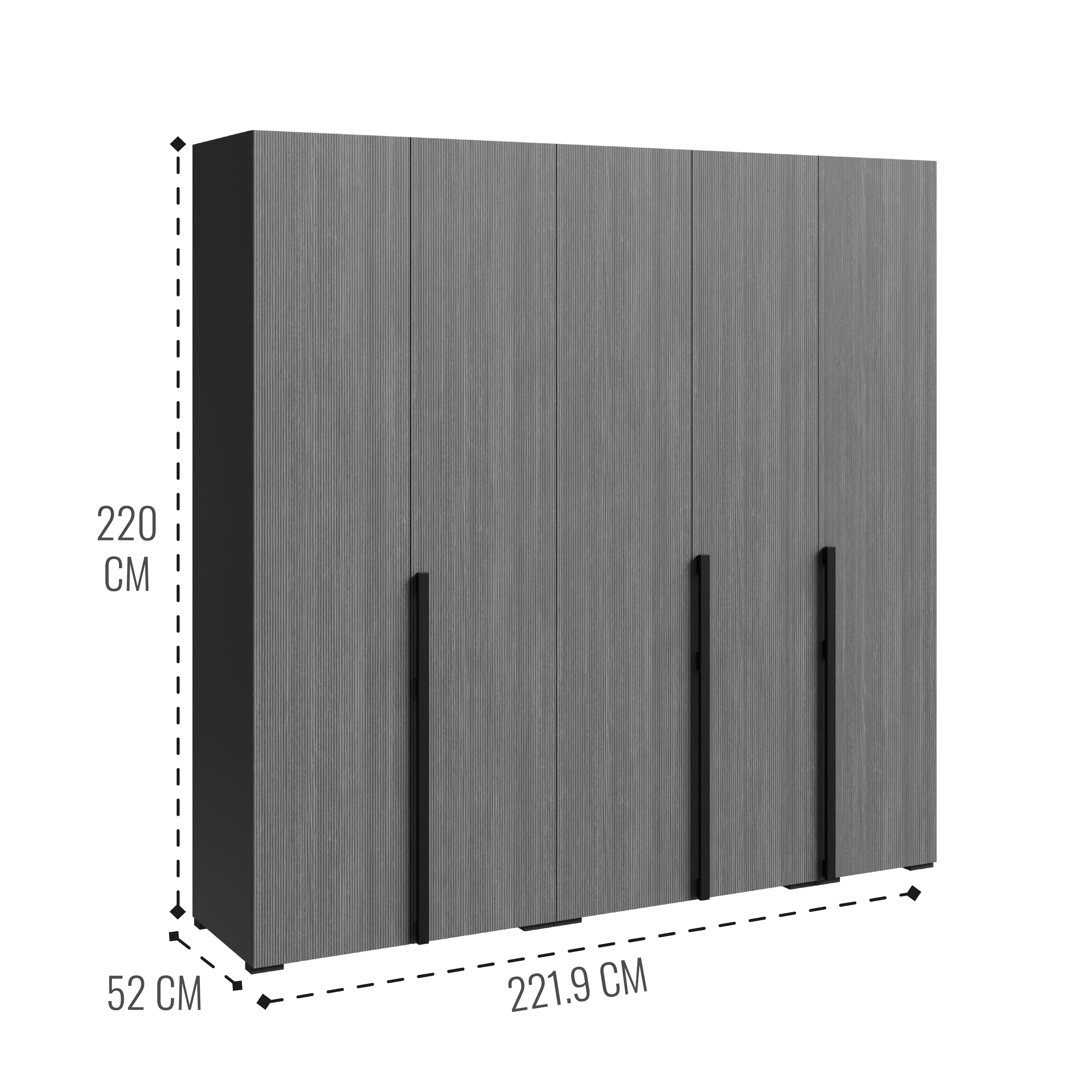 Этот 5-дверный шкаф отличается высоким качеством материалов и продуманным дизайном. Он не только вместителен, но и функционален: внутри вы найдете множество полок, которые позволят удобно организовать хранение одежды, обуви и аксессуаров. Кроме того, шкаф оснащен ящиками, в которых можно разместить мелкие вещи, такие как белье или украшения, что сделает ваш быт более комфортным.