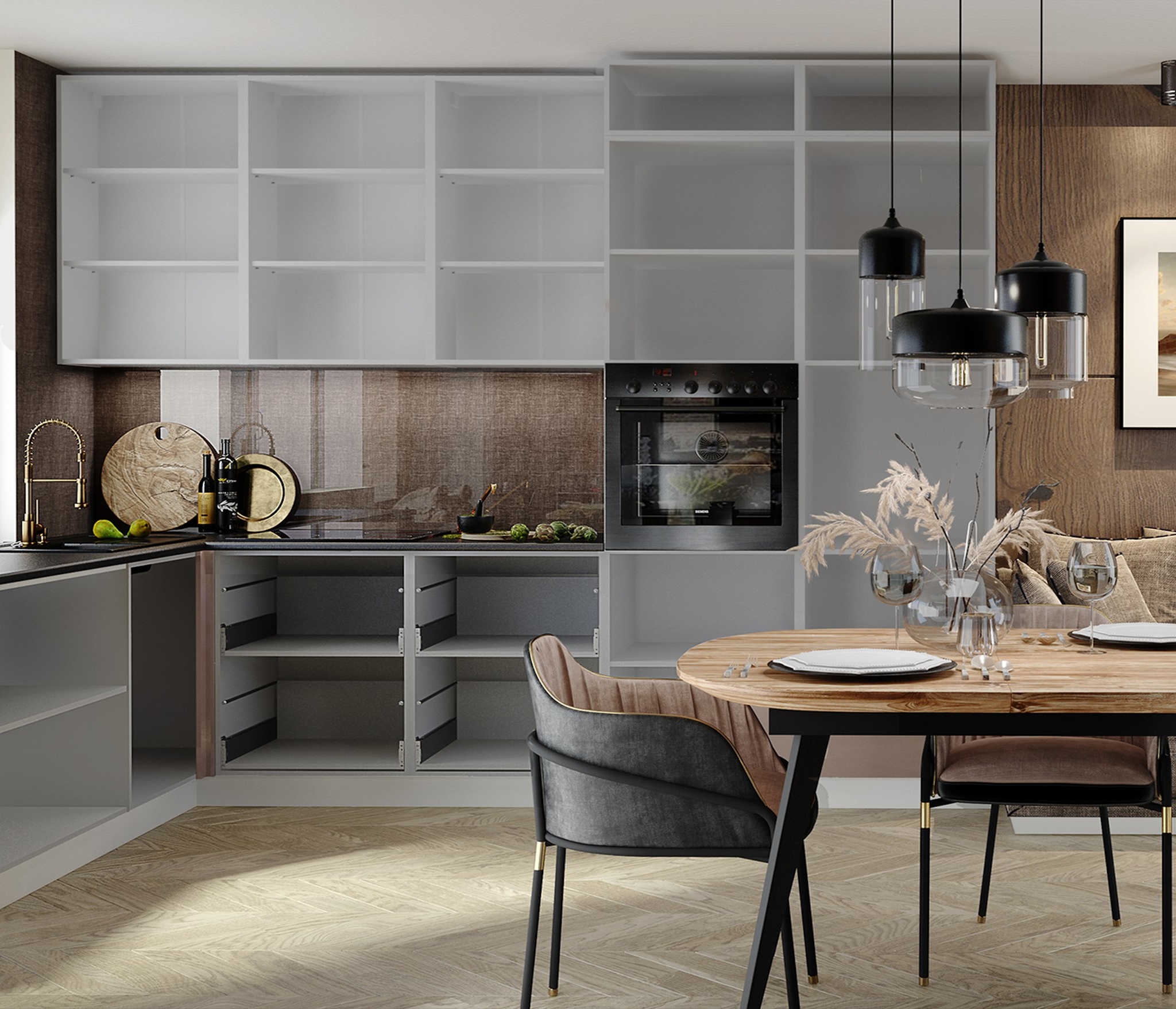 Корпус из 16 мм ЛДСП белого цвета создает прочную основу и гармонично сочетается с контрастной композицией фасадов