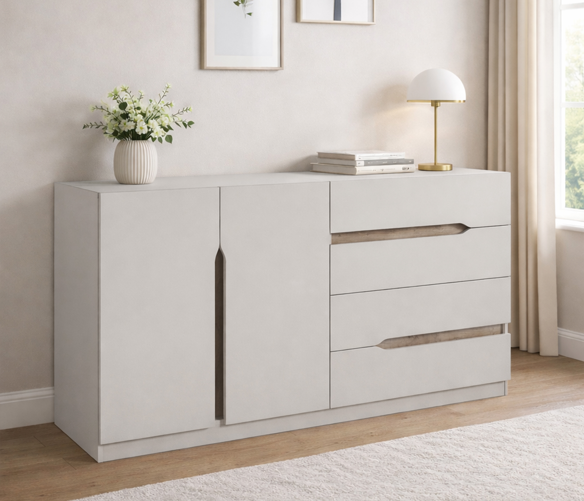 Особенностью данной модели являются плавные вырезы в фасадах, которые не только удобны для открывания, но и добавляют оригинальности. Внутри этих вырезов расположены вставки цвета Дуб вотан, что создает контраст и подчеркивает эстетику мебели.