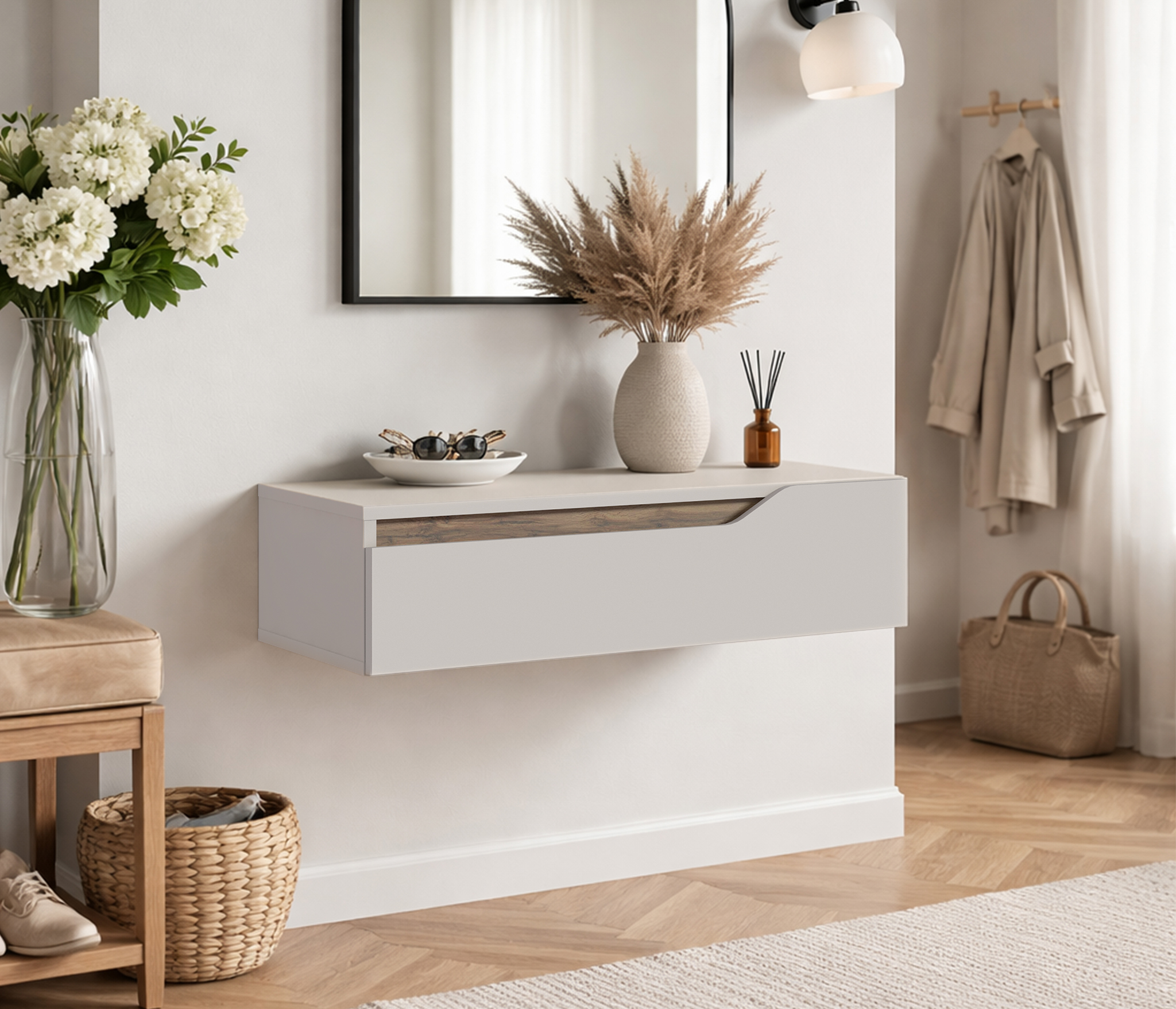 Особенностью данной модели являются плавные вырезы в фасадах, которые не только удобны для открывания, но и добавляют оригинальности. Внутри этих вырезов расположены вставки цвета Дуб вотан, что создает контраст и подчеркивает эстетику мебели.