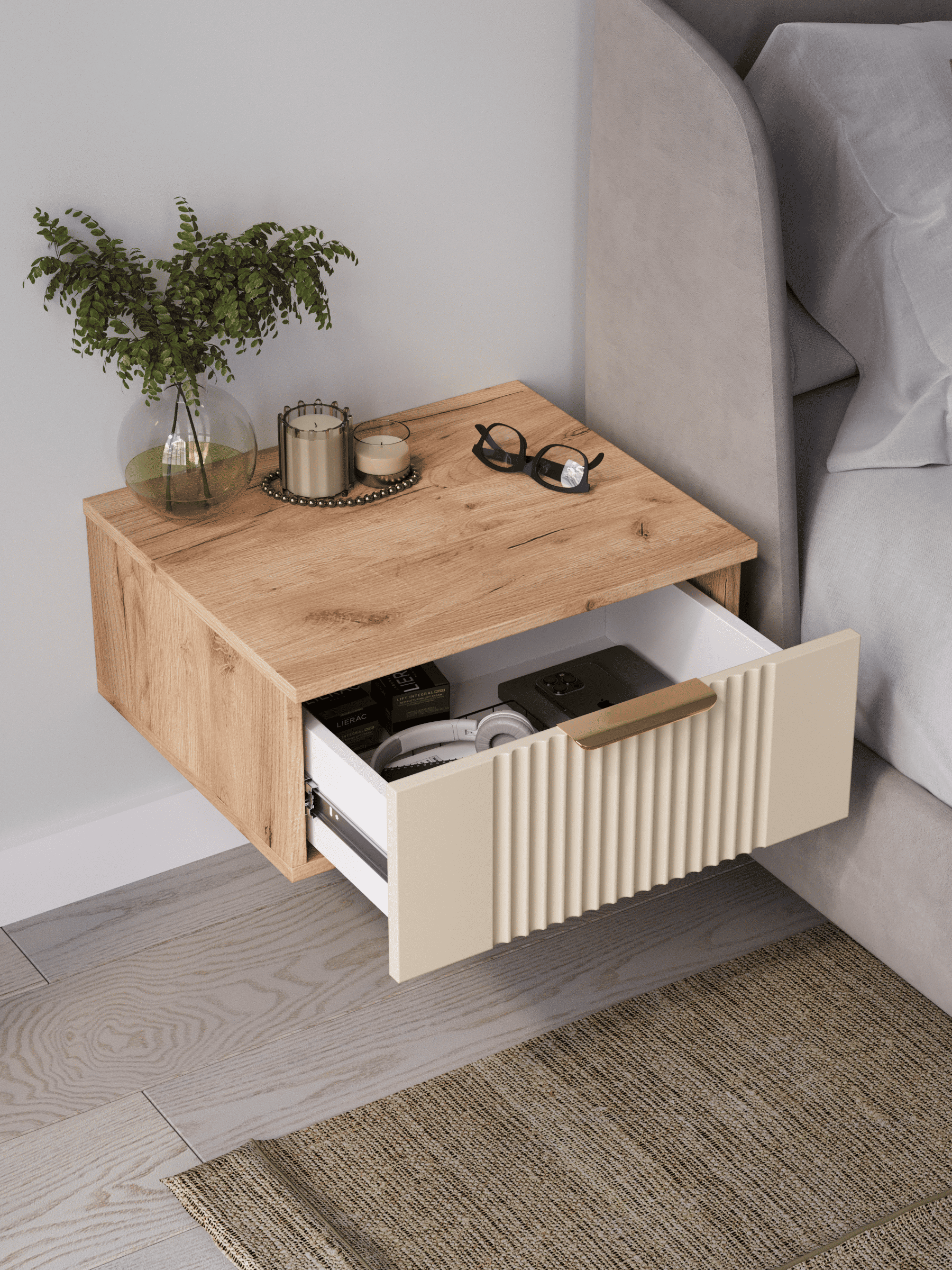 Подвесная прикроватная тумба с ящиком, соединяет в себе комфорт, функциональность и эстетику. Сегодня в тренде – стильные подвесные тумбы. Наша тумба подвесная российского производства выглядят легко и современно, идеально впишется в лофт, скандинавский, современный, минимализм и прочие популярные стили интерьеров. Ее минималистичный дизайн, невесомая конструкция и поразительная вместительность - придадут легкость и простор всему вашему интерьеру. Консоль подвесная размером 50х22х42 (ДхВхГ) см, сэкономит пространство и организует грамотное хранение вещей. Шкафчик навесной изготовлен из материалов высокого качества. За высокопрочность и долговечность отвечает корпус, выполненный из ЛДСП, подходит для активного использования. За эстетику и лаконичность дизайна отвечает фасад из МДФ созданный путем сложной фрезеровки в виде стильного 3D рисунка. Наша тумба прикроватная подвесная оснащена системой открывания push to open, которая подчеркивает монолитный образ. За удобство и комфорт открывания отвечают шариковые направляющие (без доводчиков). Ящик с такой системой открывания будет ходить практически бесшумно и выдвигаться полностью, даже при повышенной нагрузке (до 8 кг). Сборка этой узкой тумбы не требует особых навыков и не отнимет много времени. В комплекте для сборки настенного комода вы найдете все необходимые комплектующие и фурнитуру, что позволит вам легко и быстро собрать ее самостоятельно. Современная мебель должна не только брать на себя пару задач по организации пространства, но и гармонично смотреться. С этой задачей в интерьере справится шкаф с ящиком, который можно использовать в качестве прикроватной тумбы для хранения необходимых предметов рядом с кроватью в спальне. Тумбочка также может стать отличным туалетным столиком, где можно поместить любимую косметику и аксессуары для ухода за собой. Тумба прикроватная Ингрия-1 отлично прослужит как тумба в прихожую или в коридор, внутри нее можно хранить ключи или другие мелкие предметы. Благодаря возможности навесить тумбу на стену на нужной высоте, появится возможность оптимально использовать пространство комнаты. Это особенно актуально для небольших помещений, где каждый квадратный метр имеет значение. Особенно полезной полка с выдвижным ящиком будет в офисных помещениях, так как эта офисная тумба придаст лаконичности и удобства любому помещению. Тумба навесная Ингрия найдет применение и в салонах красоты и в детских комнатах. Почувствуйте себя дизайнером создайте уют с помощью нашей многофункциональной ниши для хранения.