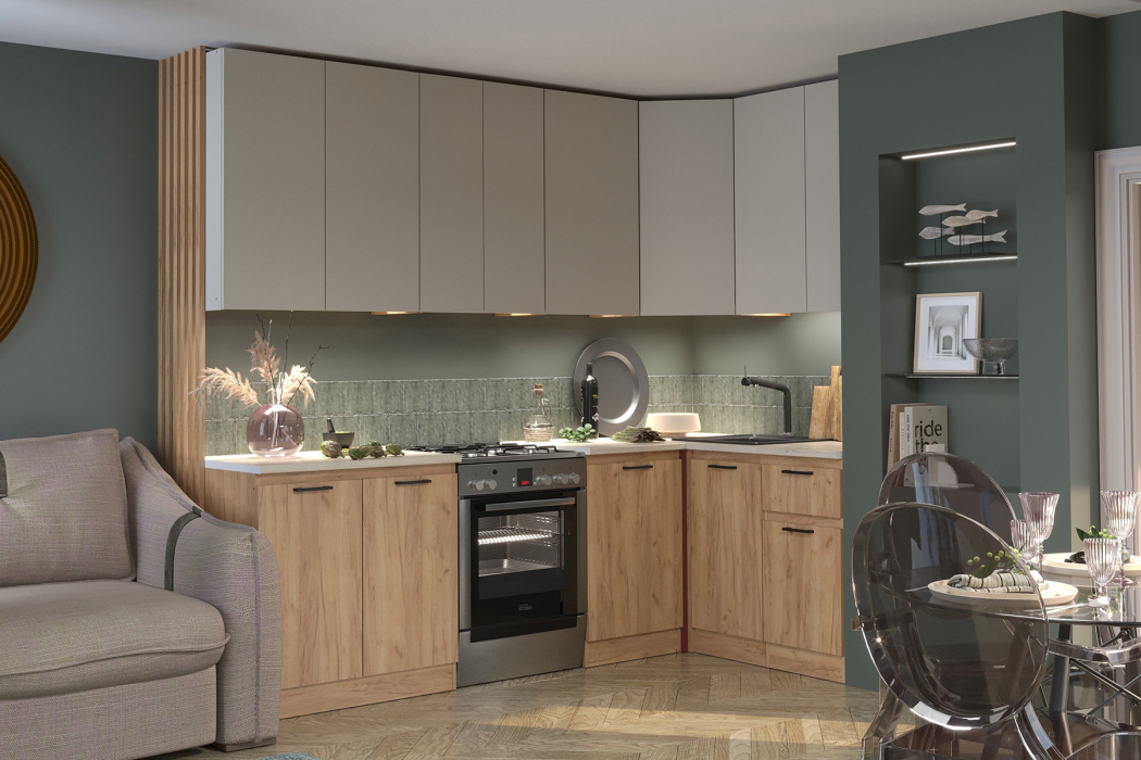 Модульная кухня «Ревилья» - это сочетание стиля, практичности и комфорта. Широкий выбор напольных и навесных модулей различных размеров и конфигураций позволяет легко составить гарнитур под особенности вашего помещения - от компактной кухни до просторного кухонного пространства.