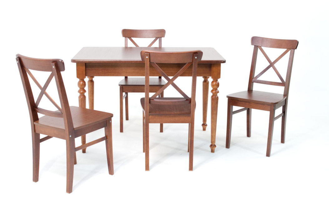 Комплект из деревянного стола Вивальди на каркасе из натурального дерева и 4 стульев Ингольф отлично подойдет к интерьеру, выдержанному в классическом или софременном стиле. Данный комплект станет центральным элементом в гостиной, столовой зоне, на кухне, позволив создать уютное обеденное место, где смогут собираться члены дружной семьи и их гости.У модели скругленные углы столешницы. Такое решение исключит риск сколов и обеспечит безопасность, в том числе, детям.Комплект выполнен в красивом  цвете - орех. Сочетание изысканного дизайна и высокого качества исполнения - главная особенность комплекта.Столешница выполнена из материалов с великолепными эксплуатационными свойствами - МДФ (Материал создается на основе натуральной древесины. Практичен, надежен, имеет однородную гладкую структуру), шпон.Мебель проста в уходе - для поддержания первозданного вида достаточно использовать простую чуть влажную салфетку по мере необходимости.