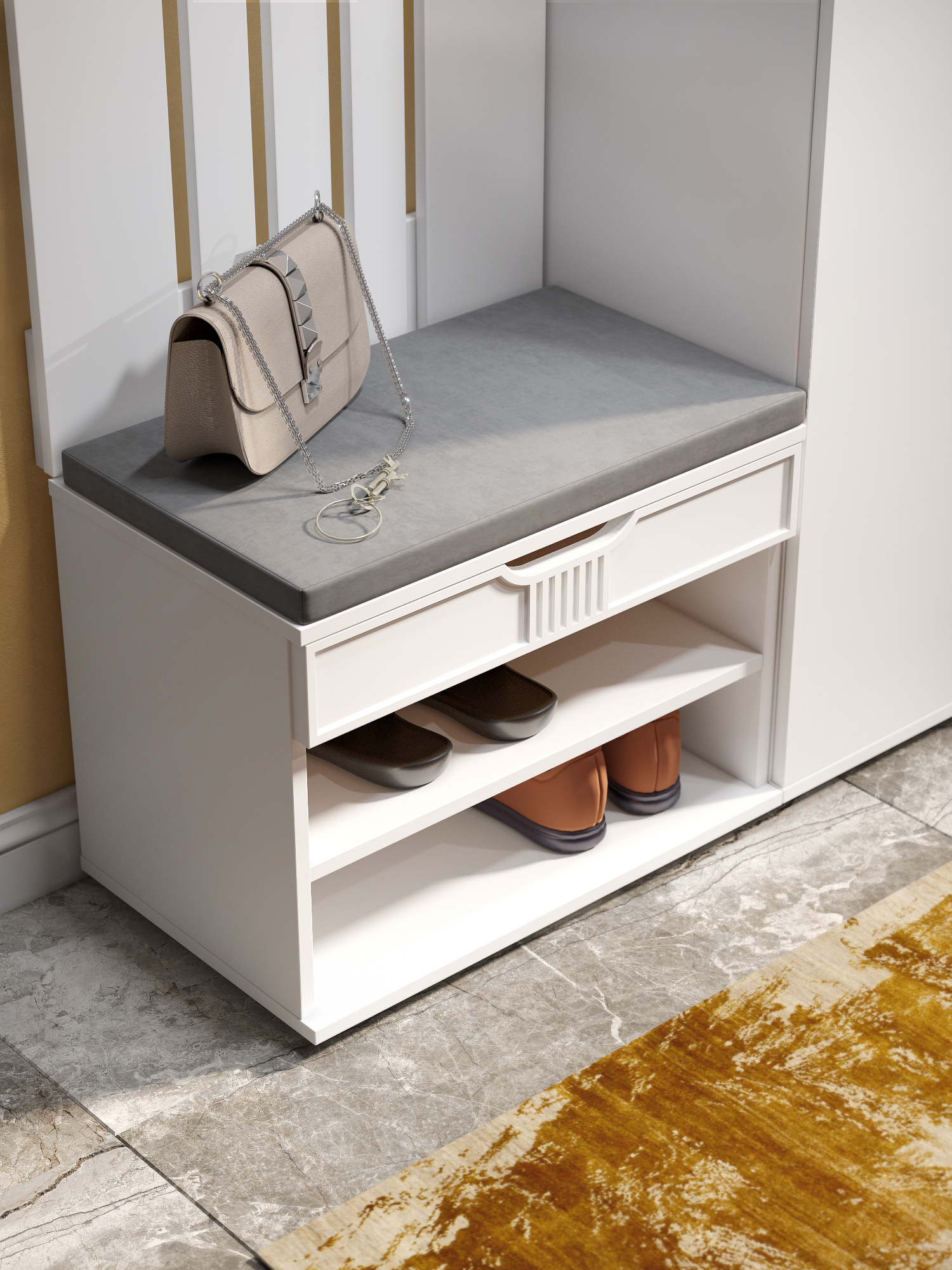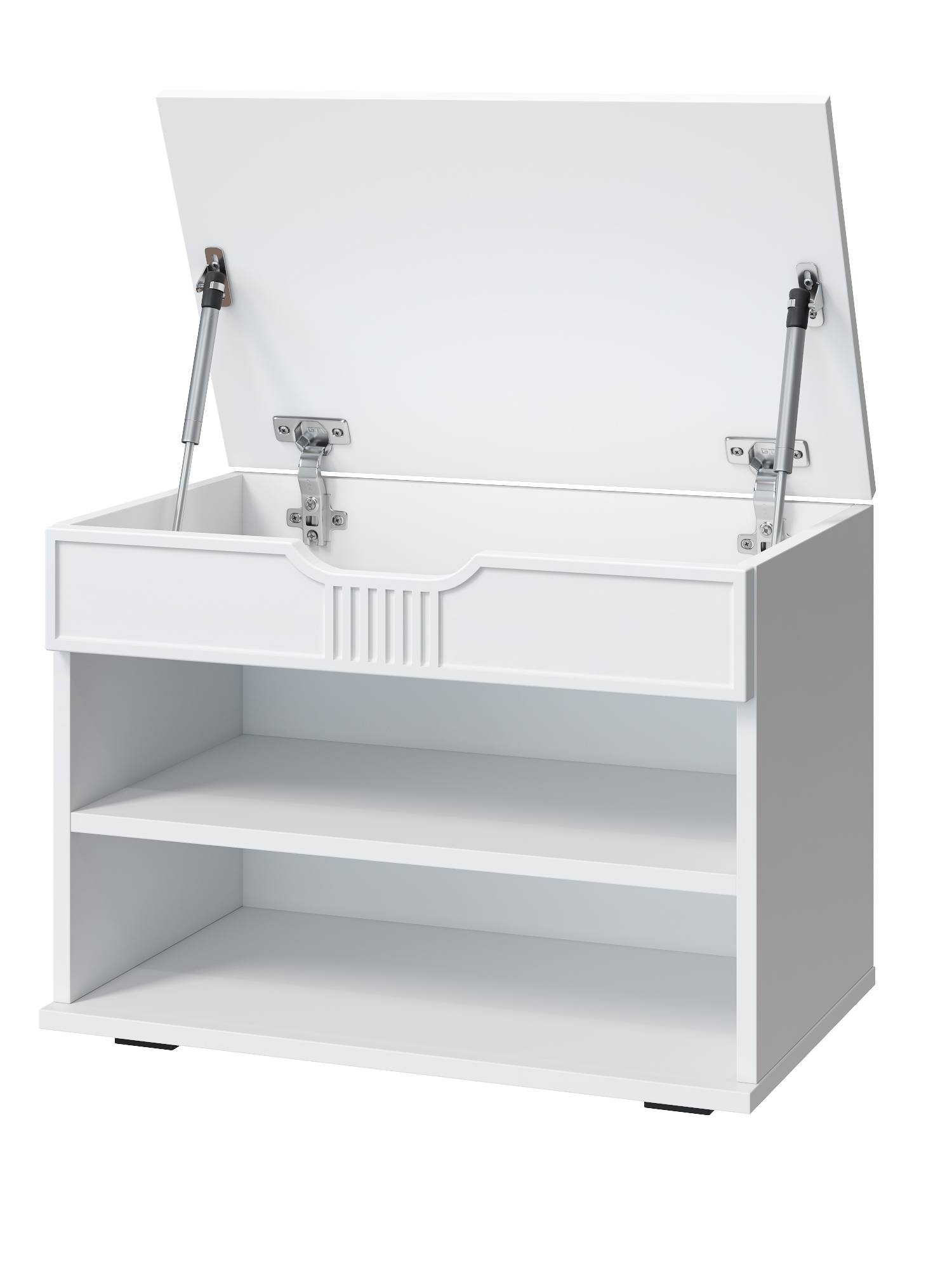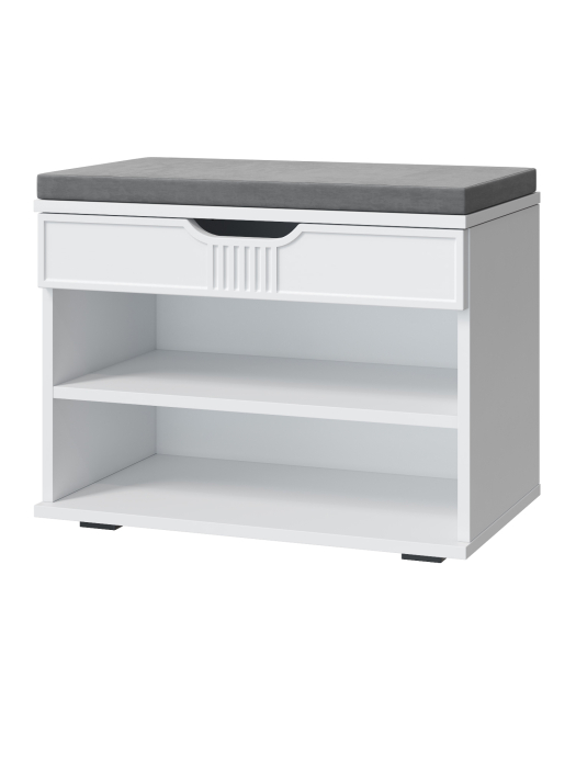 Тумба для обуви Эмилия ЭЛ-44К – компактная модель для комфортного переобувания в прихожую. Лаконичное изделие оборудовано двумя полками для обуви и мягким сиденьем, под которым находится удобный ящик для хранения чистящих средств, щеток или зонта. Ткань мягкой части велюр, наполнение: поролон 40 мм, синтепон, белый флизелин. Высота опоры 20 мм.