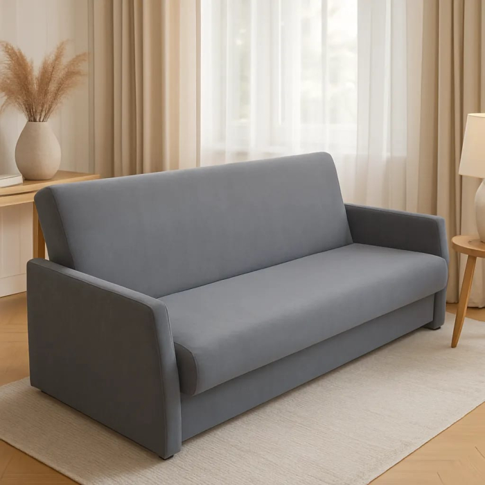 Габариты: 1950*600*1100; Спальное место: 1900*1200. Ткань - подлокотники - к/з, сиденье - велюр. Материалы: пиломатериал хвойных пород, фанера, ДВП, ДСП. Синтепон, войлок, пружинный блок. Механизм книжка. Ящик для белья.