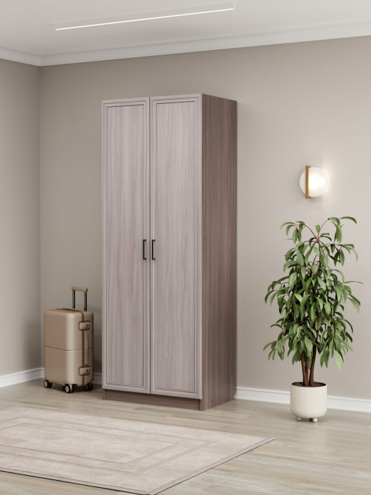Шкаф имеет габариты 80 см в ширину, 52 см в глубину и 210 см в высоту. Фасады изготовлены из МДФ, корпус выполнен из ЛДСП. Такое сочетание материалов обеспечивает прочность и долговечность конструкции, устойчивость к повседневным нагрузкам, а также привлекательный внешний вид изделия. Внутри располагается двухстворчатое отделение с горизонтальной штангой для белья, рассчитанной на нагрузку до 10 кг. Помимо этого, предусмотрено 7 полок для размещения вещей, коробок или декоративных предметов.