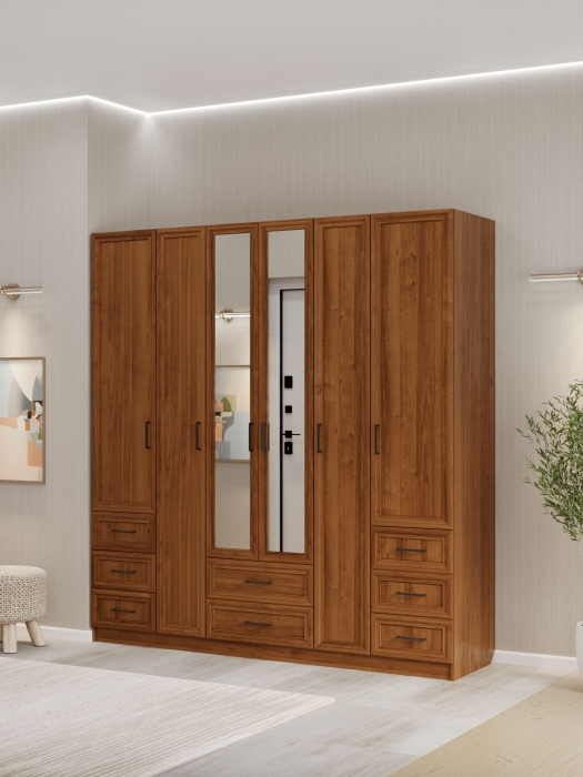 • Удобное зонирование. Шесть дверей позволяют чётко разграничить секции хранения, обеспечивая быстрый доступ к нужным вещам и повышая комфорт эксплуатации шкафа.