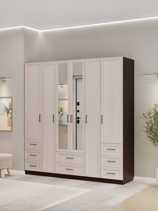 - Удобное зонирование. Шесть дверей позволяют чётко разграничить секции хранения, обеспечивая быстрый доступ к нужным вещам и повышая комфорт эксплуатации шкафа.
