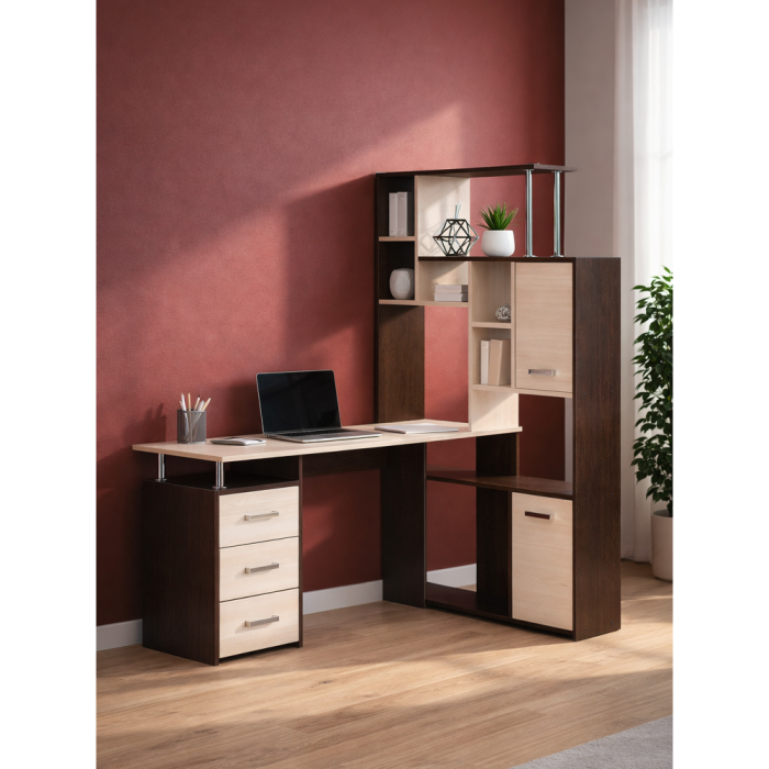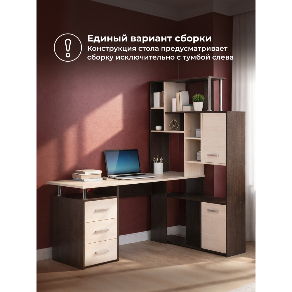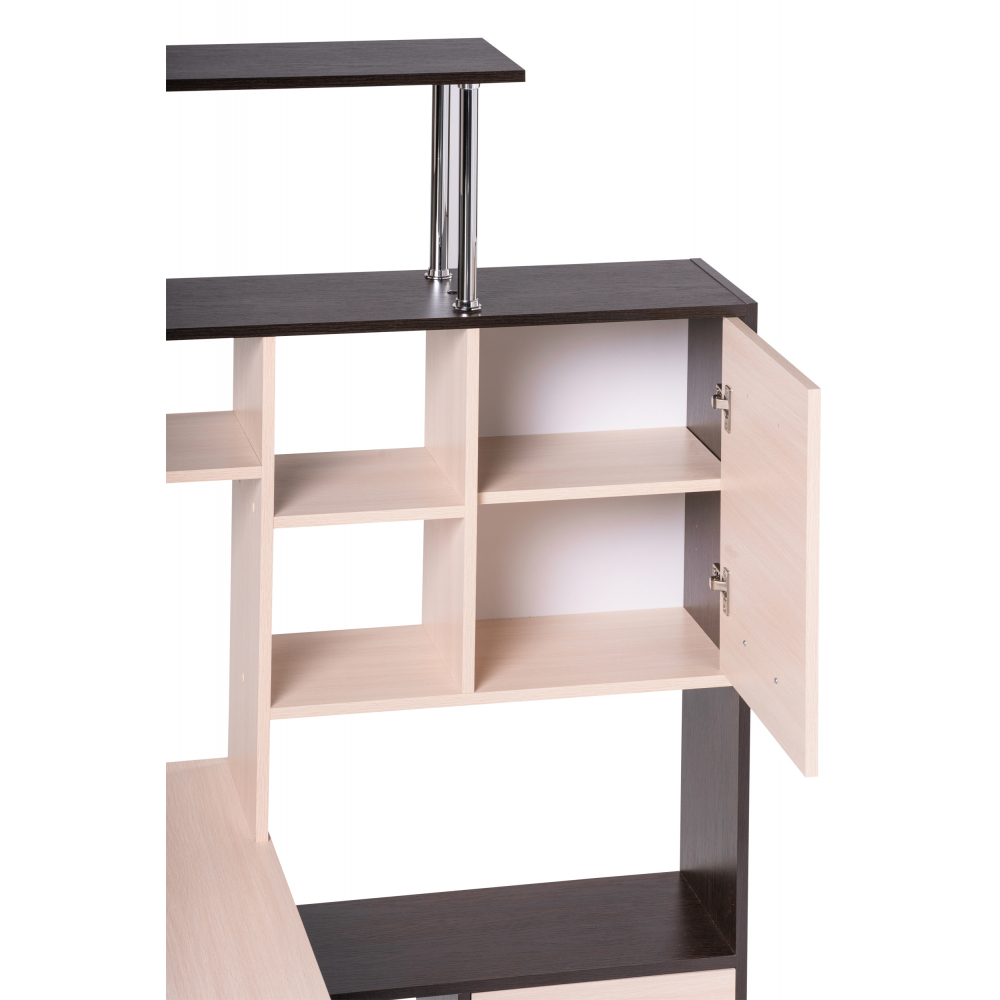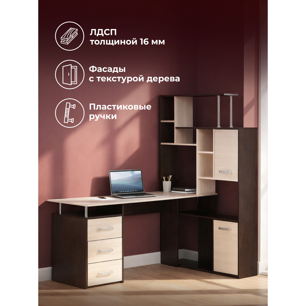 Стол КС-15 венге / дуб молочный правый; ЛДСП. Высота столешницы 75см. Рабочее место - 142х62см. Толщина ЛДСП - 16мм. Имеется 3 выкатных ящика на роликовых направляющих, 4 закрытых дверьми полки. Огромная вместительность для учёбы