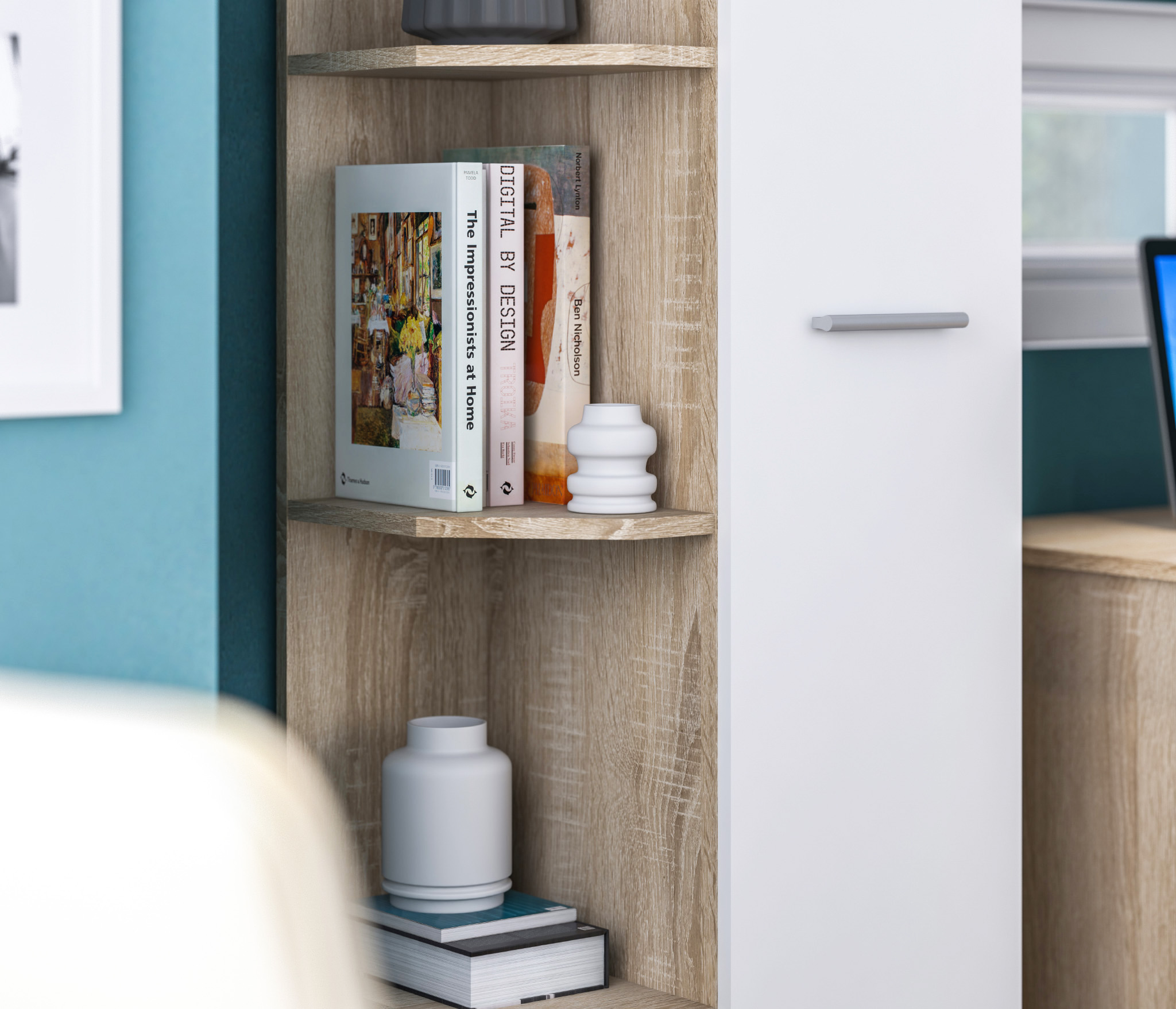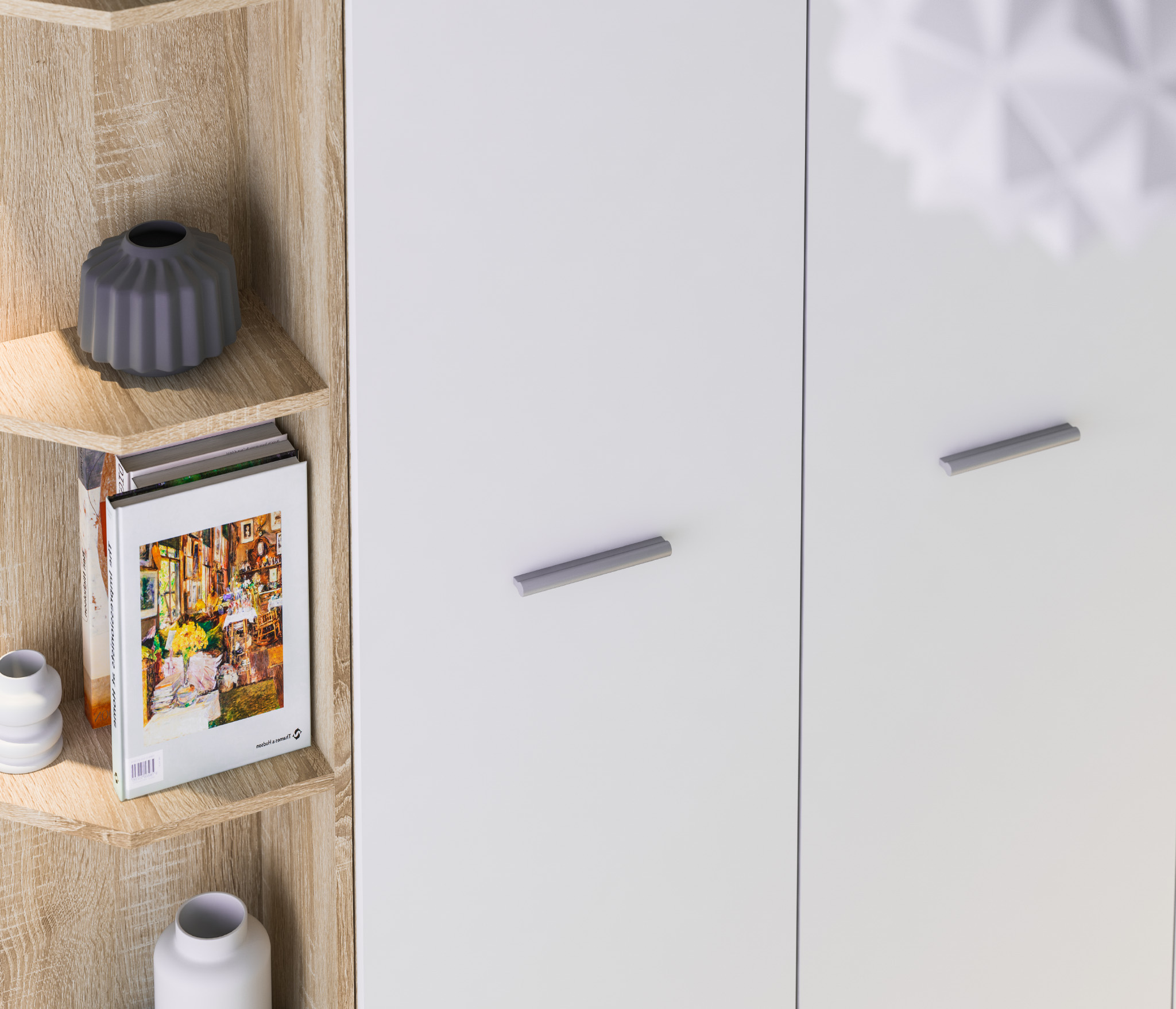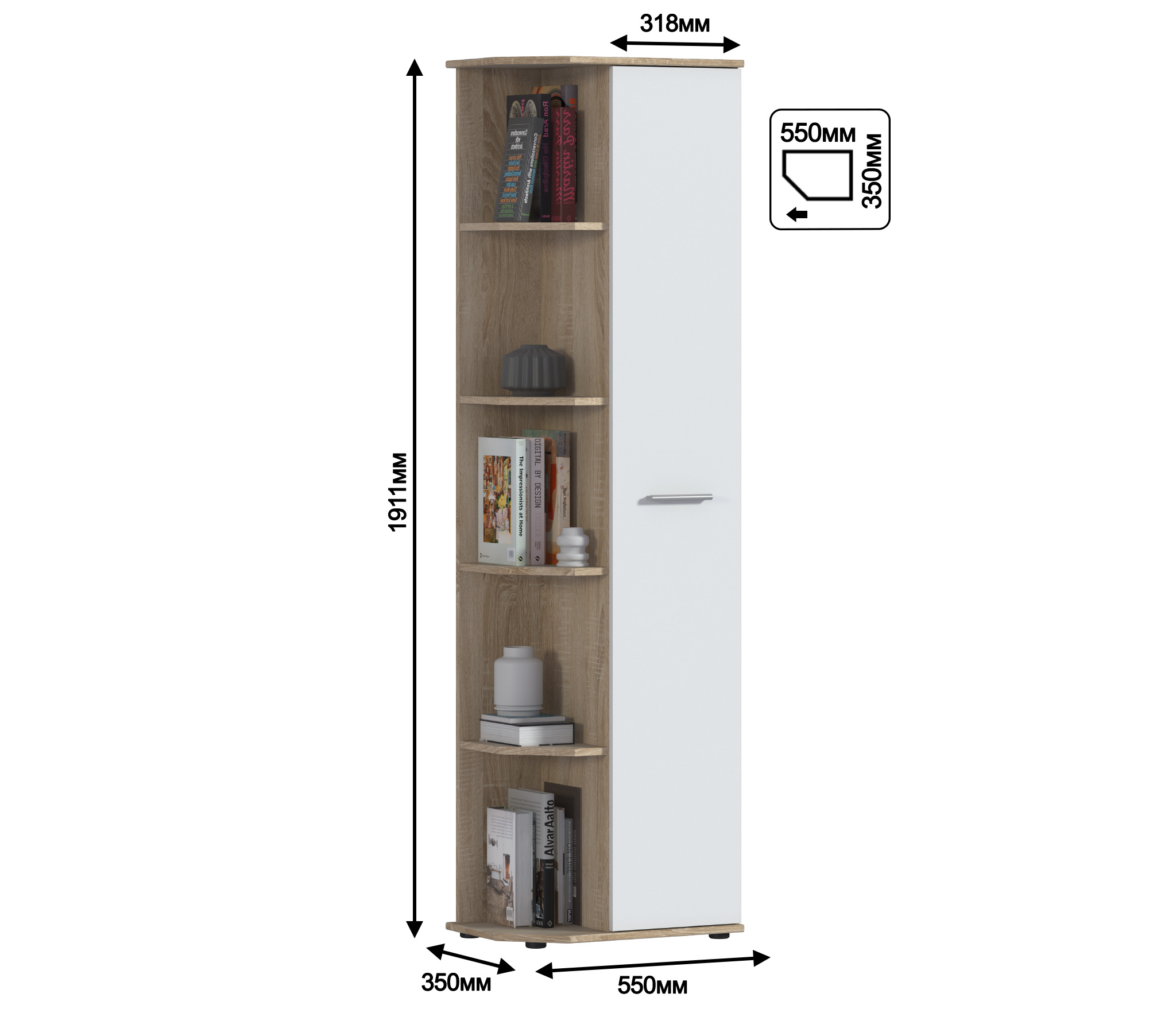 Габаритные размеры шкафа – ширина 55 см, высота 191 см и глубина 35 см. Визуально его можно разделить на два отделения. Одно угловое с пятью открытыми полками. Другое оснащено вместительными полками и имеет две дверцы. Произведен шкаф из современного и прочного КДСП. Классическое исполнение, светлый оттенок оформления «Дуб Сонома», подобранная фурнитура и качественные крепёжные механизмы говорят о достойном качестве торцевого шкафа Мамбо СБ-2754.