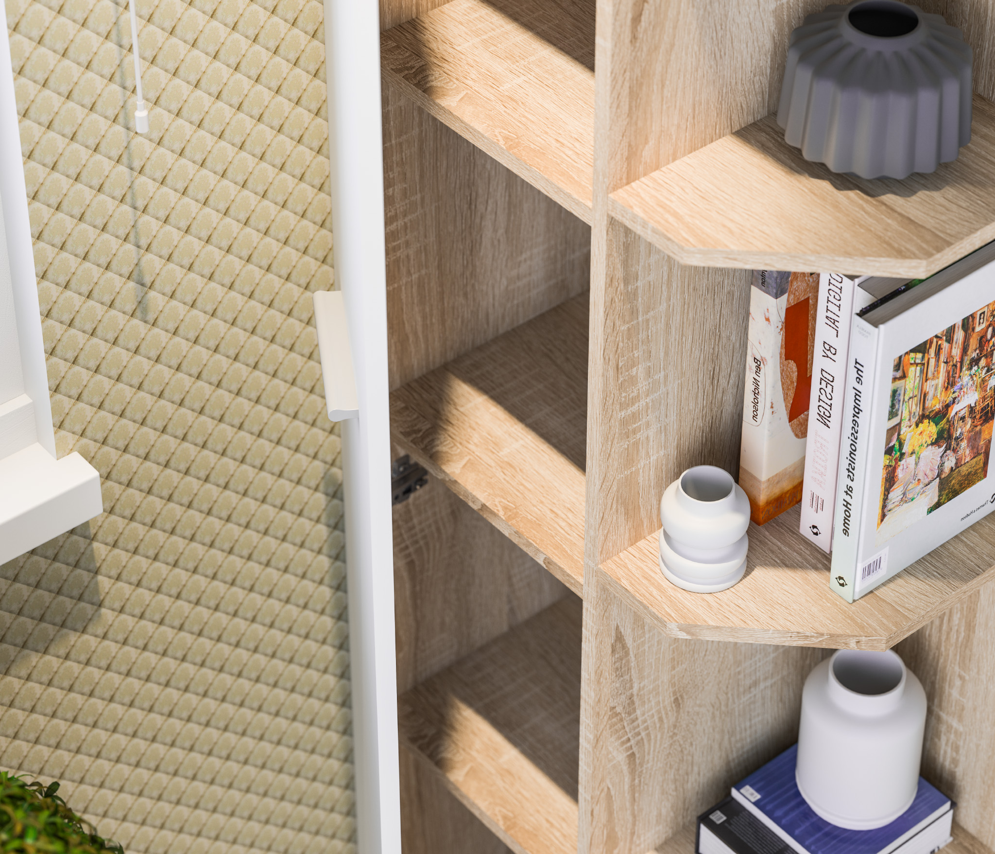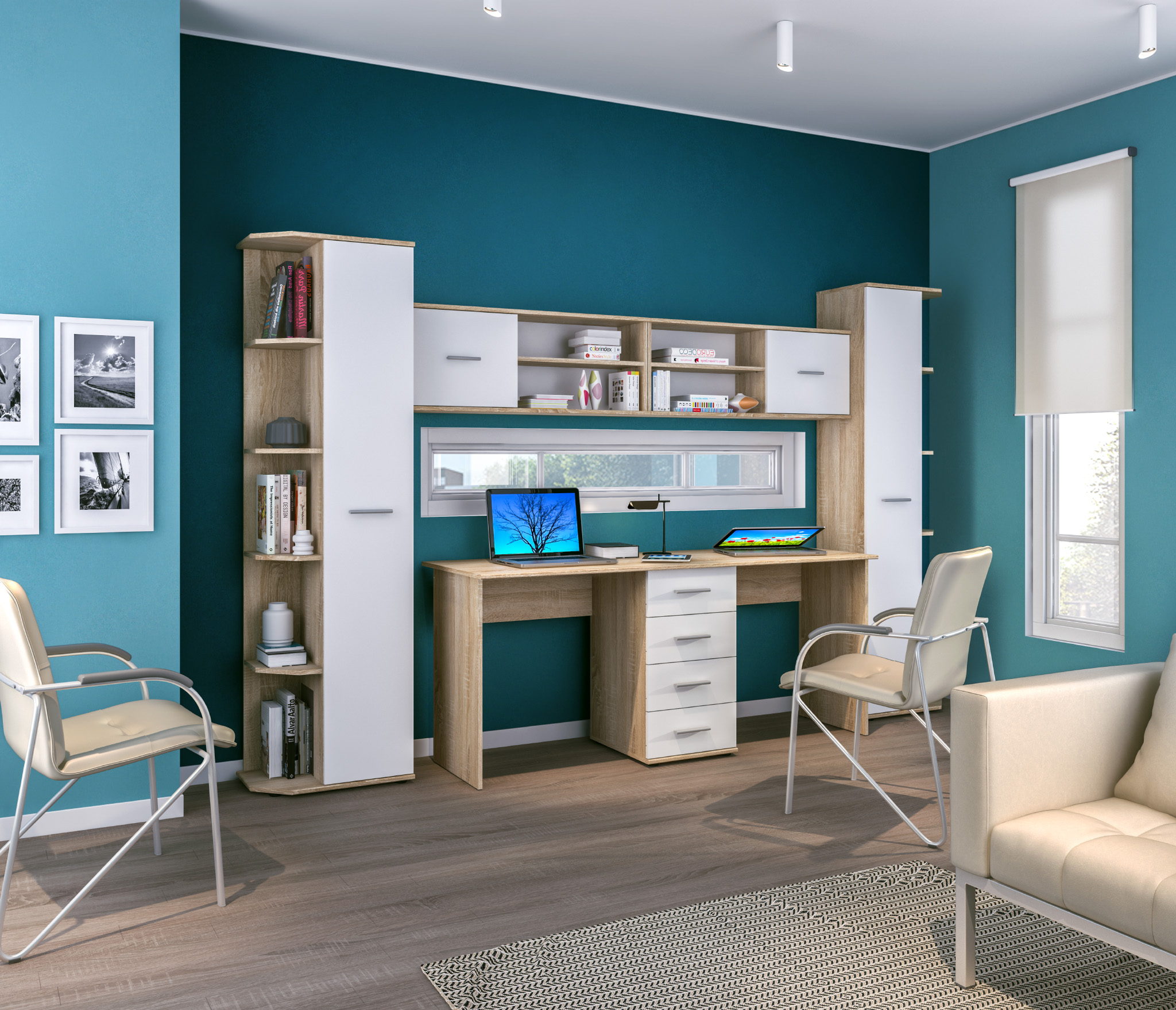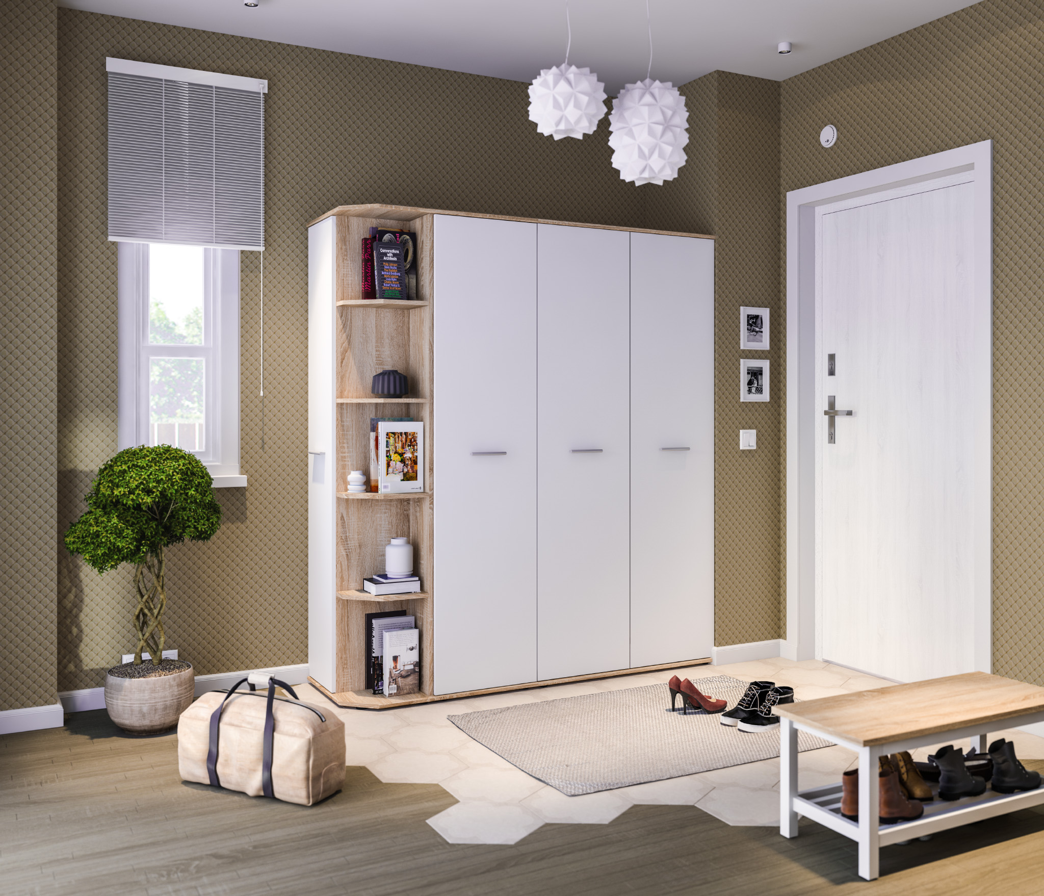 Габаритные размеры шкафа – ширина 55 см, высота 191 см и глубина 35 см. Визуально его можно разделить на два отделения. Одно угловое с пятью открытыми полками. Другое оснащено вместительными полками и имеет две дверцы. Произведен шкаф из современного и прочного КДСП. Классическое исполнение, светлый оттенок оформления «Дуб Сонома», подобранная фурнитура и качественные крепёжные механизмы говорят о достойном качестве торцевого шкафа Мамбо СБ-2754.