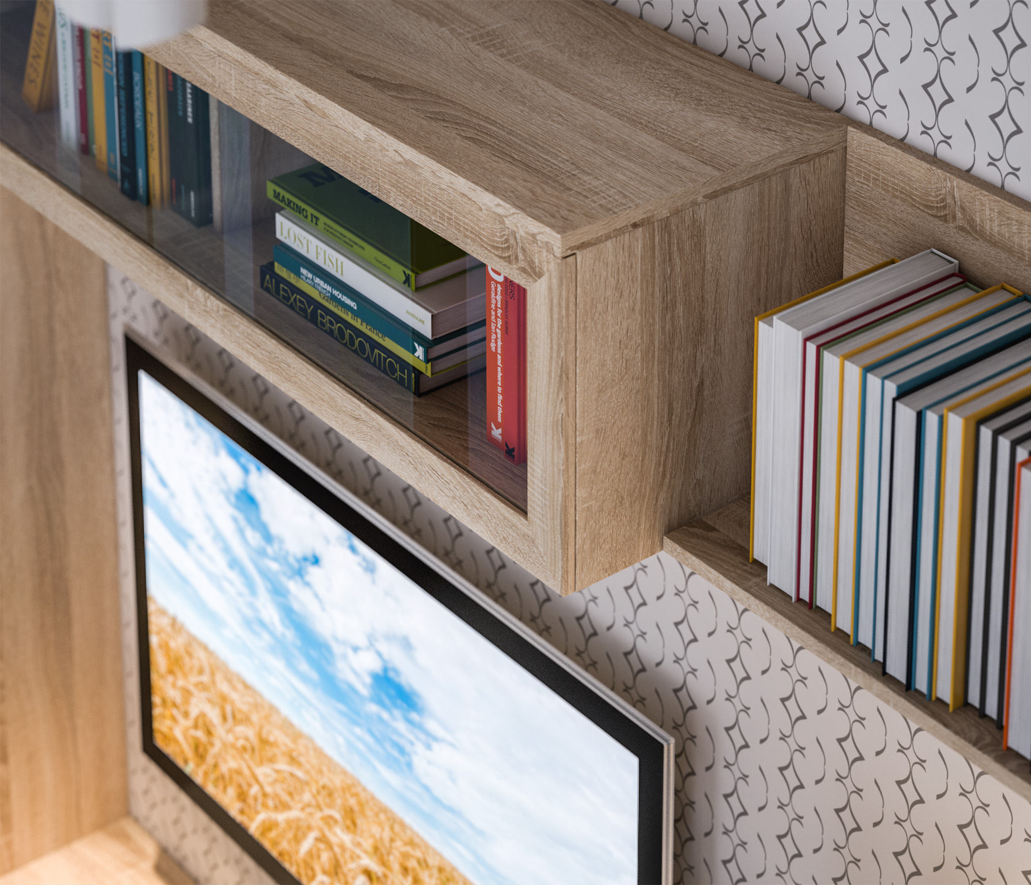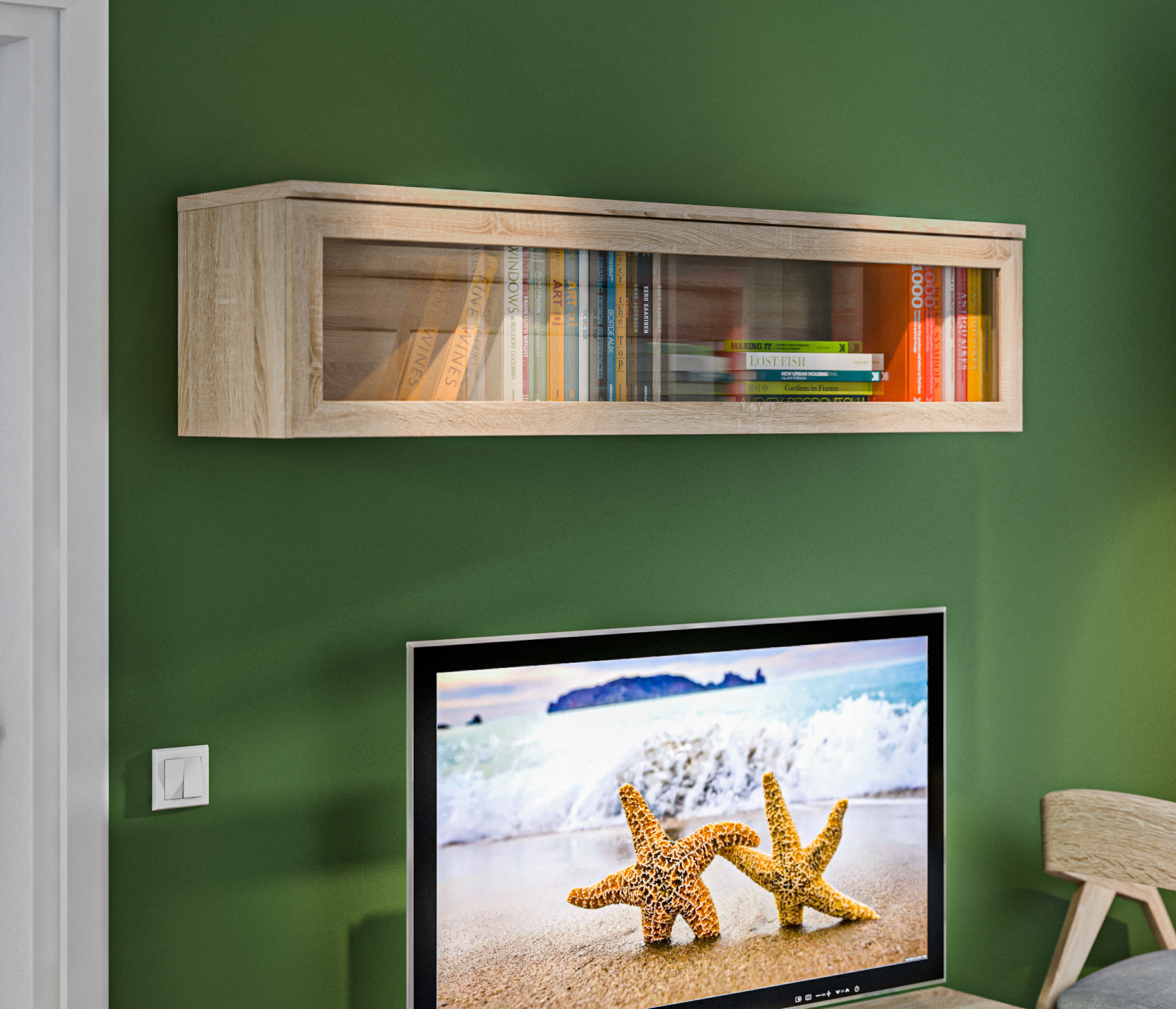 Габаритные размеры – ширина 140 см, высота 35 см и глубина 35 см. За остекленной дверцей находятся два вместительных отделения, куда можно складывать книги, посуду или сувениры.
