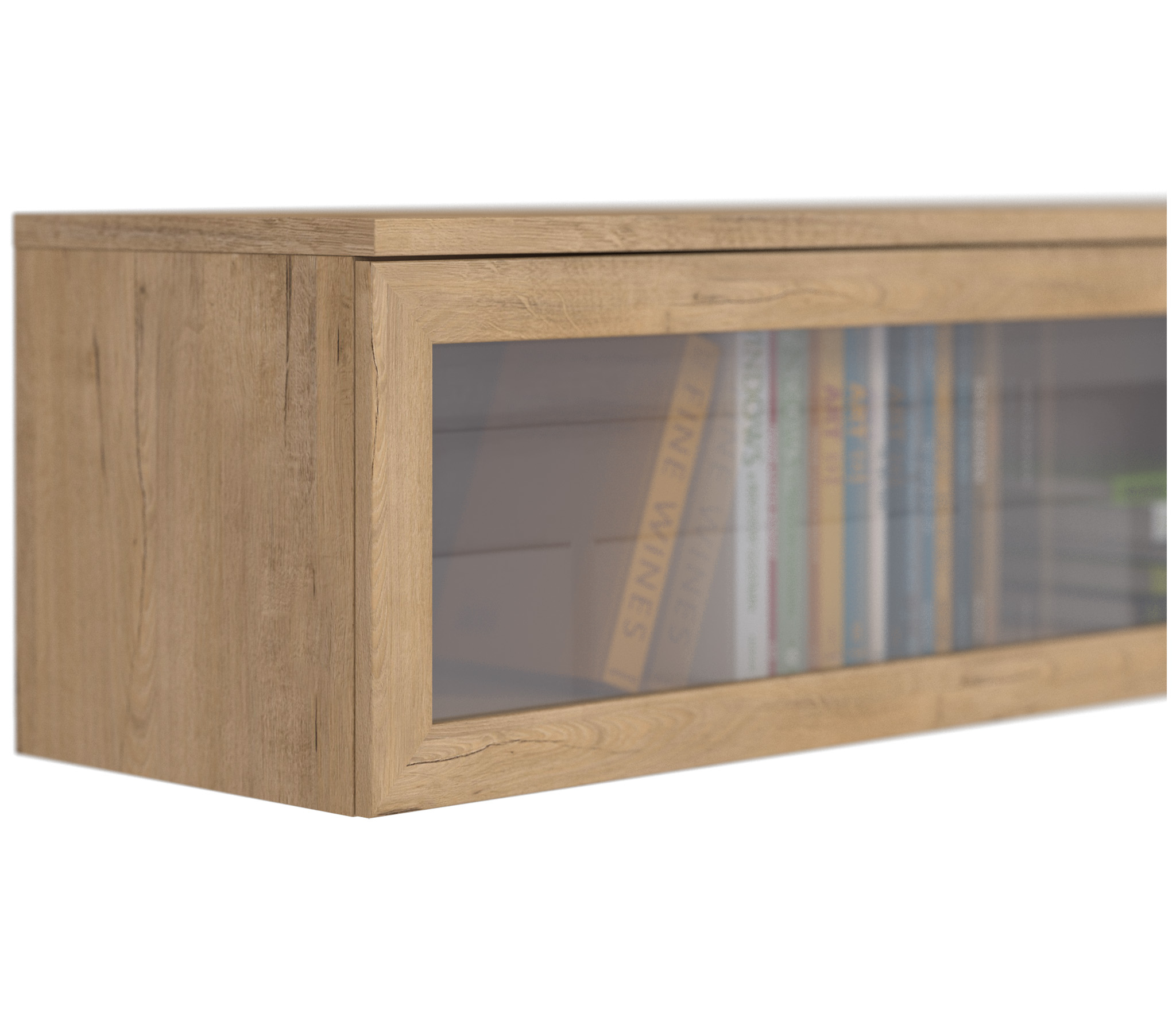 Габаритные размеры – ширина 140 см, высота 35 см и глубина 35 см. За остекленной дверцей находятся два вместительных отделения, куда можно складывать книги, посуду или сувениры.