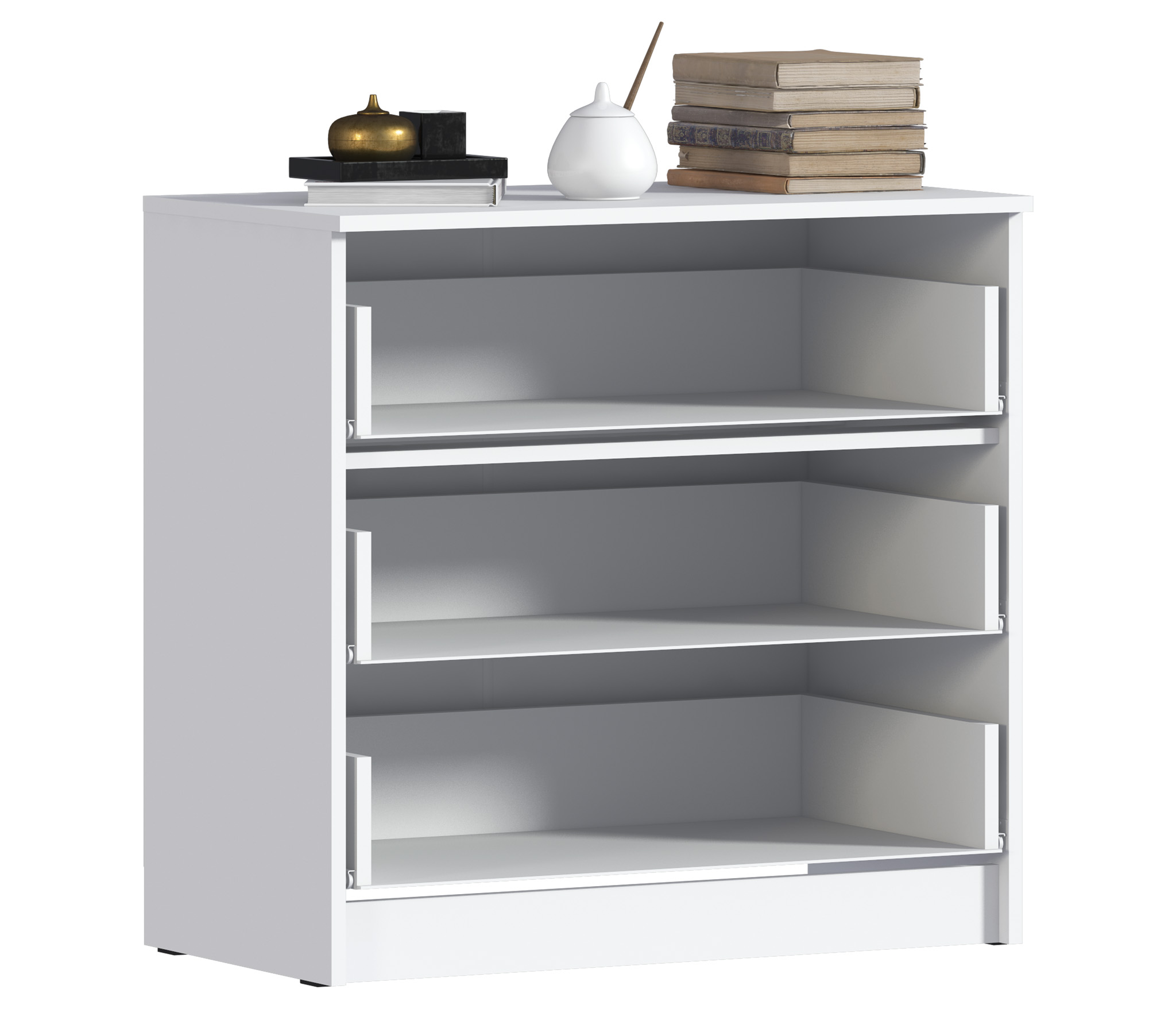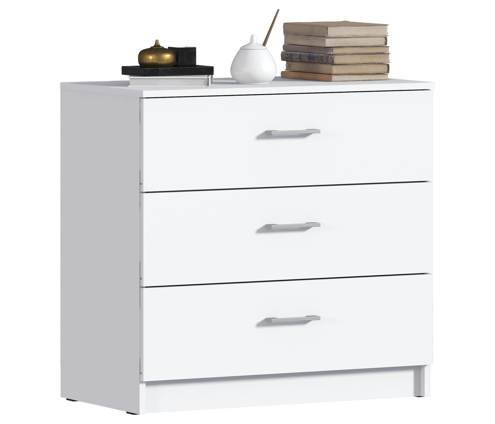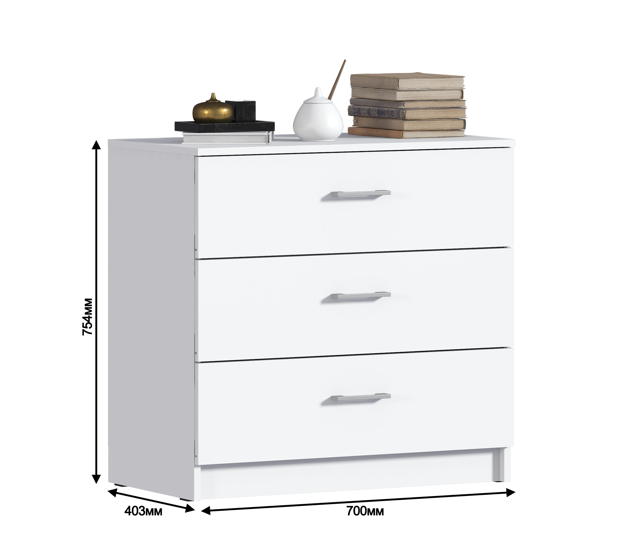 Благодаря компактным размерам – ширина 70 см, высота 75 см и глубина 40 см, комод Терра оптимально подойдет для помещений небольшой площади.Три довольно больших ящика комода Терра оснащены прочными и долговечными выдвижными механизмами.Белый цвет и лаконичный дизайн придают комоду легкий и стильный вид.