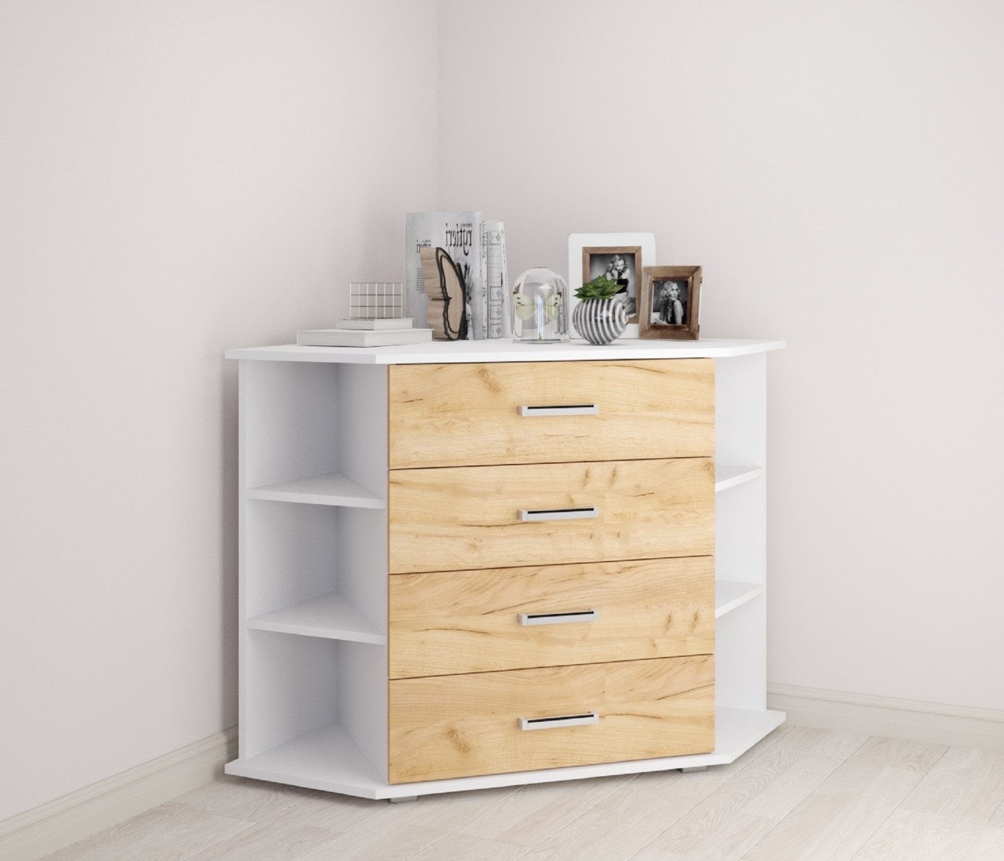 — Угловой комод с открытыми полками и выдвижными ящиками