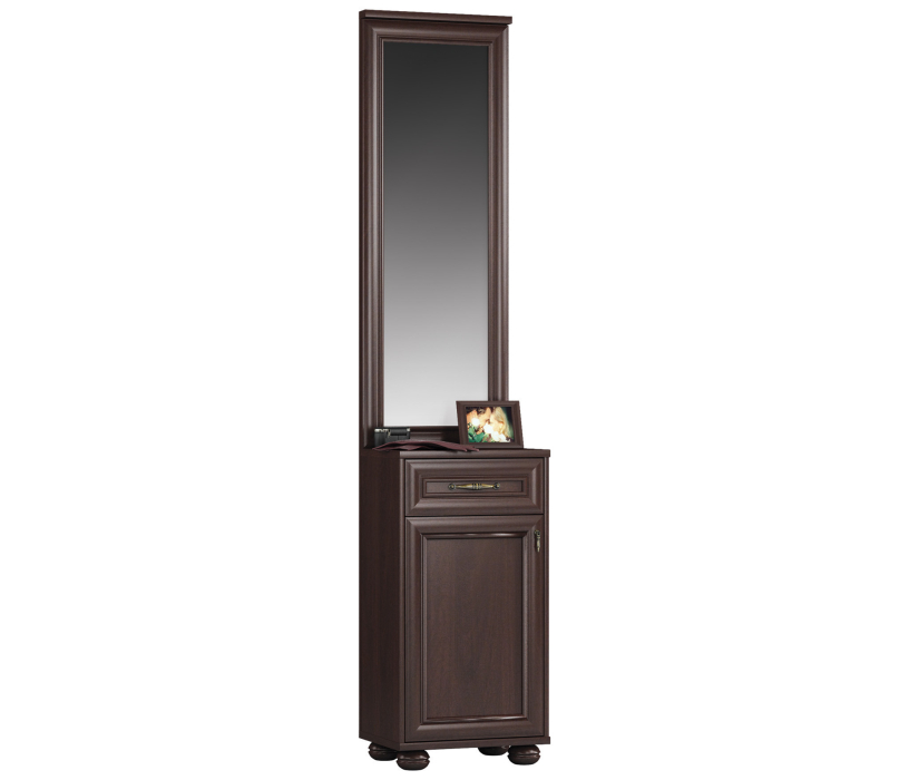 Габаритные размеры – ширина 46 см, высота 219 см и глубина 35 см. Нижняя часть – отделение с отдельной дверцей в котором можно хранить обувь и сумки. А в выдвижном ящике можно хранить разную мелочь. Тумба оснащена протекторами или «лапками», которые не позволяют повредить полы во время перестановки. Тумба выполнена в классическом дизайне из экологичного современного материала. Отделка в цвете «Мара Махагон».