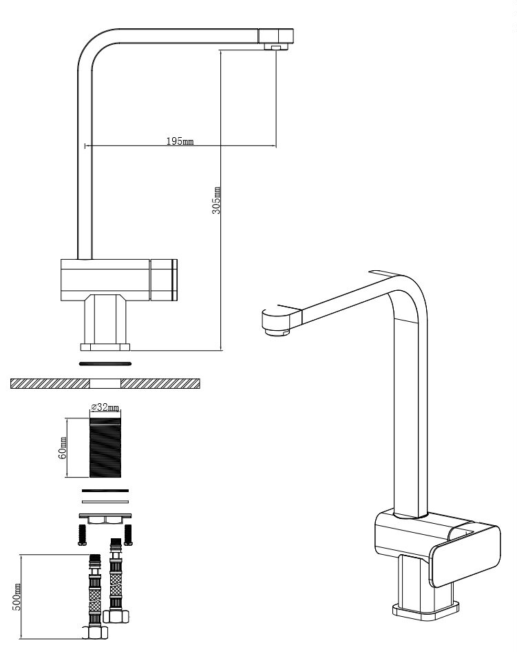 Легкое подключение гибкими шлангами длиной 450 мм с гайкой 3/8