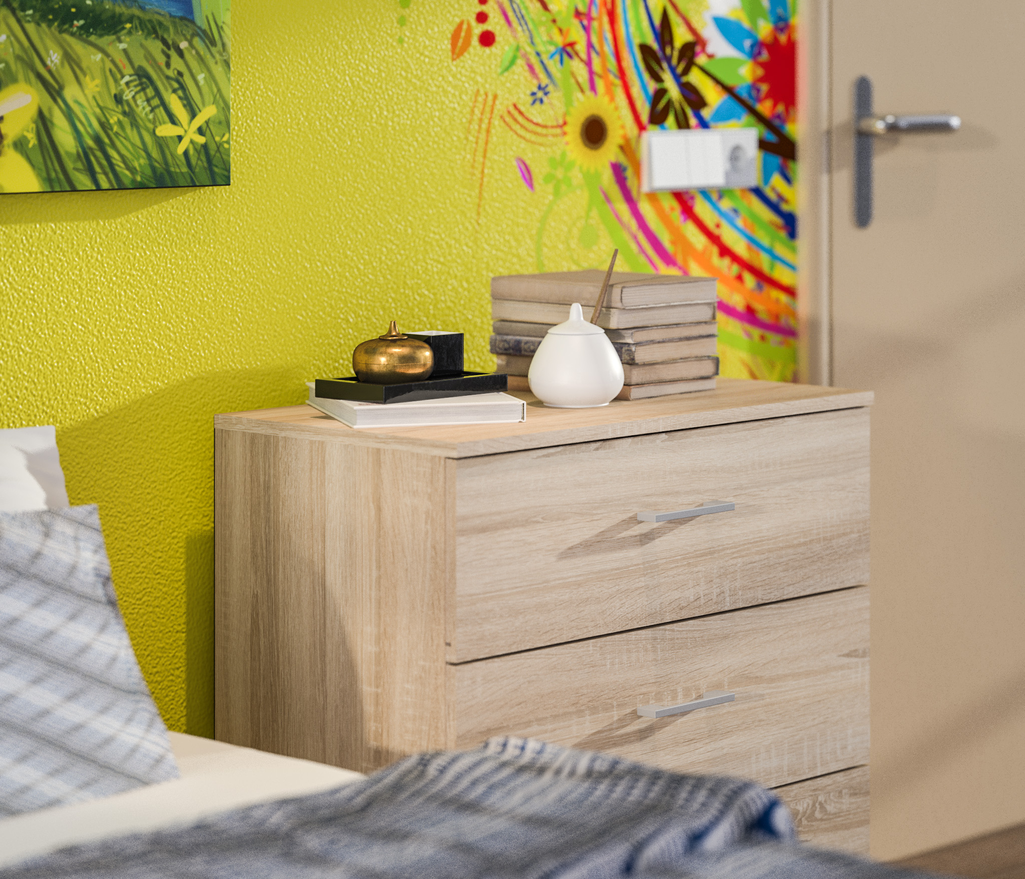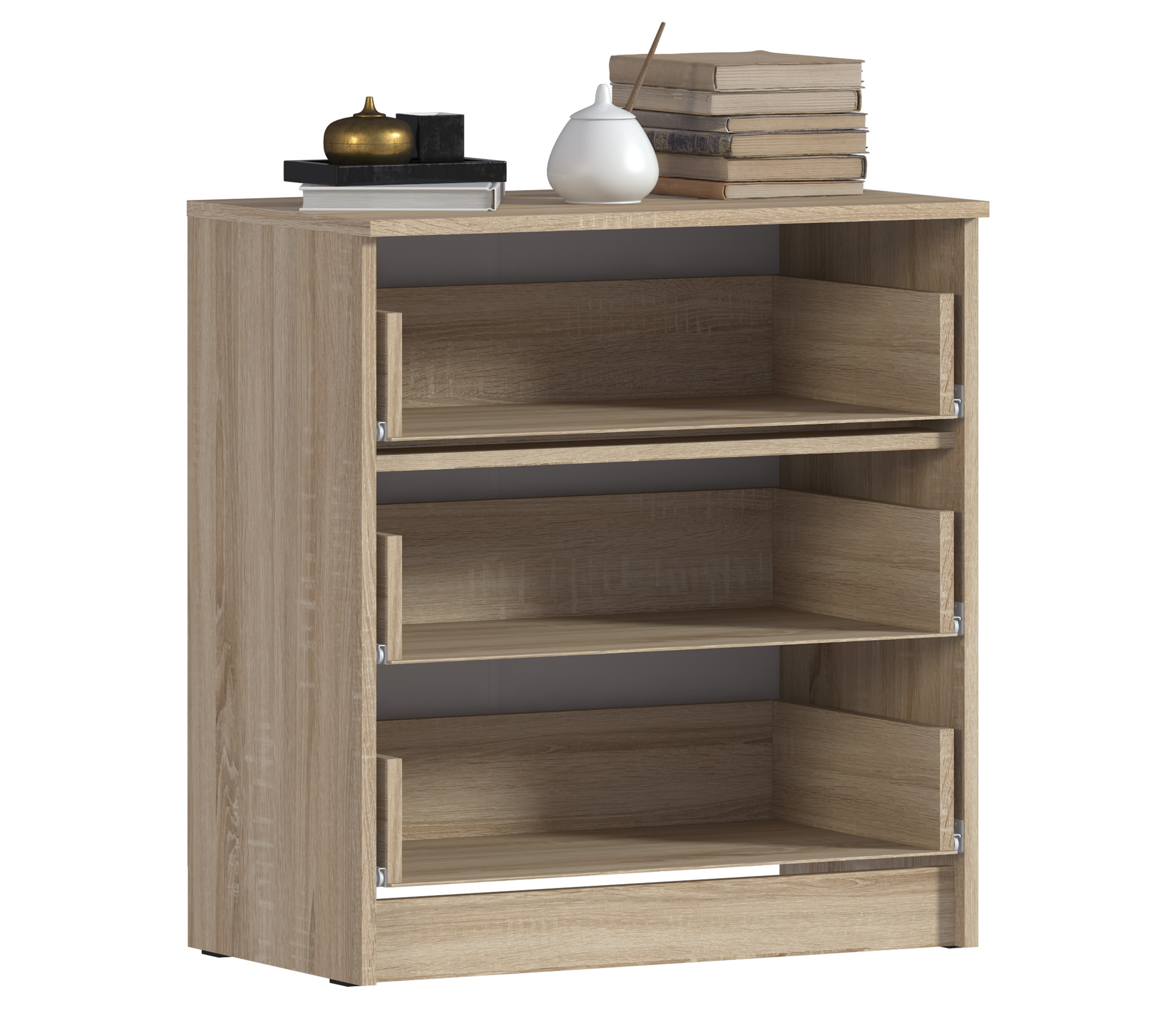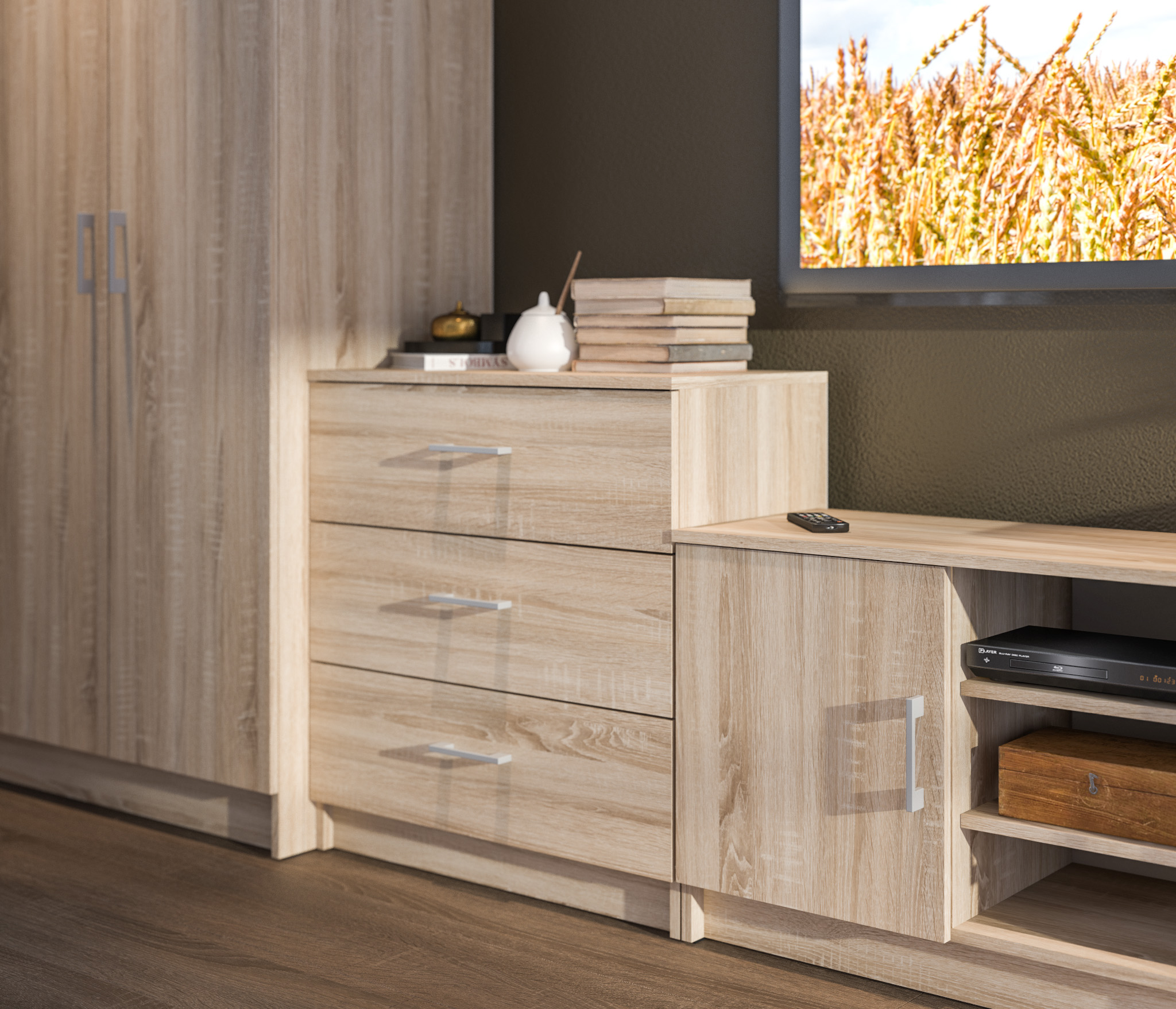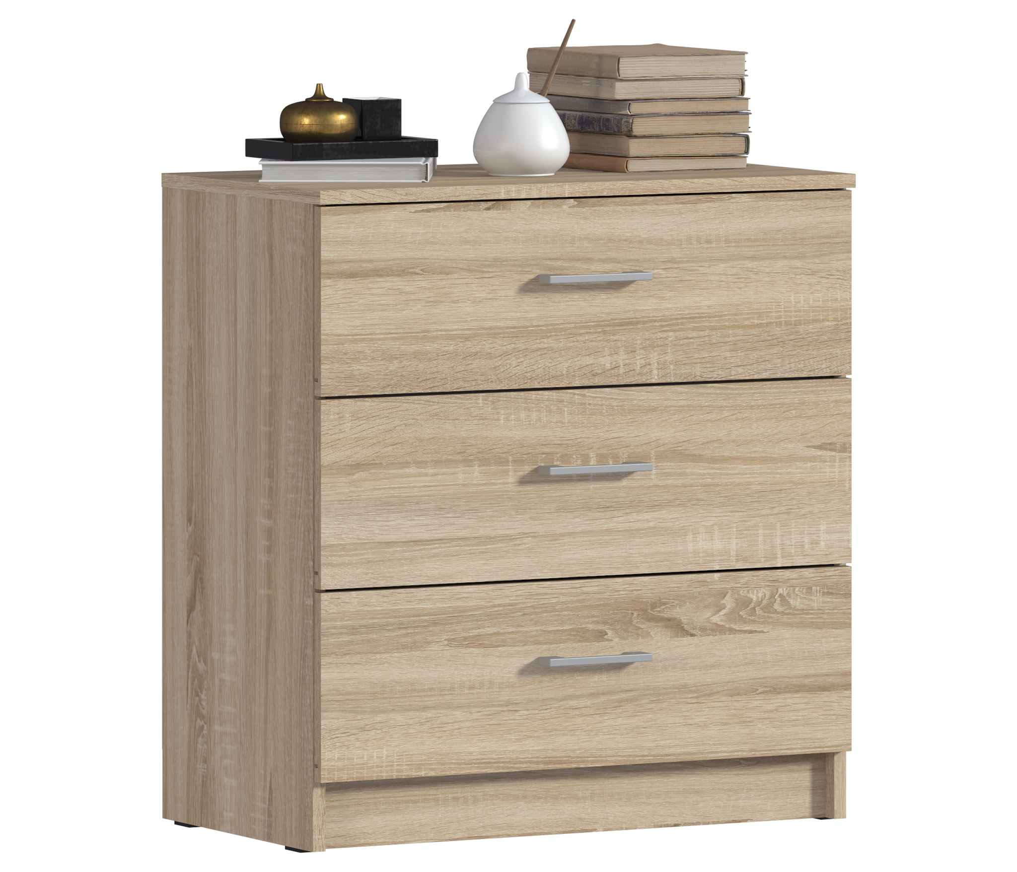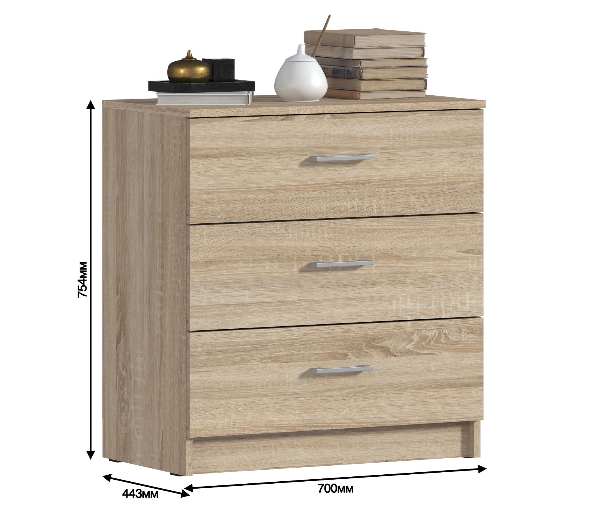 Благодаря компактным размерам – ширина 70 см, высота 75 см и глубина 40 см, комод Терра оптимально подойдет для помещений небольшой площади. Три довольно больших ящика комода Терра оснащены прочными и долговечными выдвижными механизмами. Цвет Дуб Сонома и лаконичный дизайн придают комоду легкий и стильный вид.