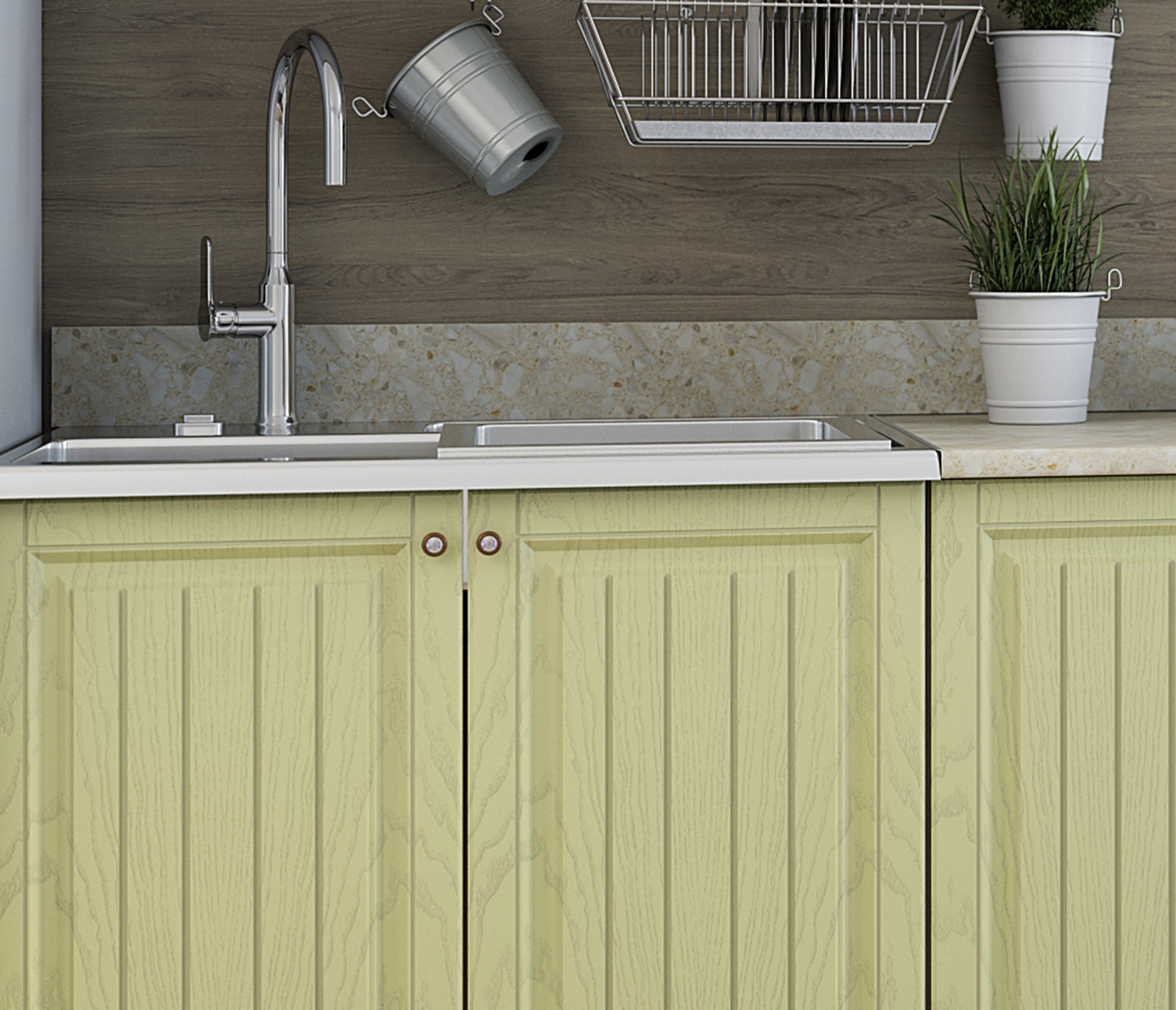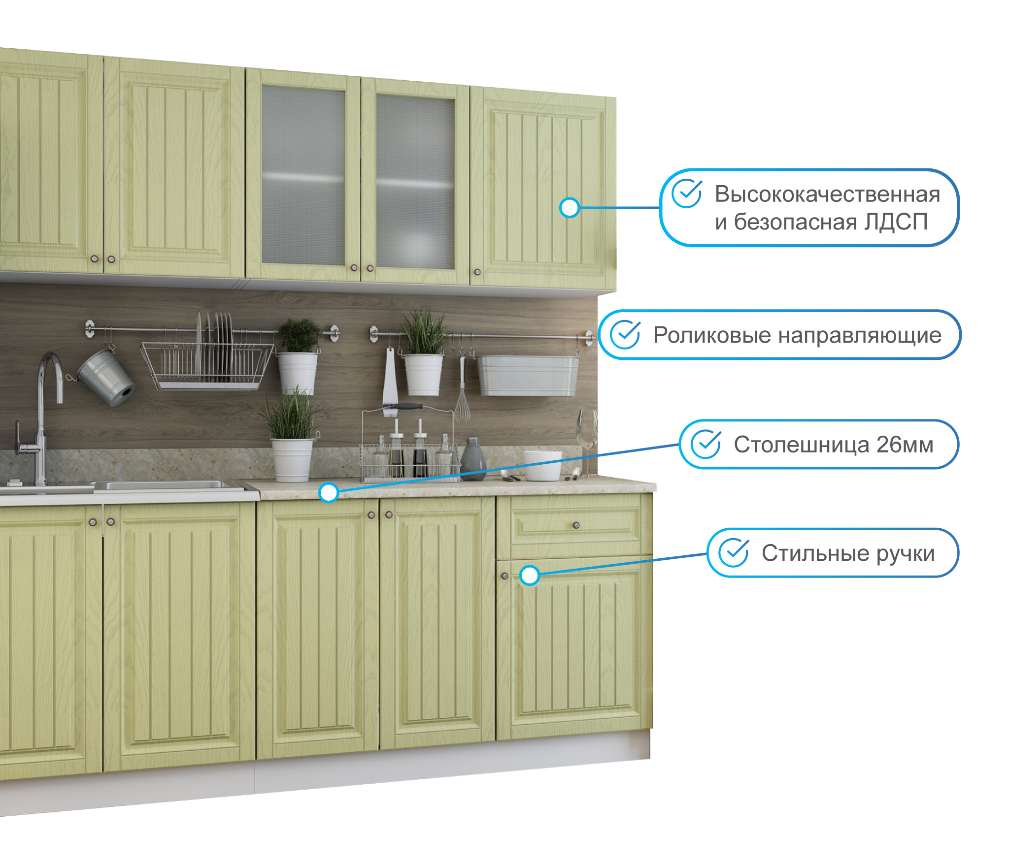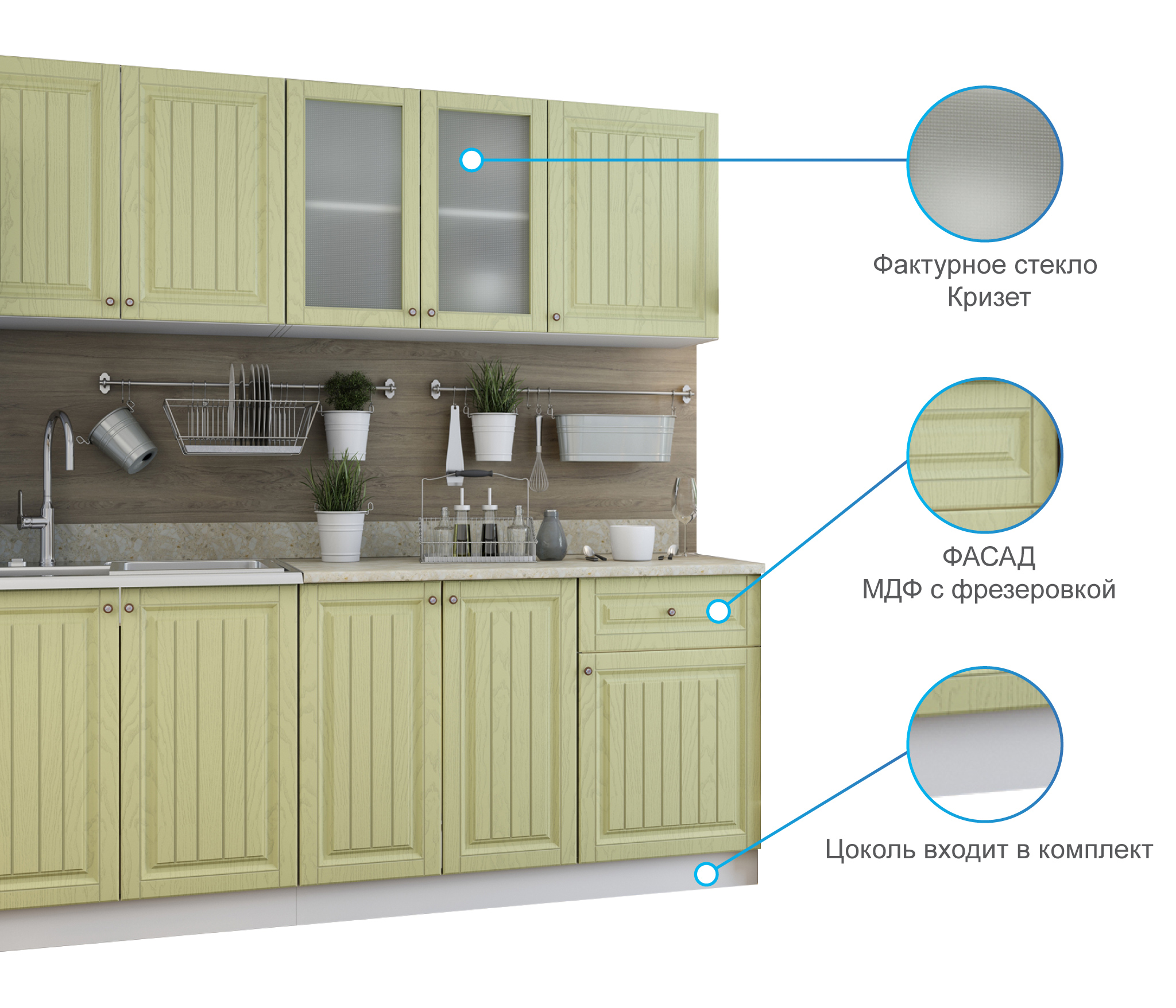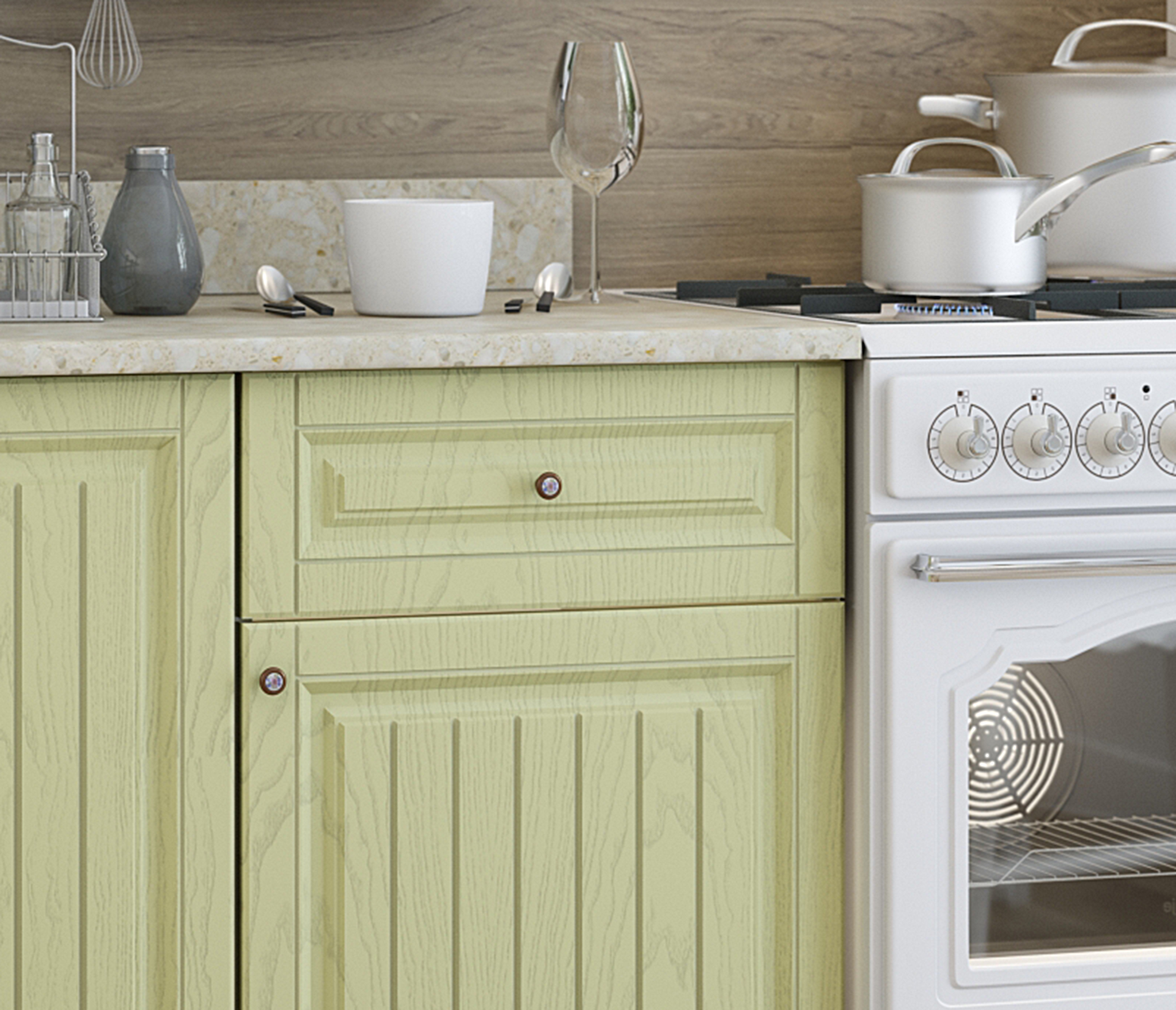 В реальности кухня оказалась лучше, чем я ожидала: фасады из МДФ с эффектом окрашивания эмалью, и цвет очень приятный, ближе к светлому оливковому, желтизны как у фисташки нет. К Провансу очень подошла. Заказала 2-х метровую, и уверена была, судя по фото, что она трехсекционная. Оказалось, что это два шкафа: 120 и 80 см. Такие же наверху. Поэтому на угол поставить не получилось. Но поскольку очень подошла по стилю, решила оставить. Столешница только на стол 120 см. Так что мойка только накладная. Дозаказывала другую единую столешницу и врезала мойку. Пишу так подробно, потому что сама столкнулась с этими проблемами. Глубина шкафов 40(!) см, так что сзади кухни 20 см неиспользованного пространства. Сборку заказывала на фабрике, привезли битые стекла, сам сборщик открыл рекламацию. Если собираете сами, с рекламацией будут проблемы. Стекла заменили через неделю. Сборка средняя, не без огрехов, но в целом норм. Общее впечатление от кухни хорошее, звезды сняла за указанные недостатки. Сушки для посуды нет, полки в этом шкафу тоже.