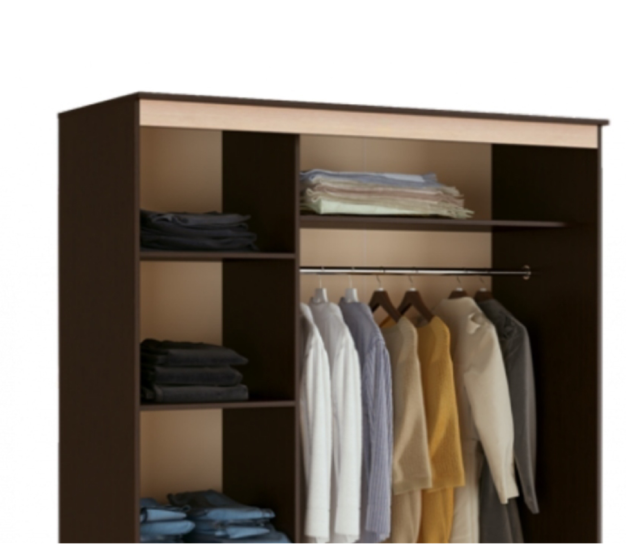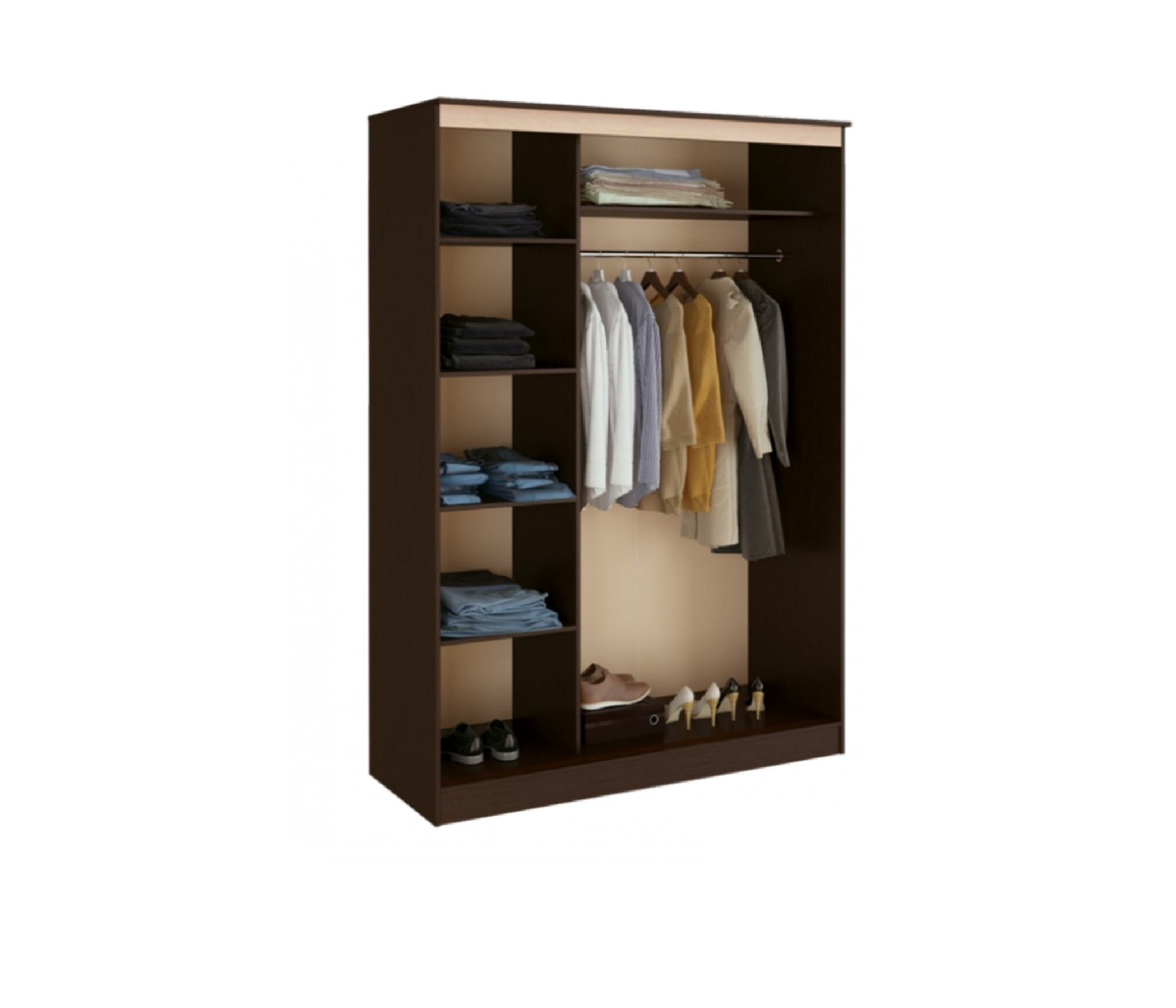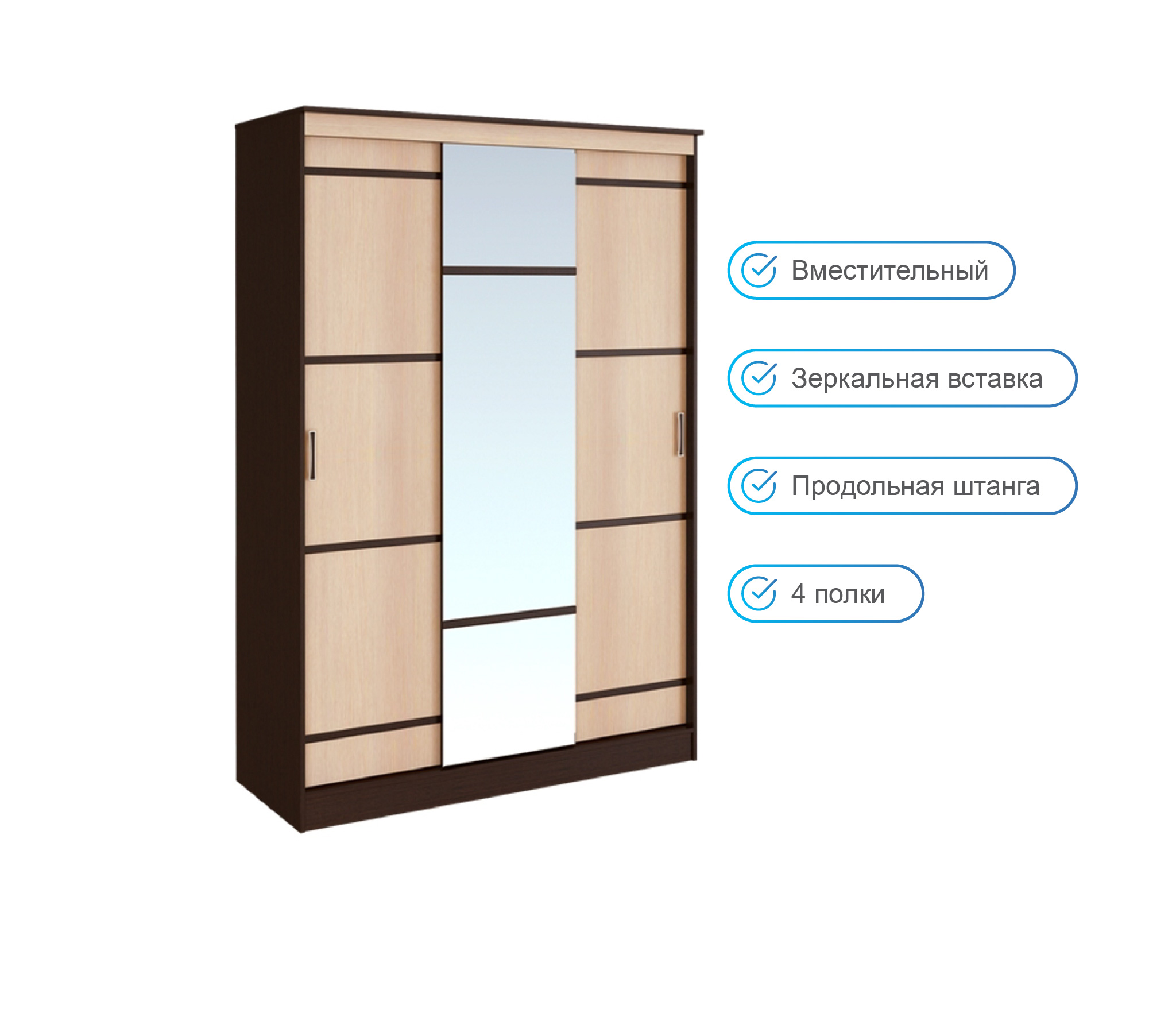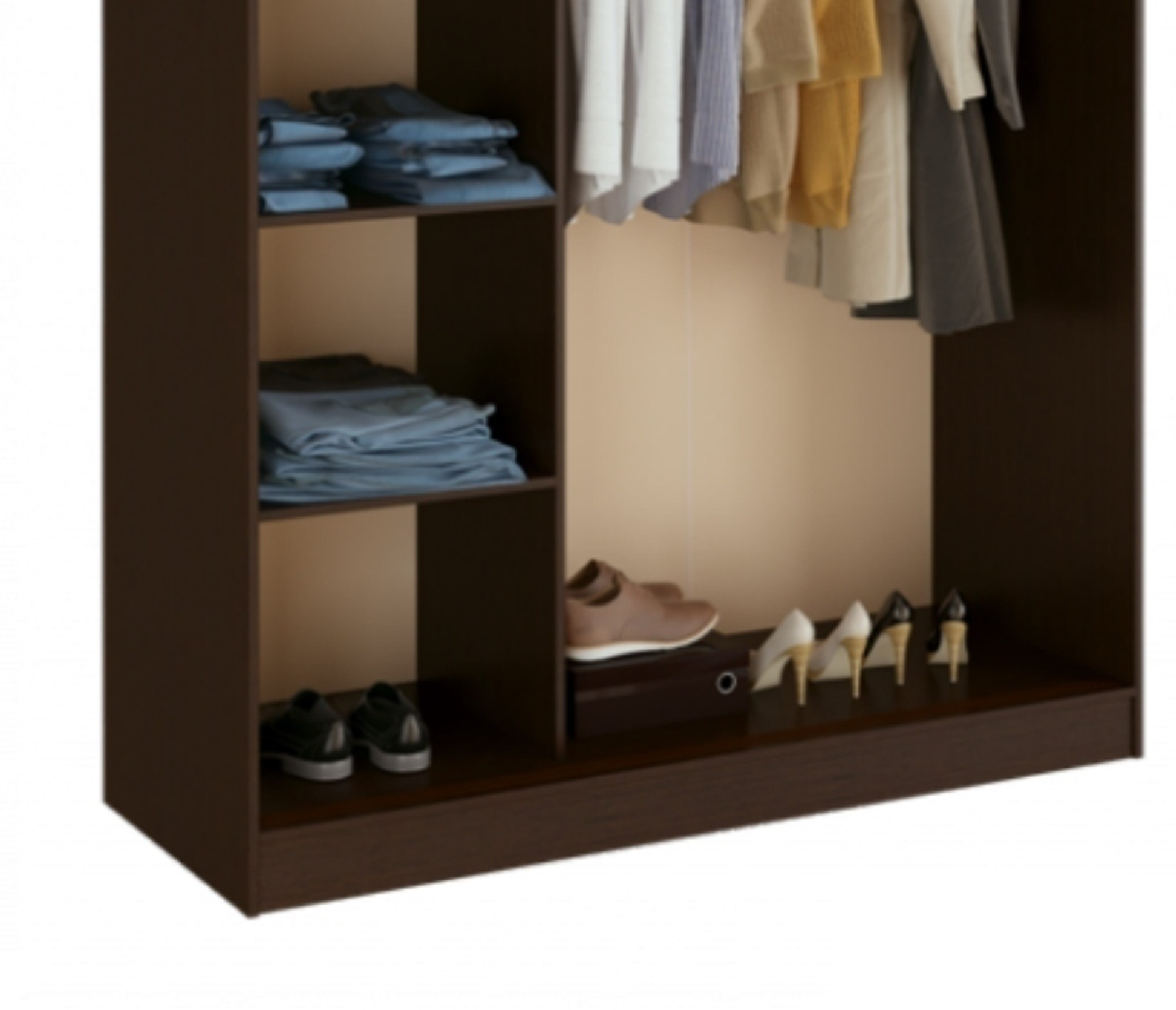 Очень приличный шкаф, хорошо смотрится. Но есть одна недоработка - отделение с полками шире, чем дверь. Соответственно, при полностью отодвинутой двери небольшая часть отделения с полками остается закрытой. Этот конструктивный дефект не мешает пользоваться шкафом. За такую цену - отличный шкаф.