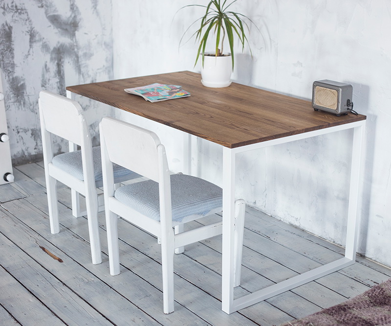 Каркас: профильная труба 20х40 мм.Прочное полимерно-порошковое покрытие черного, белого и серого цвета Дерево: массив сосны 28 мм, покрытое специальным маслом для мебели, цвета на выбор: бесцветный, белый, серый, махагон, орех, морёный дуб, черный, клён, черный графит, голубой графит, темное золото графит, золото графит.