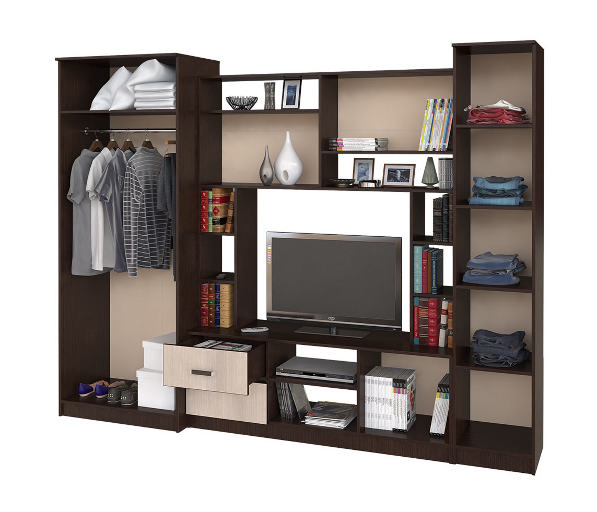 Стенка модульная, то есть три блока ( шкаф, стойка с полками и середина) все раздельные, их можно расположить в любом порядке, а также вообще отдельно друг от друга. По желанию, можно скрепить 3 блока винтами, которые также прилагаются в комплекте. В общем, товар рекомендую к приобретению