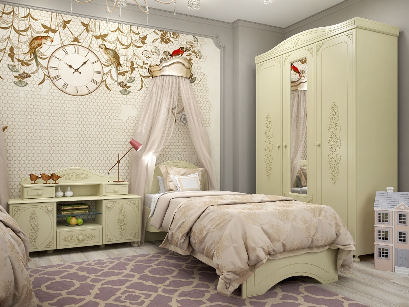 Основание кровати выполнено из фанеры. Мебель изготовлена из качественной ламинированной ДСП 16 мм. В оформлении фасадов МДФ применяется уникальная технология нанесения объемного узора (3-D).