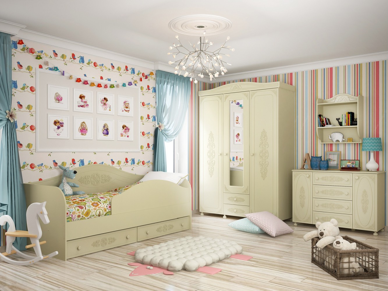 «Ассоль» - мягкий мерцающий глянец и эксклюзивный узор, повторяющийся на фасадах всех модулей идеален для создания нежного уютного интерьера спальни, гостиной, детской, прихожей.