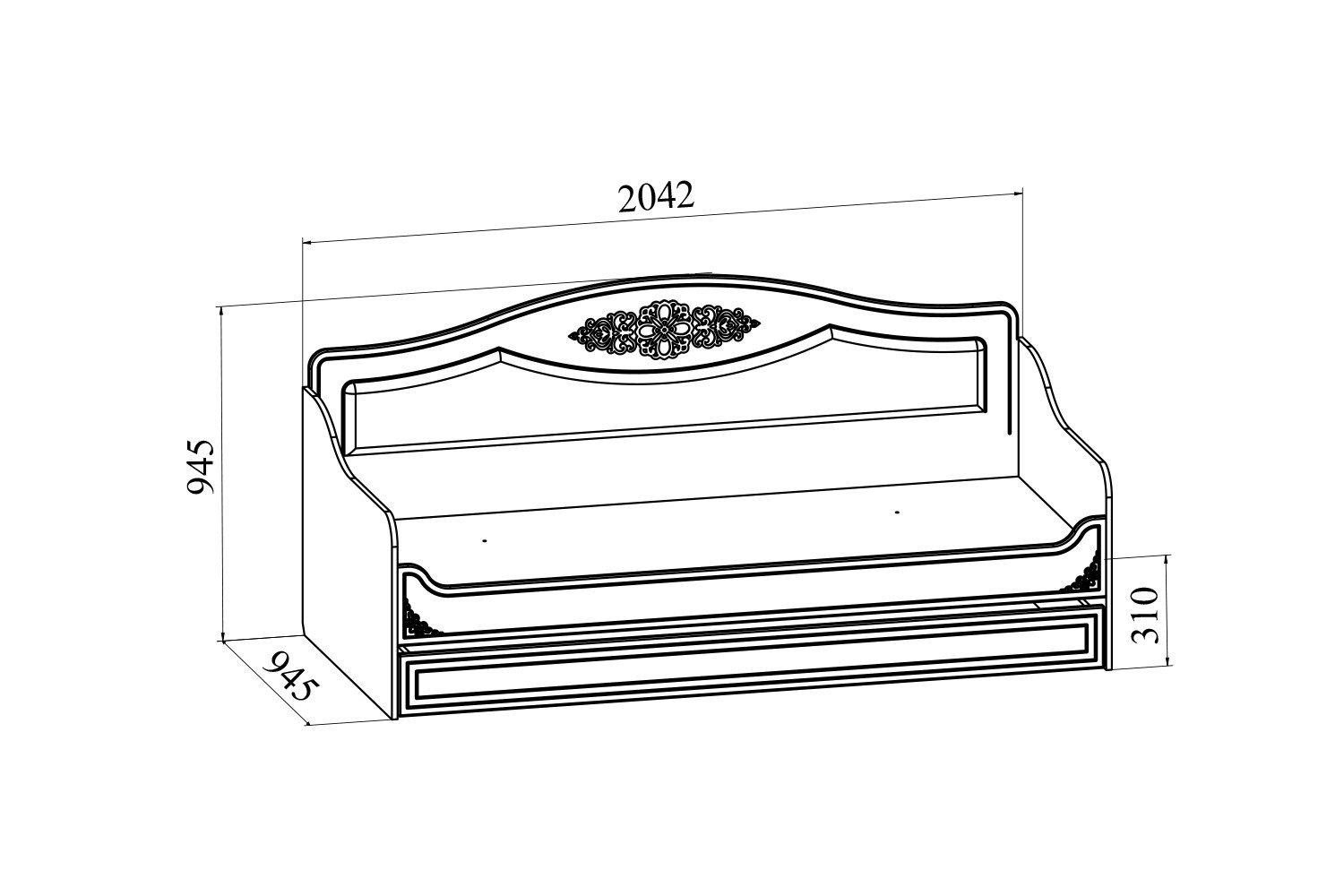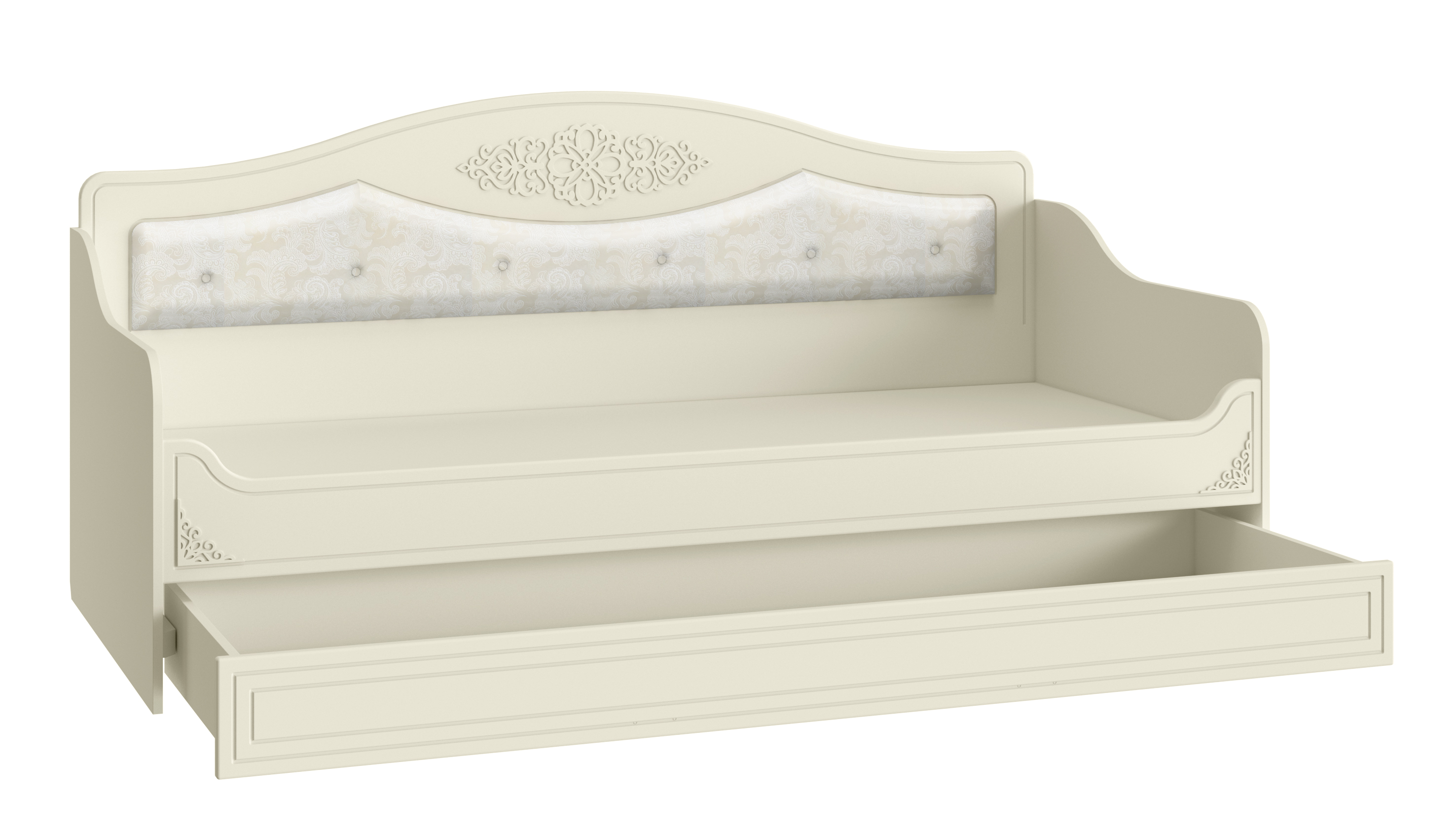 Кровать с мягкой спинкой, выдвижной ящик для белья. Основание кровати выполнено из ДСП. Мебель изготовлена из качественной ламинированной ДСП 16 мм. В оформлении фасадов МДФ применяется уникальная технология нанесения объемного узора (3-D). В цоколи встроены подпятники, предотвращающие повреждение пола.