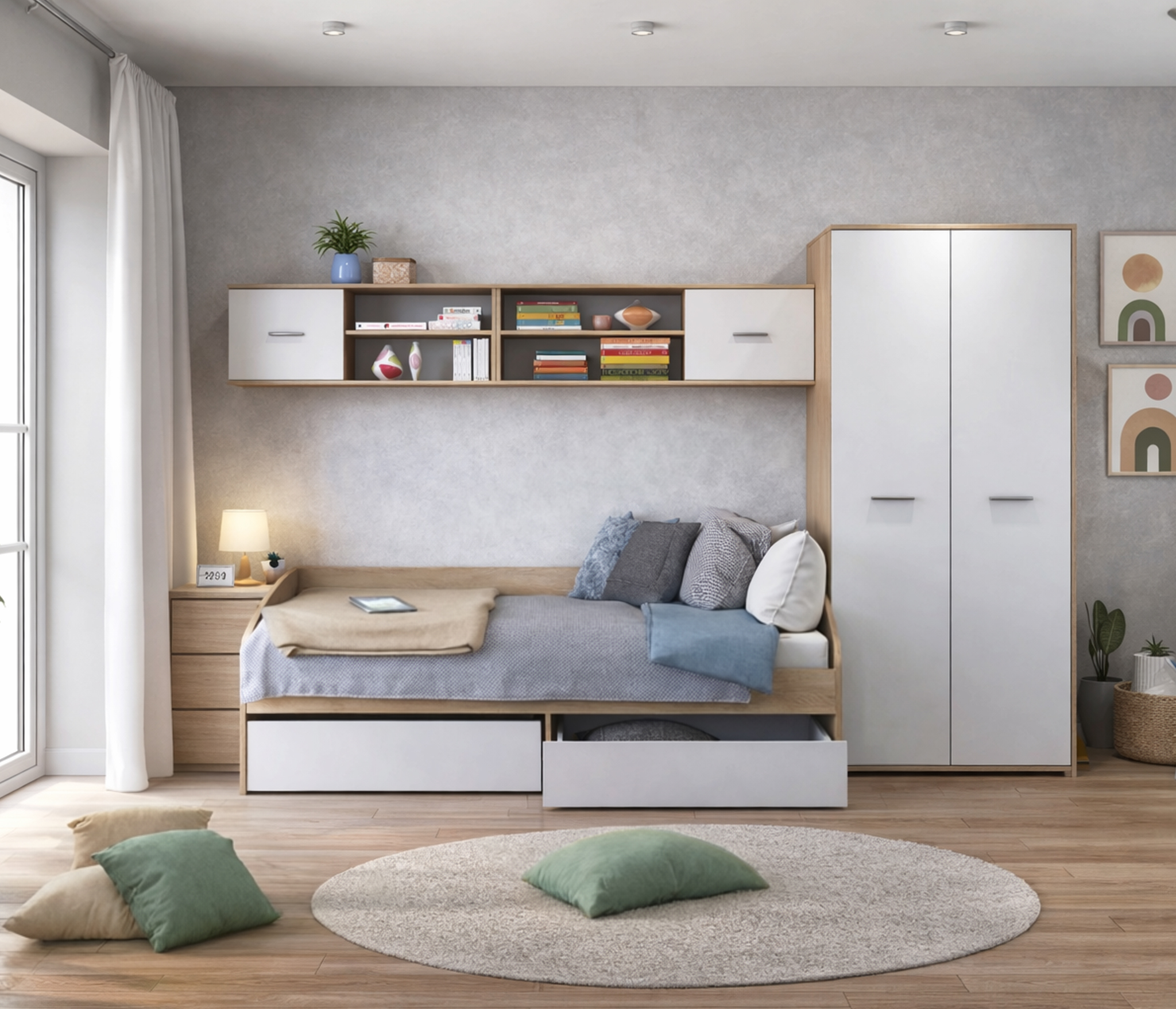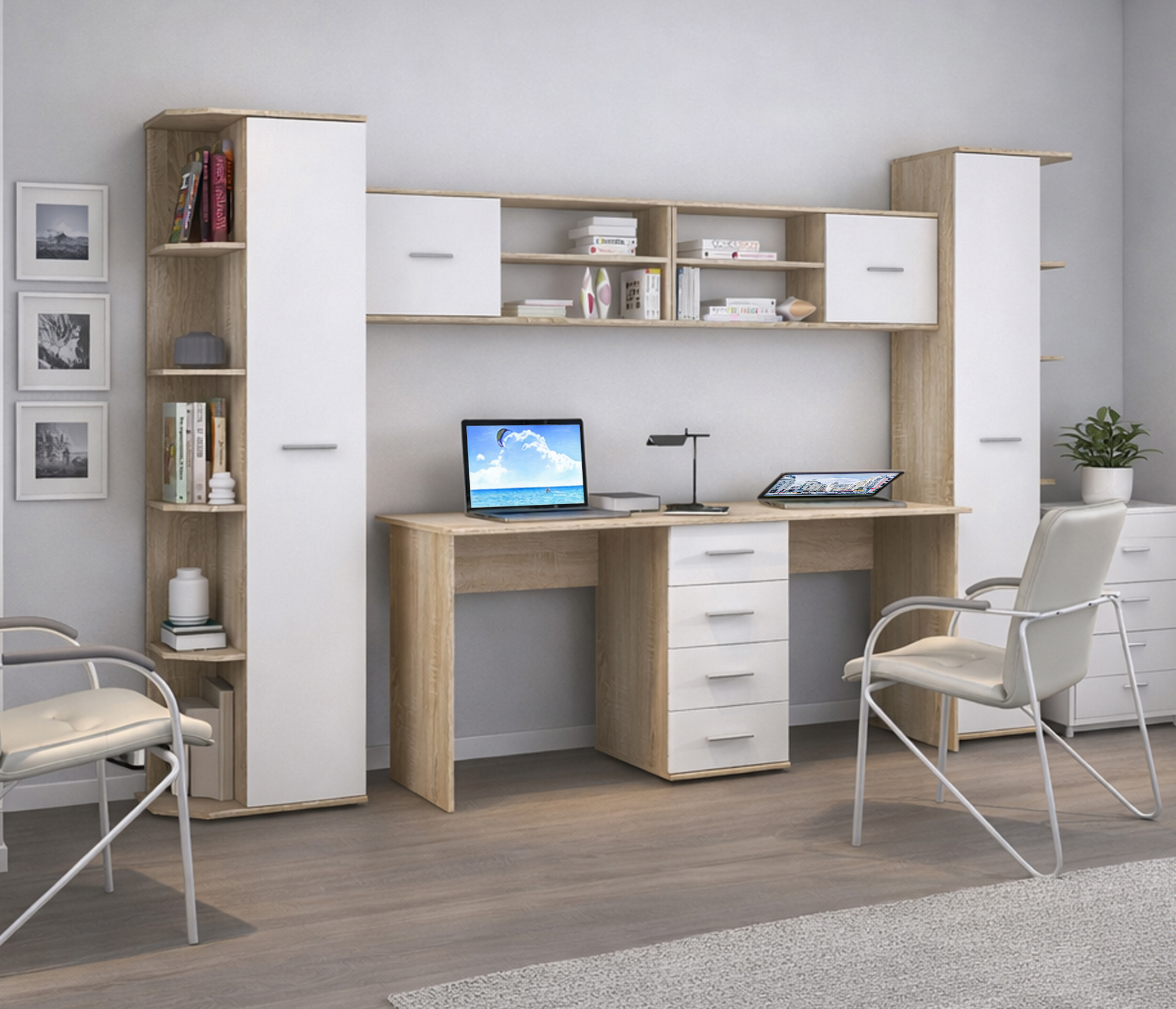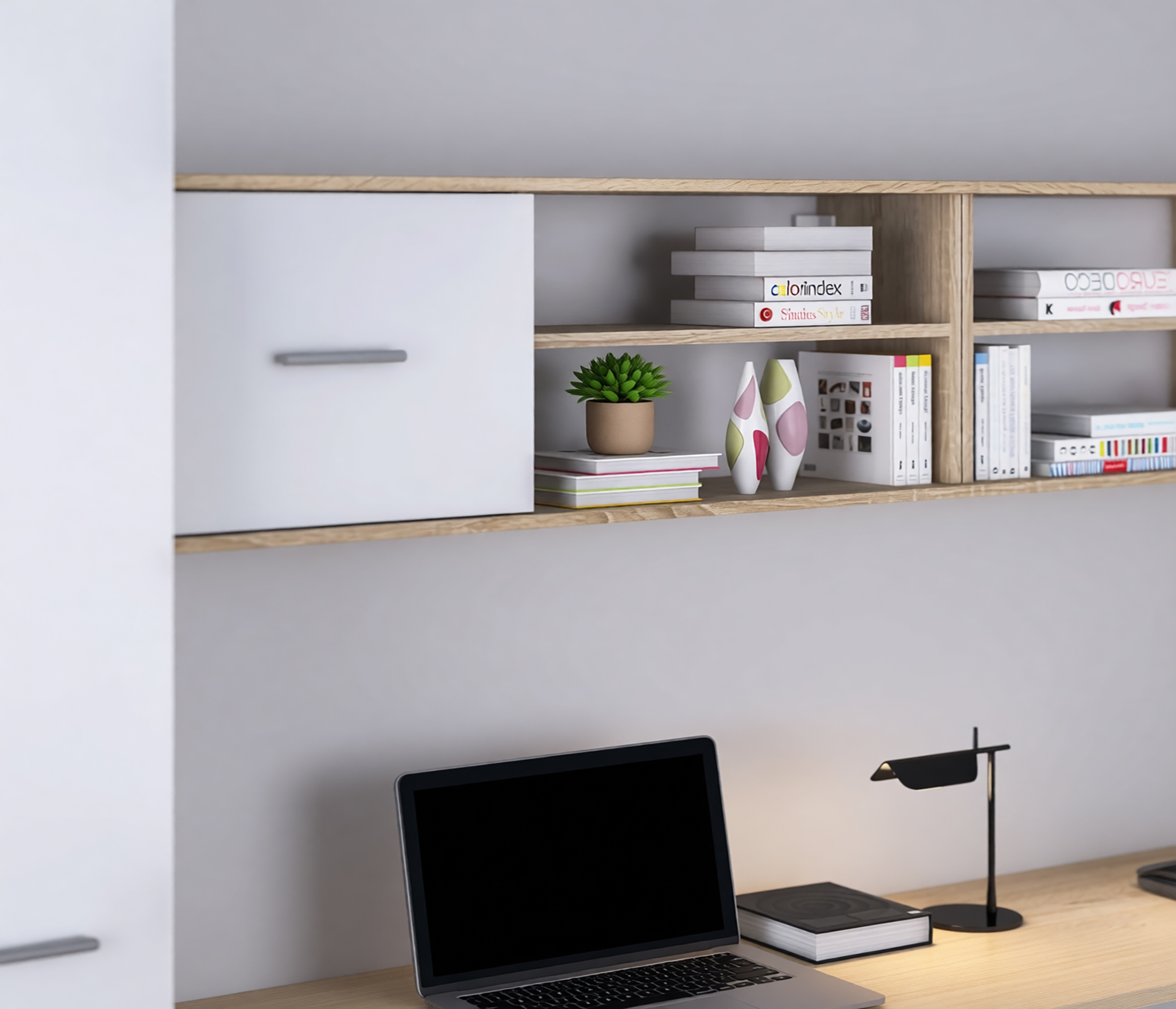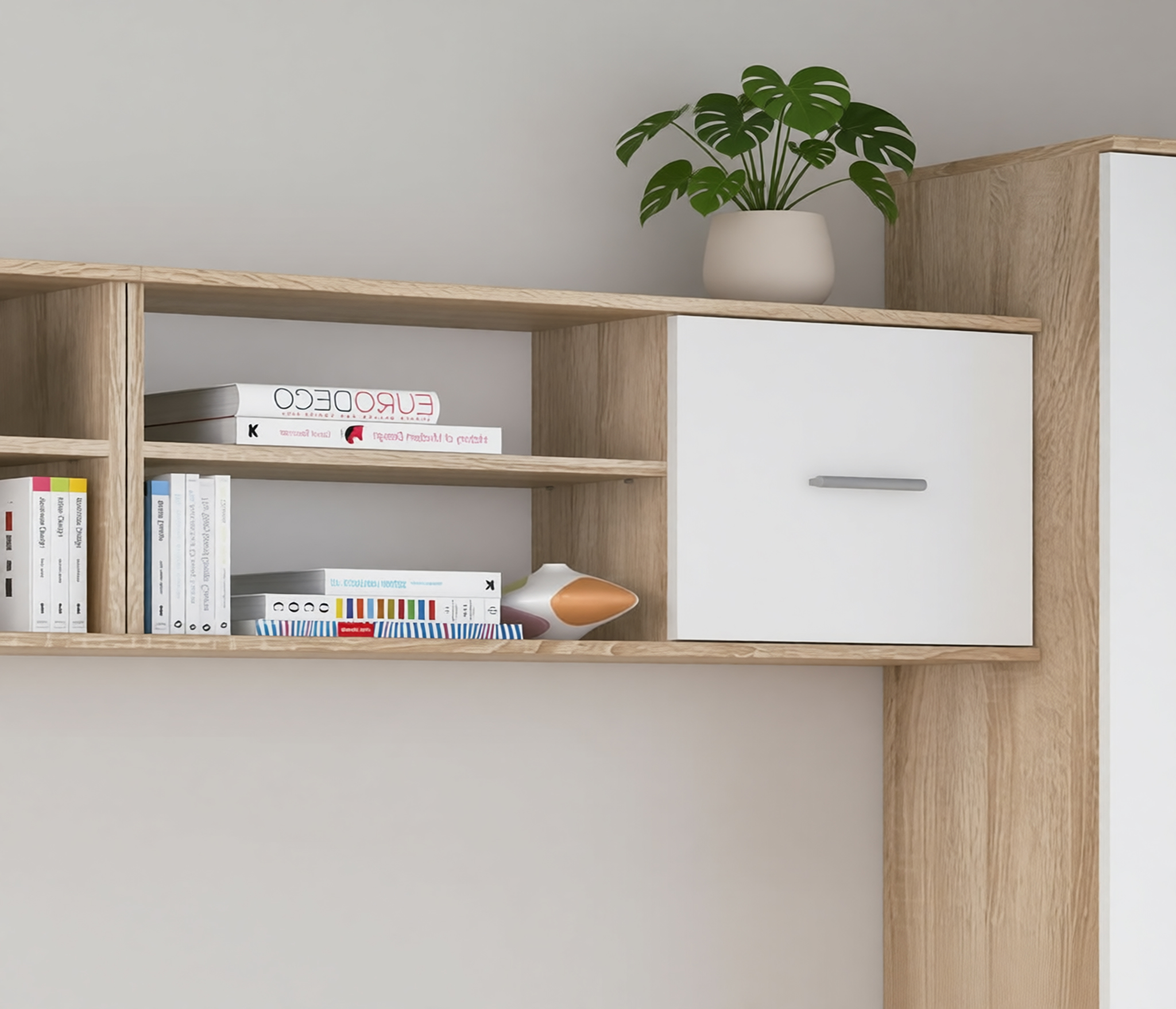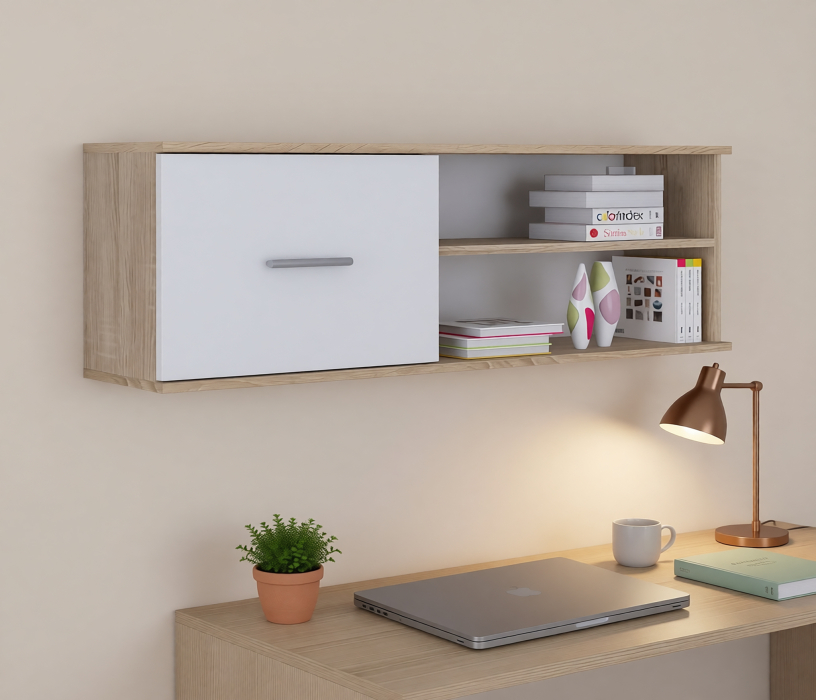 Габаритные размеры – ширина 103 см, высота 39 см и глубина 24 см. Полка состоит из двух открытых отделений, расположенных одно над другим и одного отделения за глухой дверцей.Выполнена полка из современного материала. .Полка крепится к стене при помощи дюбелей, которые входят в комплект.