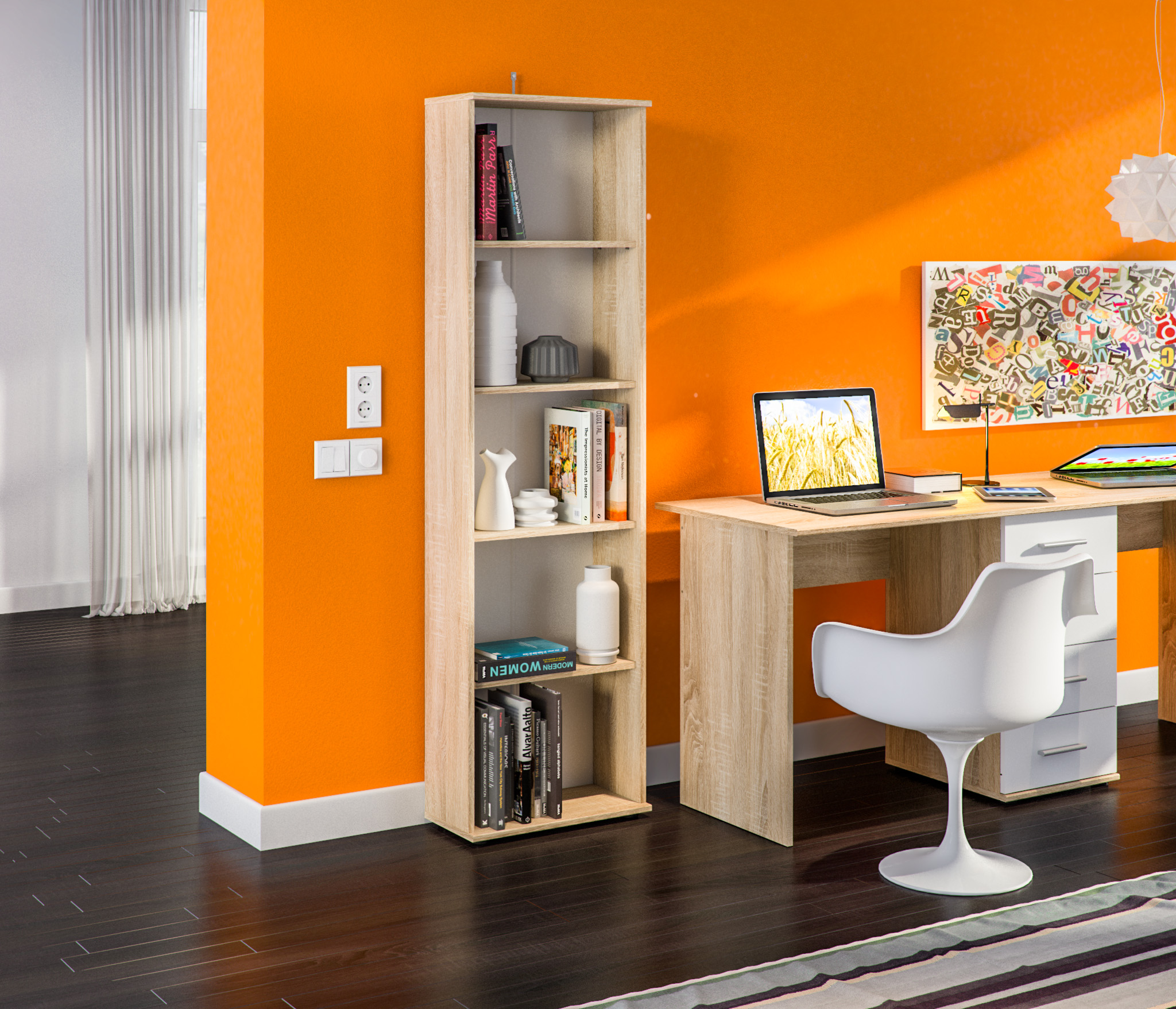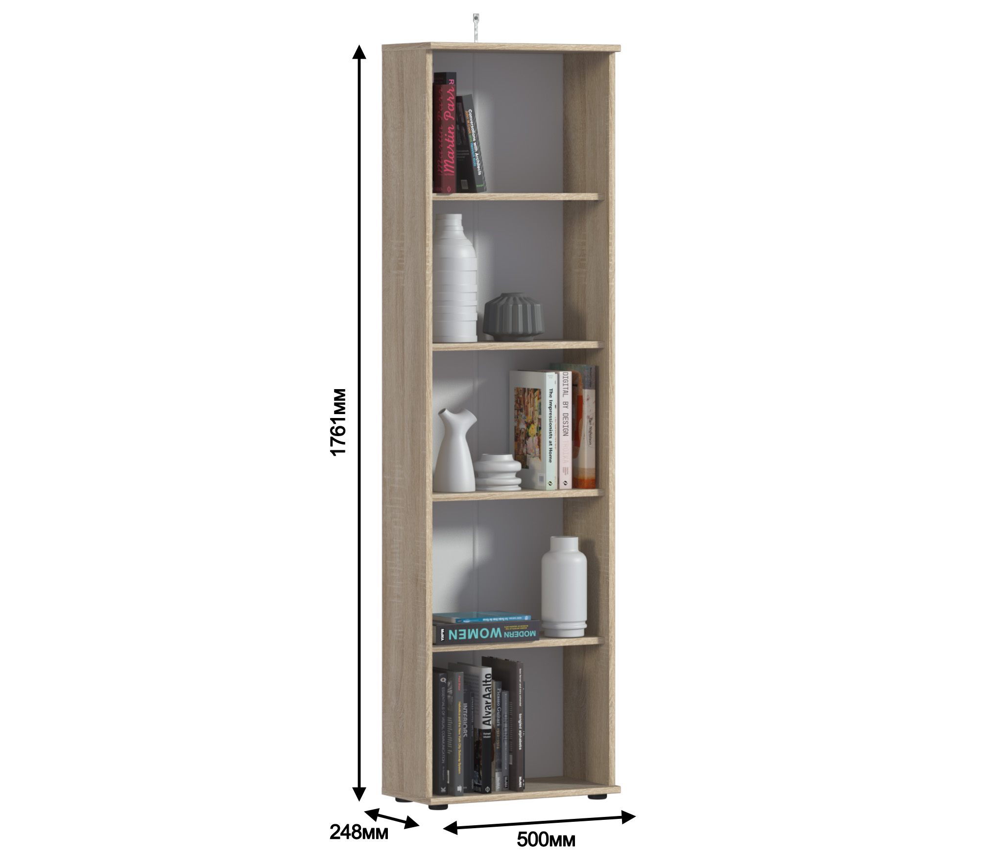Габаритные размеры – ширина 50 см, высота 176 см и глубина 24 см. На пяти открытых просторных полках можно без труда разместить книги, журналы, сувениры и множество памятных предметов.Выполнен стеллаж из прочного и современного КДСП, в приятном оттенке «Дуб Сонома».
