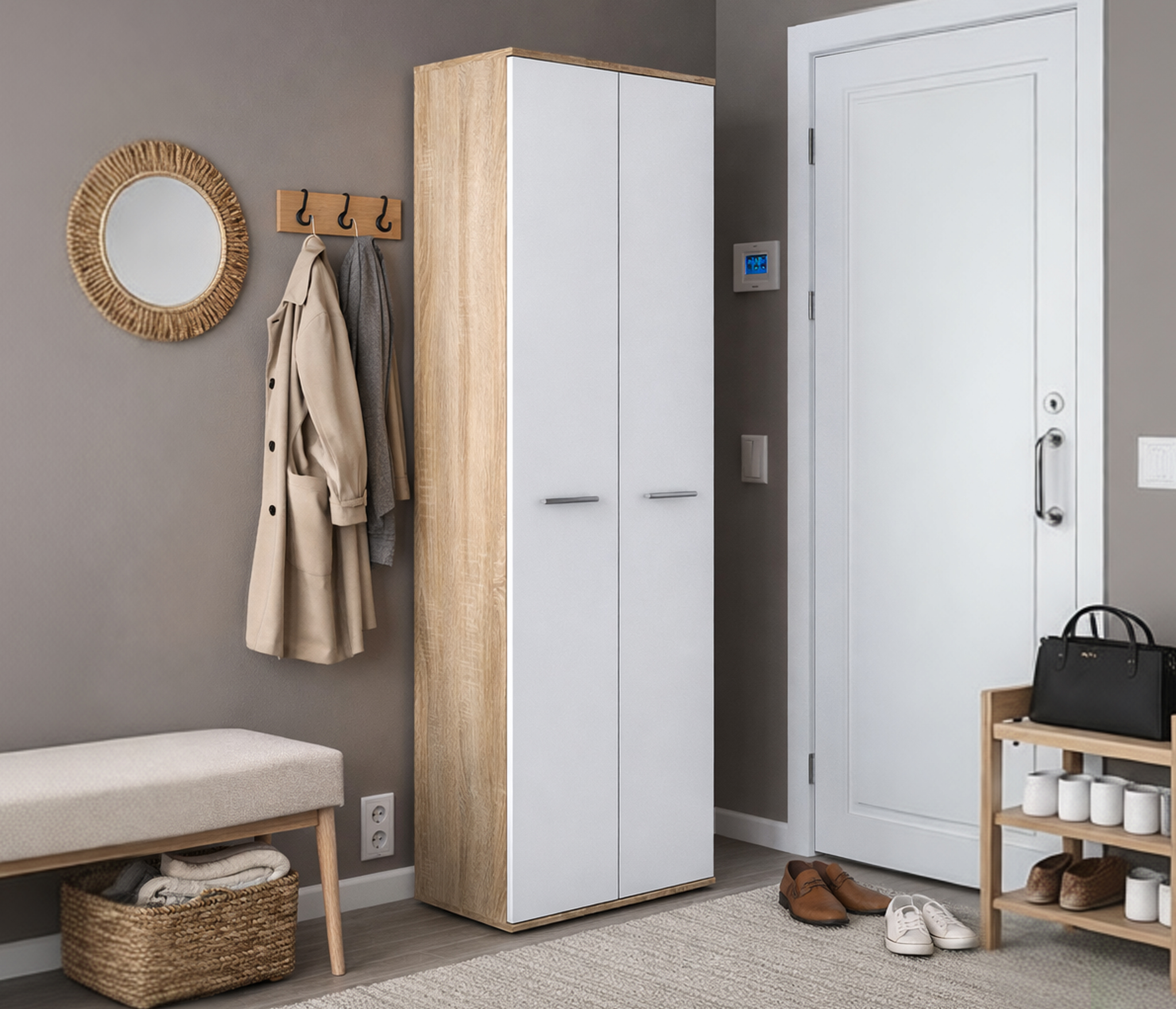Выполнен комод Мамбо из современного материала. Основной цвет отделки -- «Дуб Сонома», а фасады выдвижных ящиков имеют белое матовое покрытие.