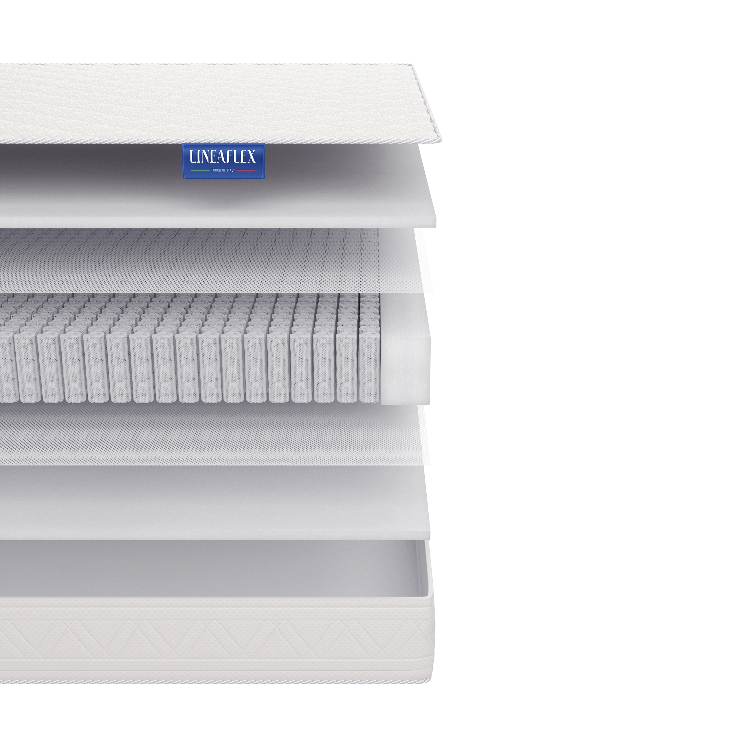 Матрас Lineaflex Manifica Lux 090x200. Ортопедический матрас на основе армированного блока независимых пружин плотностью 512 пружин на м². Матрас изготовлен по запатентованной швейцарской технологии с помощью оборудования европейского уровня. За счет этого вес пружинного блока уменьшен в два раза, а нагрузка на спальное место выше на 15%, чем у обычных матрасов. Отсутвует усадка пружин, благодаря термической обработке проволоки при 300°C. Каркас из ППУ создает боковую поддержку, защищает пружинный блок от внешних воздействий и не позволяет ему изменять местоположение внутри матраса во время нагрузок. Матрас приобретает необходимую устойчивость формы и долговечность.