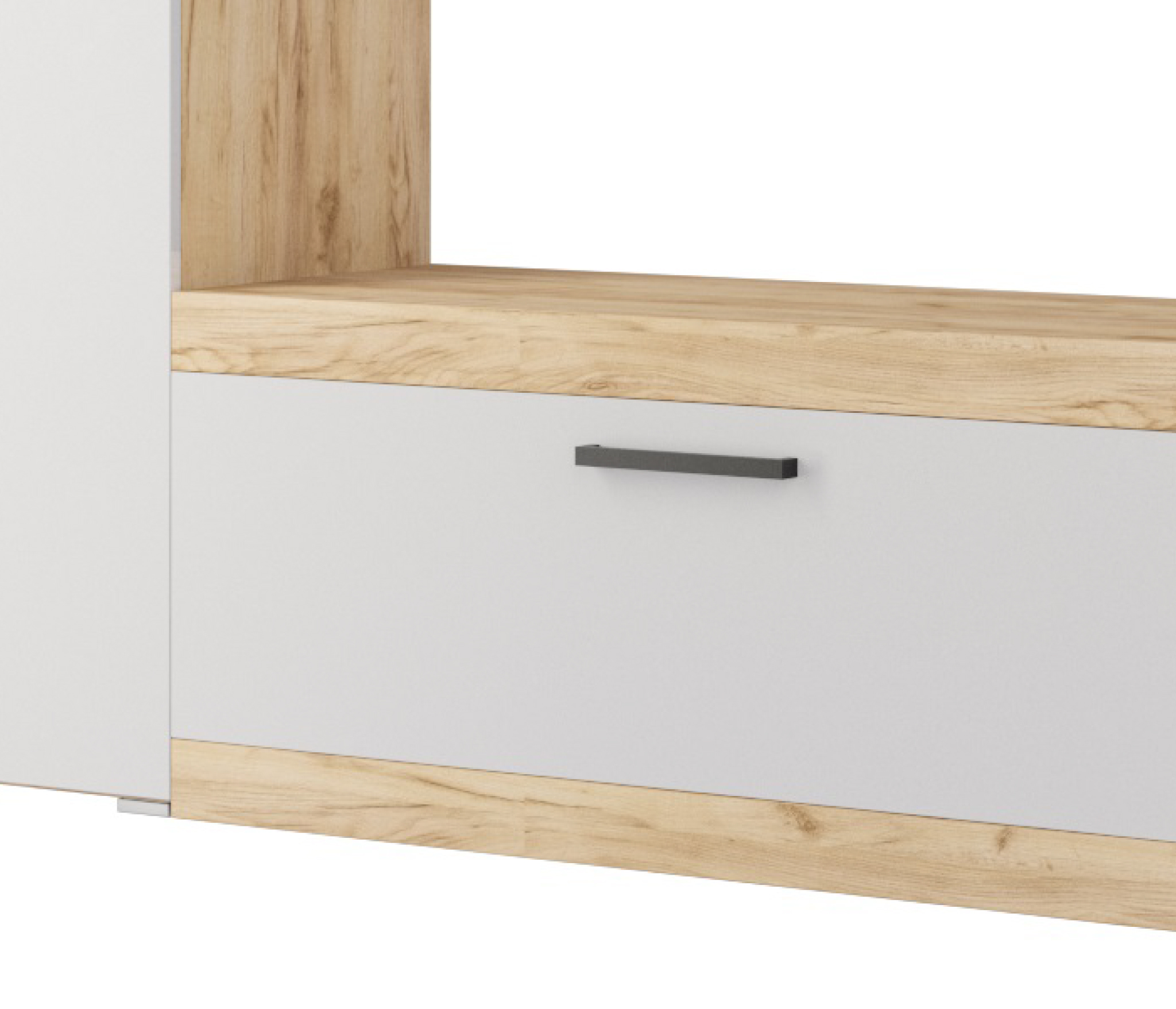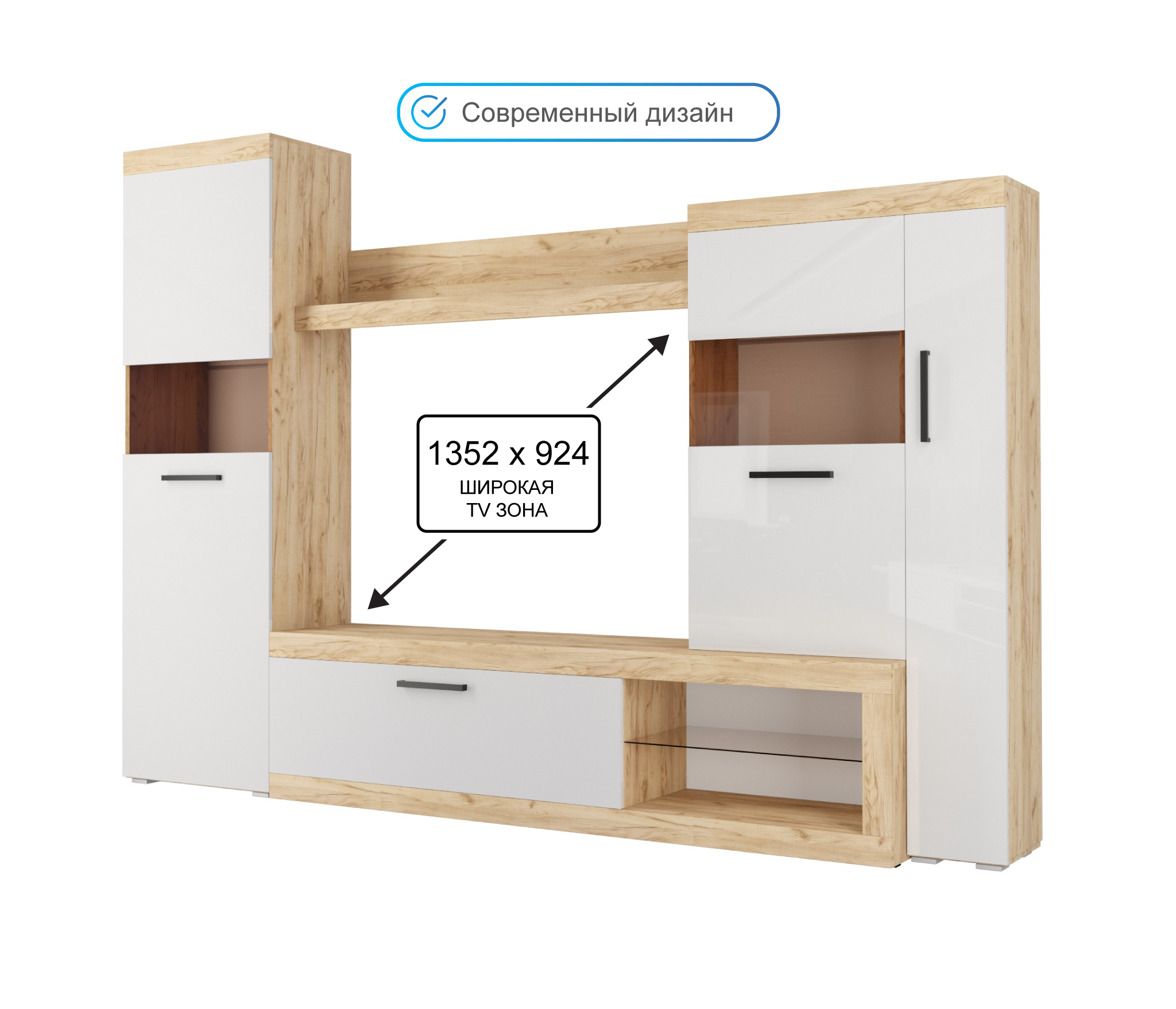 Гостиная Бастон является практичным вариантом для обустройства стильной комнаты. Открытые ниши и закрытые отделения предоставят достаточно места для размещения абсолютно всех вещей: посуды, книг и предметов декора. Для телевизора предназначена широкая зона по центру. Сочетание корпуса изделия в древесных оттенках и глянцевых фасадов со вставками из стекла делают мебель яркой и современной.