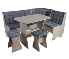 Удобная, эргономичная скамья кухонного уголка для стильной кухни. Мягкие элементы прошиты прочной тканевой полосой. В угловой части полка. Размеры скамьи: 1180x1620х820 глубина 540 мм. Материал - ЛДСП/ткань.Под каждым прямым сиденьем ящик для хранения. Сборка универсальная (право/лево). Отдельно приобретаются, на выбор, стол нераскладной, стол уши-ящик (раскладной) и табуреты в цвете ясень шимо светлый.