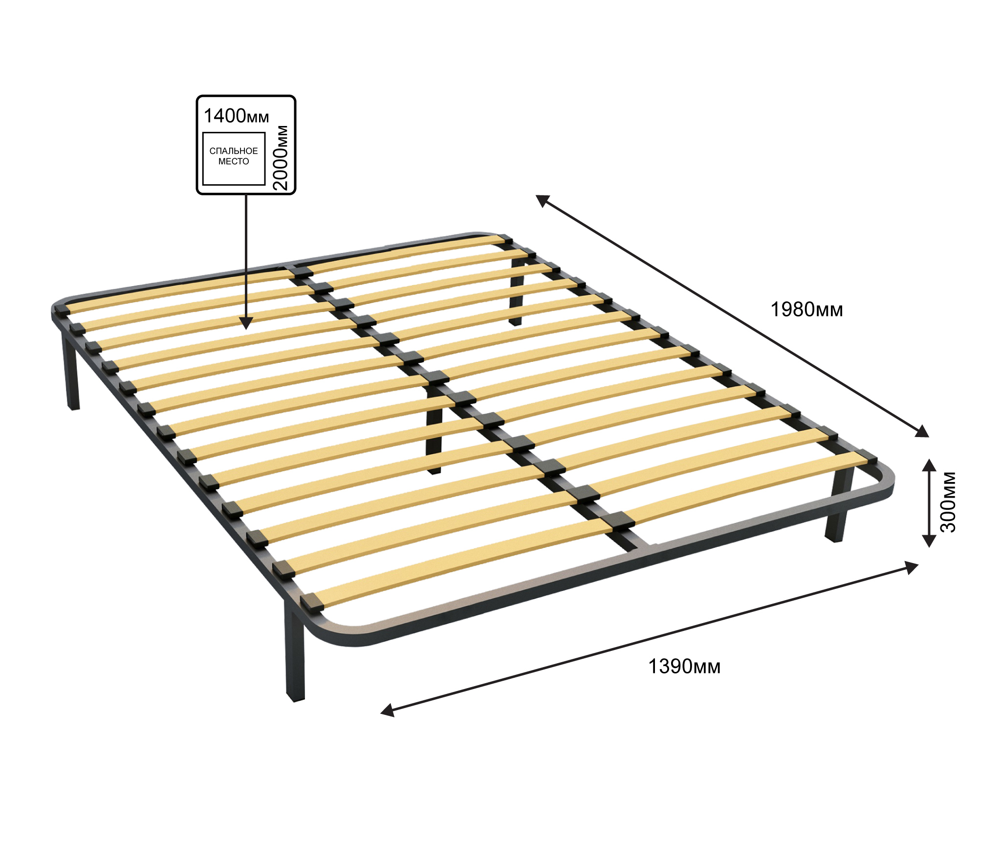 Разборное кроватное основание выполнено из металлической трубы квадратного сечения (30х30мм) и упругих гнуто-клееных берёзовых ламелей шириной 53 мм, толщиной 8 мм.