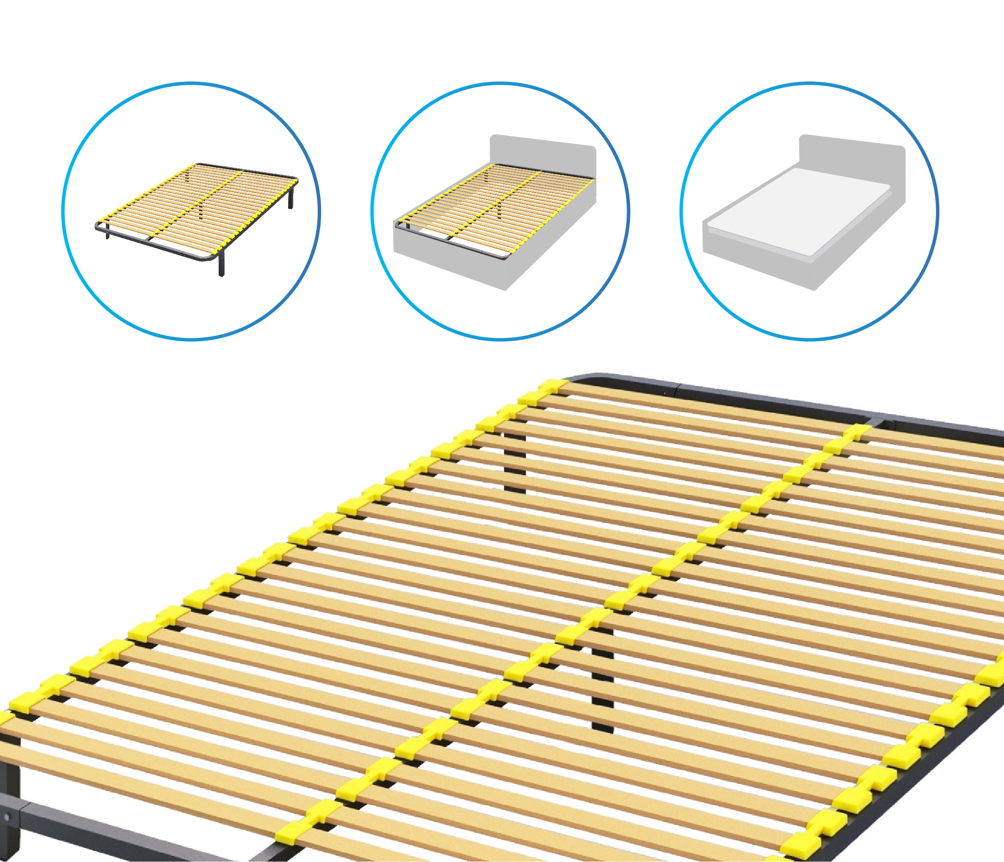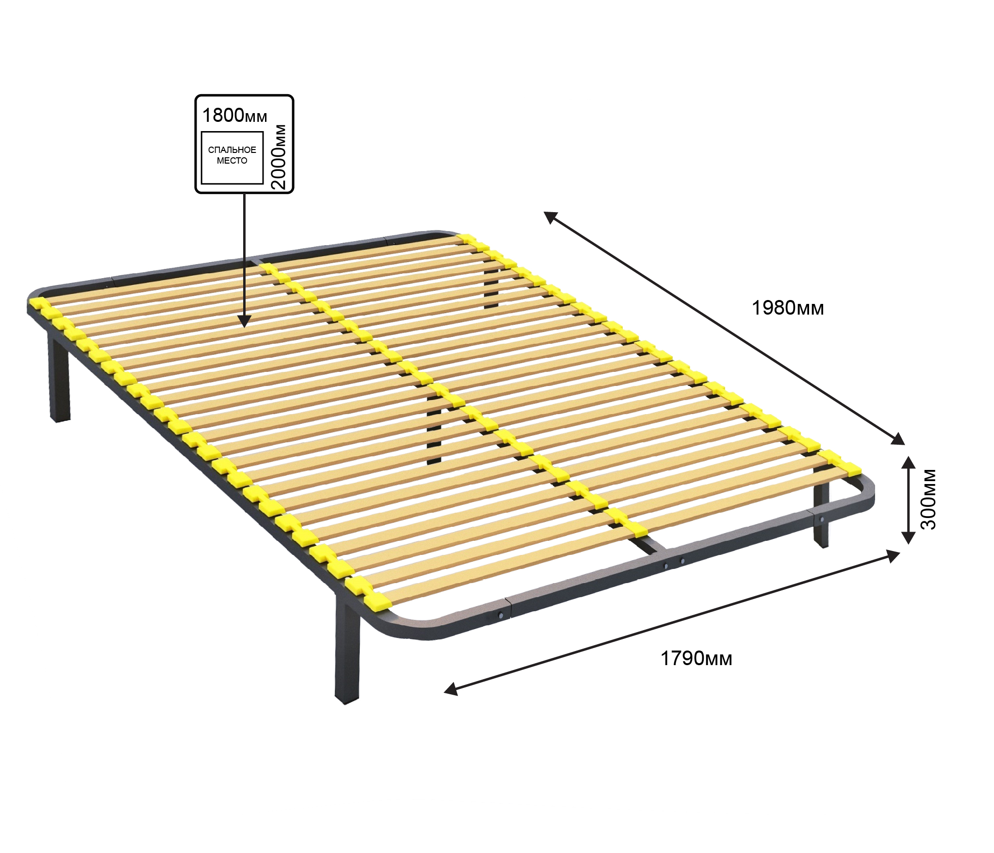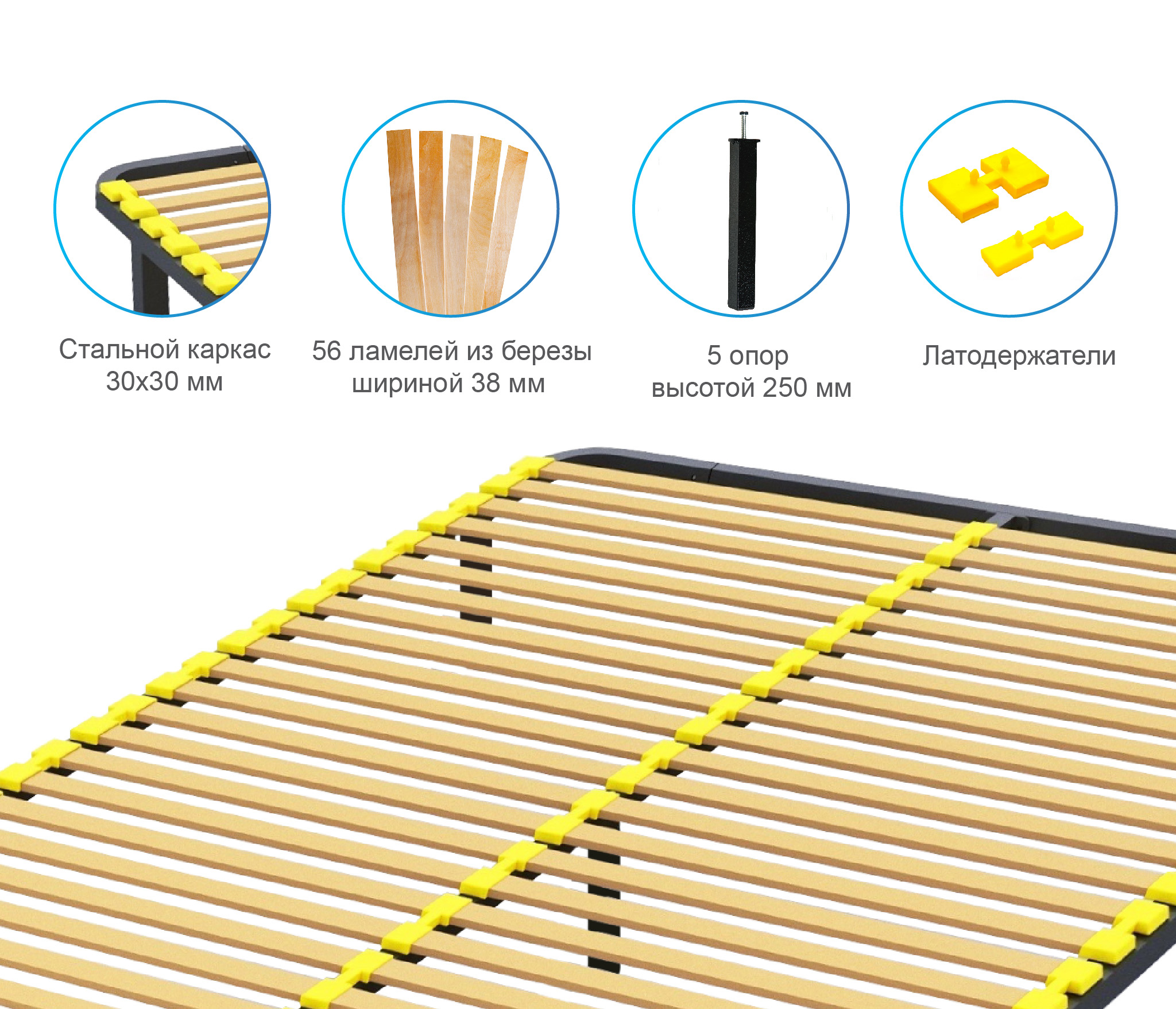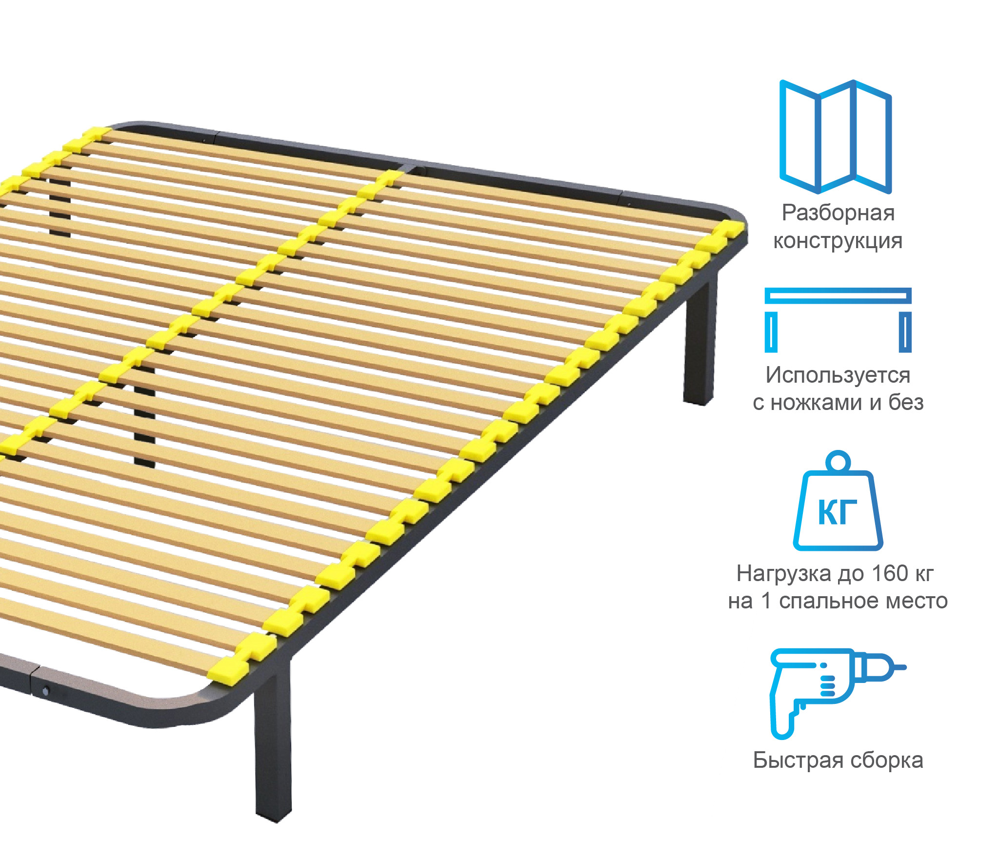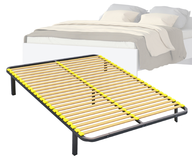 Разборное кроватное основание выполнено из металлической трубы квадратного сечения (30х30мм) и упругих гнуто-клееных берёзовых ламелей шириной 38 мм, толщиной 8 мм.