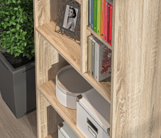 Выполнен стеллаж из современного прочного материала ЛДСП. Материал отделки цвета "Дуб Сонома", устойчив к влаге и воздействию бытовых моющих средств. Стеллаж оснащен протекторами или «лапками», которые не дают повредить пол. Для обеспечения максимальной устойчивости стеллаж надежно крепится к стене. Все необходимые крепёжные элементы входят в комплект.