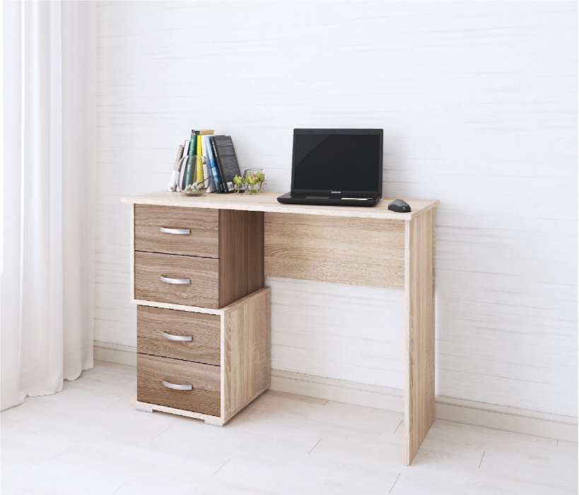 Ищете недорогой письменный стол необычной формы? Обратите внимание на модель Сити-2. Несмотря на популярный декор дуб крафт золотой/белый, стол отличается от аналогов конструкцией встроенной тумбы с ящиками. Вы сможете организовать не только функциональное и комфортное для ежедневной работы, но и визуально привлекательное рабочее место. Четыре выдвижных ящика оснащены роликовыми направляющими. Ручки пластиковые цвета "металлик".