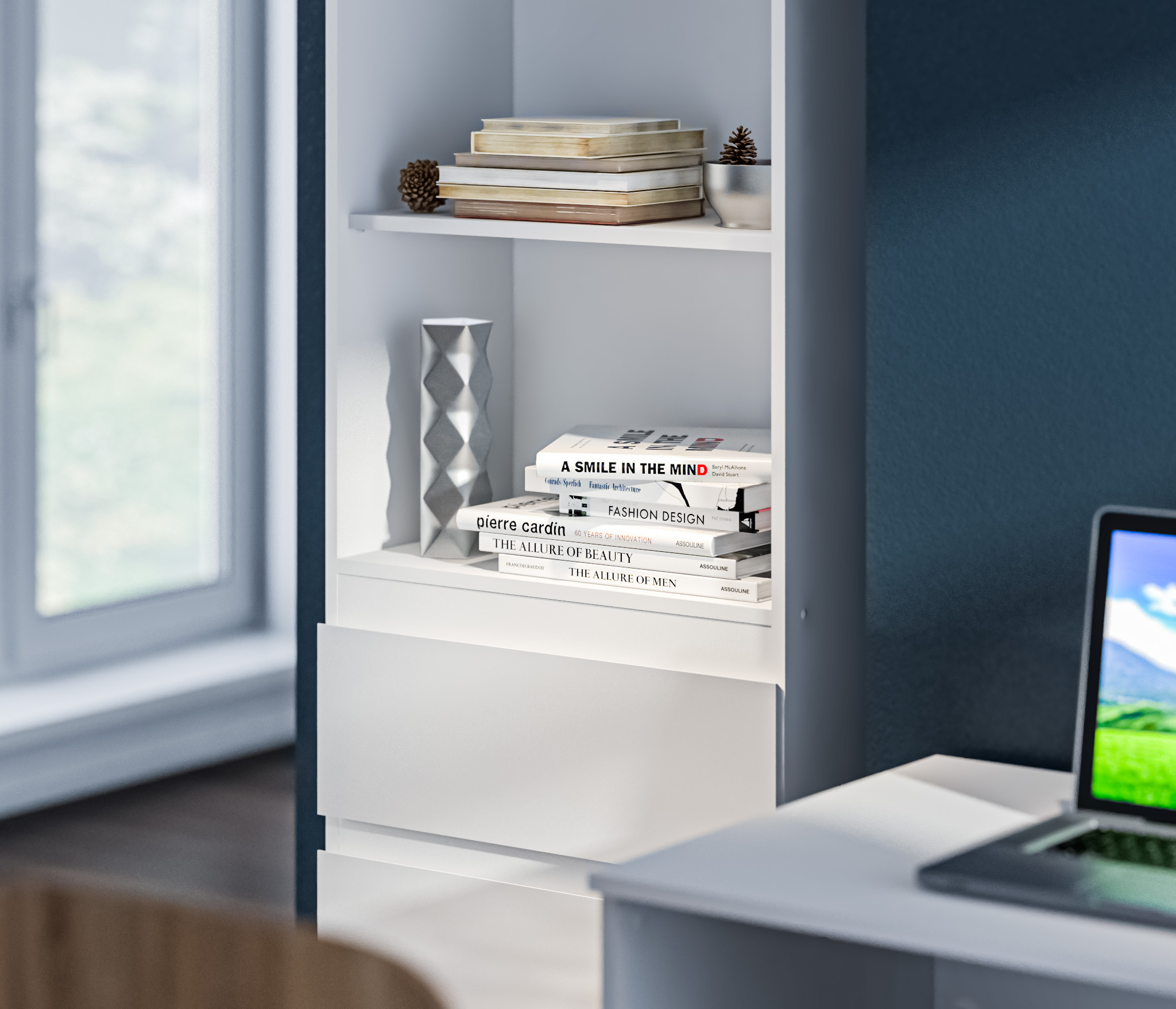 Габаритные размеры – ширина 60 см, высота 200 см и глубина 35 см. Конструктивно стеллаж состоит из трех вместительных открытых полок и расположенных под ними трех закрытых выдвижных ящиков.