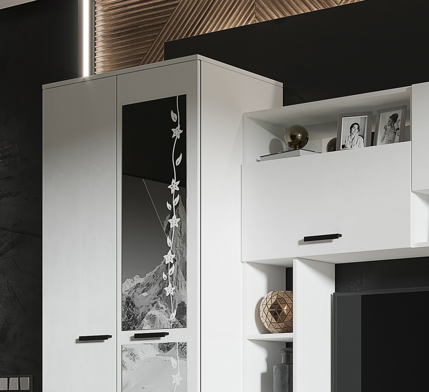 со шкафом, С гравировка, Стекло, С полками, С ТВ тумбой , с витриной