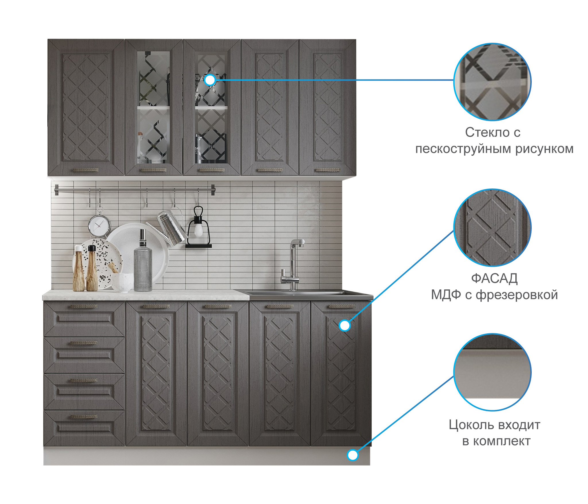 Высота нижних модулей указана с учетом столешницы, кроме модуля М600 под мойку. Мойка в комплект не входит и приобретается отдельно.