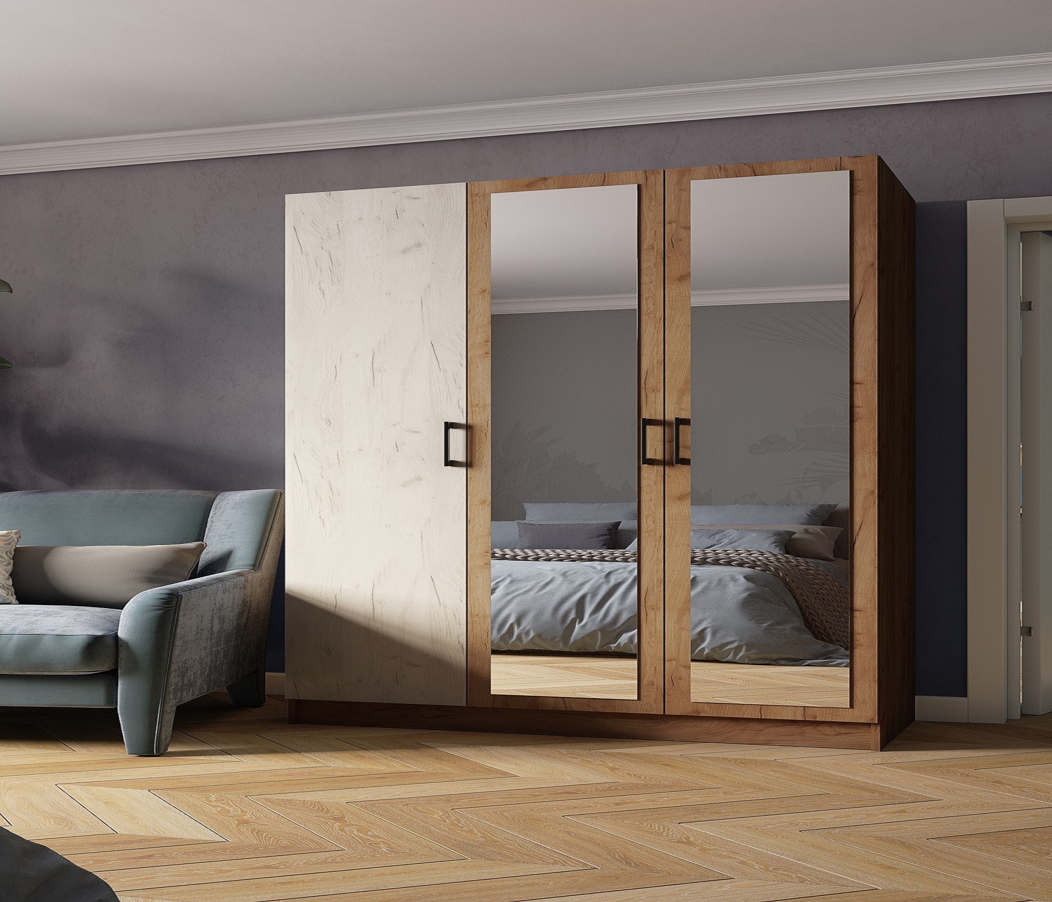 Грамотно разместить все вещи в спальне, не загромождая пространство, поможет шкаф из коллекции Лофт. Модель комплектуется створками разной ширины: по краям створки шириной 413 мм, средняя створка — 328 мм. Шкаф разделен вертикальной перегородкой на две секции: бельевую и платяную. В левой бельевой секции располагаются 2 съемных и 1 стационарная полки. В правой платяной секции - стационарная полка вверху и металлическая штанга. В комплектацию шкафа входят два зеркала 200х901 мм, которые по Вашему желанию приклеиваются на центральную створку при сборке.