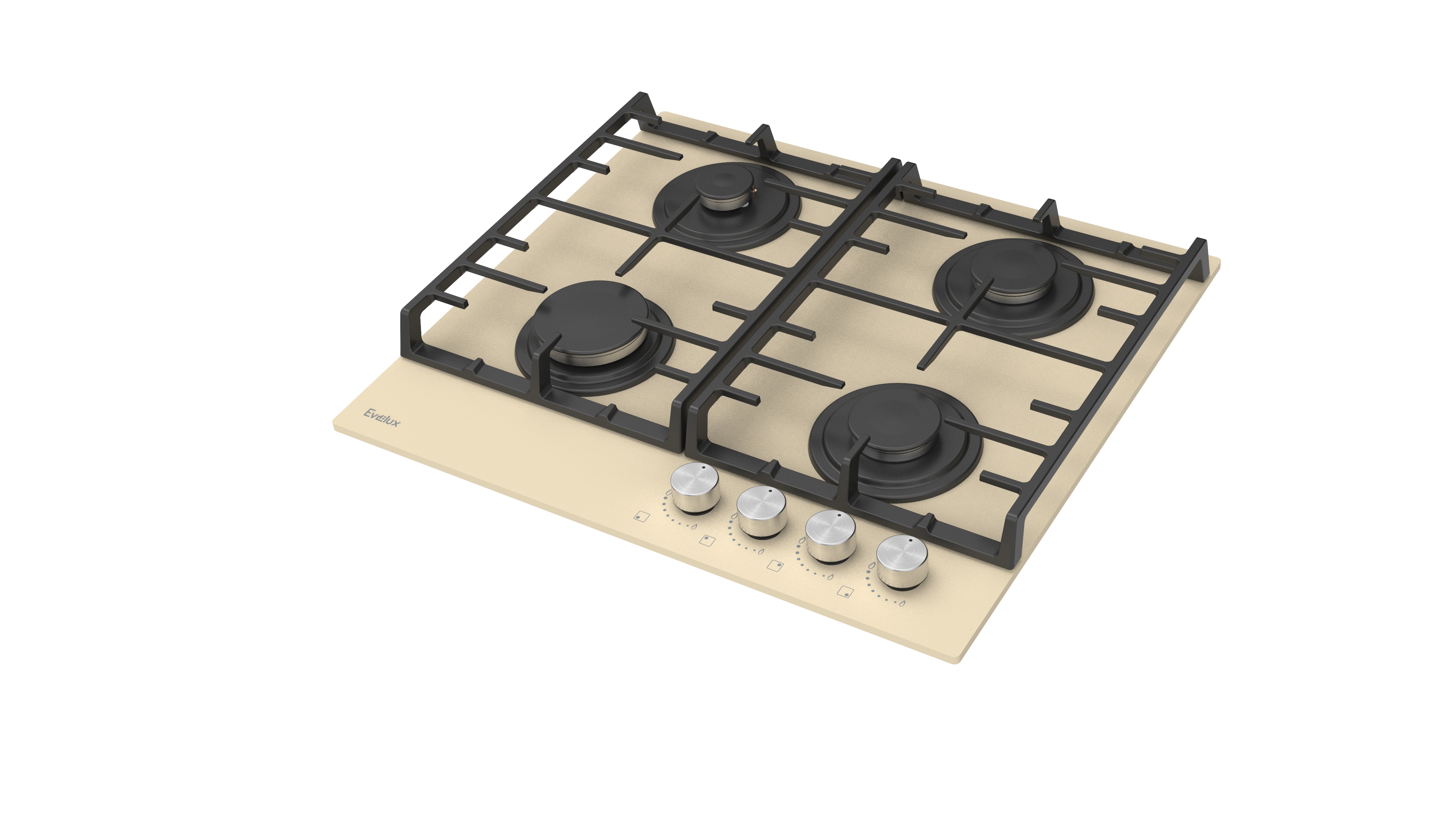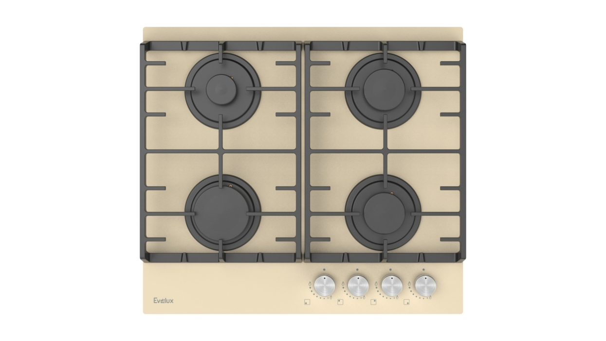 Варочная панель газовая, 60 см, 4 конфорки: экономичная конфорка (0,9 кВт), 2 стандартных конфорки (2х1,7 кВт), экспресс-конфорка (2,9 кВт), электроподжиг, бежевое высокопрочное закаленное стекло, чугунные решетки, поворотные переключатели, комплект форсунок-переходников на балонный газ, 590х515х120 мм.